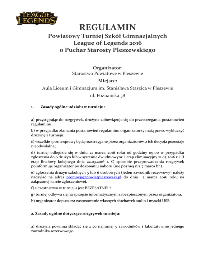 REGULAMIN Powiatowy Turniej Szkół Gimnazjalnych League of Legends 2016 o Puchar Starosty Pleszewskiego Organizator: Starostwo Powiatowe w Pleszewie Miejsce: Aula Liceum i Gimnazjum im. Stanisława Staszica w Pleszewie ul. Poznańska 38 1. Zasady ogólne udziału w turnieju: a) przystępując do rozgrywek, drużyna zobowiązuje się do przestrzegania postanowień regulaminu; b) w przypadku złamania postanowień regulaminu organizatorzy mają prawo wykluczyć drużynę z turnieju; c) wszelkie sporne sprawy będą rozstrzygane przez organizatorów, a ich decyzja pozostaje nieodwołalna; d) turniej odbędzie się w dniu 21 marca 2016 roku od godziny 09:00 w przypadku zgłoszenia do 6 drużyn lub w systemie dwudniowym: I etap eliminacyjny 21.03.2016 r. i II etap finałowy kolejnego dnia 22.03.2016 r. O sposobie przeprowadzenia rozgrywek poinformuje organizator po dokonaniu naboru (nie później niż 7 marca br.). e) zgłoszenia drużyn szkolnych 5 lub 6 osobowych (jeden zawodnik rezerwowy) należy nadsyłać na adres [email protected] do dnia 3 marca 2016 roku na załączonej karcie zgłoszeniowej. f) uczestnictwo w turnieju jest BEZPŁATNE!!! g) turniej odbywa się na sprzęcie informatycznym zabezpieczonym przez organizatora. h) organizator dopuszcza zastosowanie własnych słuchawek audio i myszki USB. 2. Zasady ogólne dotyczące rozgrywek turnieju: a) drużyna powinna składać się z co najmniej 5 zawodników i fakultatywnie jednego zawodnika rezerwowego. b) każdy zawodnik musi być uczniem zgłaszającej go szkoły gimnazjalnej i może reprezentować tylko jedną drużynę; c) mecze będą rozgrywane przy pomocy gry League of Legends w trybie drużynowym draft 5 vs 5 d) przed rozpoczęciem meczu, liderzy drużyn losują stanowiska dla swoich drużyn (lewa/prawa strona sali); e) lider drużyny jest odpowiedzialny za swój zespół i ma prawo wypowiadać się w jego imieniu; f ) każdy gracz jest zobowiązany do zamknięcia zbędnych aplikacji w celu poprawienia warunków gry. W trakcie gry ZABRANIA SIĘ: a) używania wulgaryzmów zarówno na „say’u”, jak i słownie; b) używania rasistowskich oraz obraźliwych „nicków”; c) spoglądania w monitor gracza drużyny przeciwnej. Nagrody: Za zajęcie I miejsca: Puchar Starosty Pleszewskiego, słuchawki Creative HS 850 Draco Gaming Headset dla każdego zawodnika drużyny. Za zajęcia II i III miejsca: Puchary Starosty Pleszewskiego, kubki z logo League of Legends dla zawodników drużyn. Za udział: Dyplomy uczestnictwa dla wszystkich zawodników. Postanowienia końcowe: Opiekun prawny uczestnika Konkursu wyraża zgodę na umieszczenia danych osobowych i wizerunku uczestnika w materiałach publikowanych przez Organizatora i na stronie internetowej Organizatora, w celu promocji Konkursu lub idei Konkursu. KARTA ZGŁOSZENIOWA DRUŻYNY REPREZENTUJĄCEJ SZKOŁĘ GIMNAZJALNĄ Nazwa Szkoły Nazwa drużyny Imię i Nazwisko ucznia 1. Lider zespołu 2. Zawodnik podstawowy 3. Zawodnik podstawowy 4. Zawodnik podstawowy 5. Zawodnik podstawowy 6. Zawodnik rezerwowy (nieobowiązkowy) Nick używany w grze League of Legends