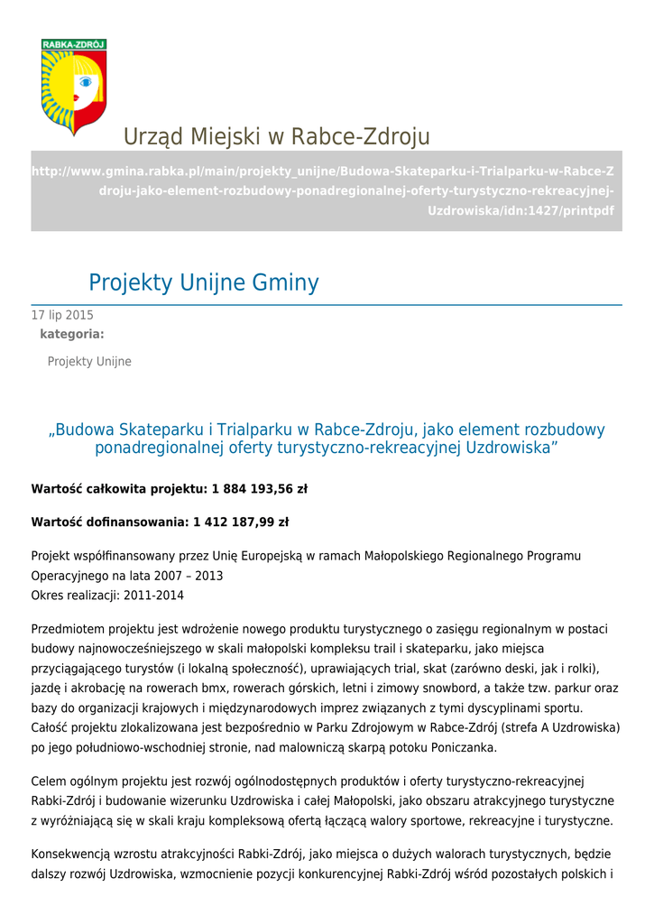 Urząd Miejski w Rabce-Zdroju http://www.gmina.rabka.pl/main/projekty_unijne/Budowa-Skateparku-i-Trialparku-w-Rabce-Z droju-jako-element-rozbudowy-ponadregionalnej-oferty-turystyczno-rekreacyjnejUzdrowiska/idn:1427/printpdf Projekty Unijne Gminy 17 lip 2015 kategoria: Projekty Unijne „Budowa Skateparku i Trialparku w Rabce-Zdroju, jako element rozbudowy ponadregionalnej oferty turystyczno-rekreacyjnej Uzdrowiska” Wartość całkowita projektu: 1 884 193,56 zł Wartość dofinansowania: 1 412 187,99 zł Projekt współfinansowany przez Unię Europejską w ramach Małopolskiego Regionalnego Programu Operacyjnego na lata 2007 – 2013 Okres realizacji: 2011-2014 Przedmiotem projektu jest wdrożenie nowego produktu turystycznego o zasięgu regionalnym w postaci budowy najnowocześniejszego w skali małopolski kompleksu trail i skateparku, jako miejsca przyciągającego turystów (i lokalną społeczność), uprawiających trial, skat (zarówno deski, jak i rolki), jazdę i akrobację na rowerach bmx, rowerach górskich, letni i zimowy snowbord, a także tzw. parkur oraz bazy do organizacji krajowych i międzynarodowych imprez związanych z tymi dyscyplinami sportu. Całość projektu zlokalizowana jest bezpośrednio w Parku Zdrojowym w Rabce-Zdrój (strefa A Uzdrowiska) po jego południowo-wschodniej stronie, nad malowniczą skarpą potoku Poniczanka. Celem ogólnym projektu jest rozwój ogólnodostępnych produktów i oferty turystyczno-rekreacyjnej Rabki-Zdrój i budowanie wizerunku Uzdrowiska i całej Małopolski, jako obszaru atrakcyjnego turystyczne z wyróżniającą się w skali kraju kompleksową ofertą łączącą walory sportowe, rekreacyjne i turystyczne. Konsekwencją wzrostu atrakcyjności Rabki-Zdrój, jako miejsca o dużych walorach turystycznych, będzie dalszy rozwój Uzdrowiska, wzmocnienie pozycji konkurencyjnej Rabki-Zdrój wśród pozostałych polskich i europejskich miejscowości turystyczno-rekreacyjnych, w wyniku czego wzrośnie ranga i renoma Małopolski, jako regionu o szczególnym potencjale turystycznym. Celem bezpośrednim projektu jest: zwiększenie ruchu turystycznego w Rabce-Zdrój poprzez stworzenie atrakcyjnej przestrzeni do profesjonalnego i amatorskiego uprawiania takich sportów jak trial, rowery typu bmx i rowery górskie, skate, rolki, letni snowbord. Osiągnięcie celu głównego przyczyni się do zrealizowania celów pośrednich projektu, jakimi są m.in.: poszerzenie oferty turystyczno-rekreacyjnej dla turystów oraz sportowców zarówno amatorów, jak i profesjonalistów; uatrakcyjnienie oferty pobytowej poprzez stworzenie nowej atrakcji turystyczno-rekreacyjnej co spowoduje wzrost zainteresowania wypoczynkiem na terenie Uzdrowiska oraz przyciągnie nowe grupy odbiorców; trwałe wpisanie Rabki-Zdrój w kalendarz międzynarodowych imprez trialowych oraz innych kolarskich wyścigów górskich, a poprzez to promocję i popularyzację miejscowości wśród osób i środowisk, które nie miały z nią do tej pory styczności; stworzenie czytelnej i identyfikowalnej z Rabką atrakcji turystyczno-rekreacyjnej, co ułatwi promocję miasta; zagospodarowanie niewykorzystanych terenów Parku Zdrojowego oraz rewitalizację obiektów tworzących dawny charakter Parku (kręgielnia wraz z otoczeniem). ZAKRES RZECZOWY Budowa trialparku Dla potrzeb trialparku zaprojektowano osadzone w gruncie przeszkody terenowe, rozmieszczone pomiędzy istniejącymi drzewami. Projekt przewiduje demontaż przechodzących przez jego teren ścieżek asfaltowych i odtworzenie w ich miejscu nawierzchni trawiastej oraz wykarczowanie istniejących krzaków z zachowaniem wszystkich porastających ten teren drzew. Obszar trialparku podzielono na trzy strefy, w których zastosowano różne rodzaje przeszkód: - strefa „A” w której przewidziano usypanie kopca ziemnego wys. ok. 150 cm i osadzenie w gruncie kamieni, głazów i skał; - strefa „B” z przeszkodami drewnianymi wykonanymi z kłód i pni drzew w powiązaniu z głazami; - strefa „C” z przeszkodami wykorzystującymi drewniane szpule kablowe. Powierzchnia trialparku: 2 010,00 m2. Budowa skat parku Dla potrzeb skateparku zaprojektowano utwardzenie nawierzchni w formie płyty żelbetowej oraz takie jej ukształtowanie aby powstały żelbetowe przeszkody (9 szt.) przystosowane do jazdy po nich na łyżworolkach, deskorolkach i rowerach. Kształt, forma oraz wielkość projektowanego placu i przeszkód zostały dostosowane do istniejącego terenu ograniczonego przez okalające go drzewa, skarpę terenową oraz ogrodzenie. Oprócz przeszkód betonowych w projekcie przewidziano montaż gotowych przeszkód wykonanych ze sklejki laminowanej (8 szt.), montowanych do płyty żelbetowej i nawierzchni z kostki betonowej. W skat parku zaplanowano następujący układ przeszkód: 1. Mini-rampa (przeszkoda kompozytowo drewniana na płycie żelbetowej); 2. Poll-jam (przeszkoda betonowa z poręczą z rury stalowej); 3. Ławka (przeszkoda kompozytowo drewniana na płycie żelbetowej); 4. Quarter-pipe (przeszkoda kompozytowo drewniana na płycie żelbetowej); 5. Funbox piramida z grindboxem 3/3 (przeszkoda kompozytowo drewniana na płycie żelbetowej); 6. Bank ramp (przeszkoda kompozytowo drewniana na płycie żelbetowej); 7. Poręcz spadowa (przeszkoda betonowa z poręczą z rury stalowej); 8. Fala + London Gap (przeszkoda kompozytowo drewniana na płycie żelbetowej); 9. Pręcz prosta (przeszkoda betonowa z poręczą z rury stalowej); 10. Grindbox 14 (przeszkoda kompozytowo drewniana na płycie żelbetowej); 11. Grindbox 1 (przeszkoda kompozytowo drewniana na płycie żelbetowej); 12. Grindbox 2 (przeszkoda kompozytowo drewniana na płycie żelbetowej); 13. Poręcz spadowa ze schodów (przeszkoda betonowa z poręczą z kształt. stalowego); 14. Schody + bank schodów (przeszkoda betonowa z poręczą z kształtownika kwadratowego zakotwionego w fundamencie betonowym); 15. Schody + bank + hubba (przeszkoda betonowa); 16. Platforma (prze