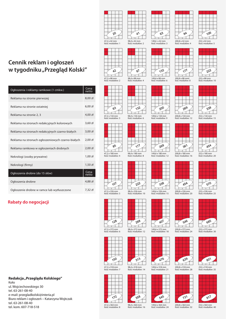 47,2 x 42 mm Ilość modułów: 1 98,4 x 42 mm Ilość modułów: 2 149,6 x 42 mm Ilość modułów: 3 200,8 x 42 mm Ilość modułów: 4 252 x 42 mm Ilość modułów: 5 47,2 x 88 mm Ilość modułów: 2 98,4 x 88 mm Ilość modułów: 4 149,6 x 88 mm Ilość modułów: 6 200,8 x 88 mmI lość modułów: 8 252 x 88 mm Ilość modułów: 10 47,2 x 134 mm Ilość modułów: 3 98,4 x 134 mm Ilość modułów: 6 149,6 x 134 mm Ilość modułów: 9 200,8 x 134 mm Ilość modułów: 12 252 x 134 mm Ilość modułów: 15 47,2 x 180 mm Ilość modułów: 4 98,4 x 180 mm Ilość modułów: 8 149,6 x 180 mm Ilość modułów: 12 200,8 x 180 mm Ilość modułów: 16 252 x 180 mm Ilość modułów: 20 47,2 x 226 mm Ilość modułów: 5 98,4 x 226 mm Ilość modułów: 10 149,6 x 226 mm Ilość modułów: 15 200,8 x 226 mm Ilość modułów: 20 252 x 226 mm Ilość modułów: 25 47,2 x 272 mm Ilość modułów: 6 98,4 x 272 mm Ilość modułów: 12 149,6 x 272 mm Ilość modułów: 18 200,8 x 272 mm Ilość modułów: 24 252 x 272 mm Ilość modułów: 30 47,2 x 318 mm Ilość modułów: 7 98,4 x 318 mm Ilość modułów: 14 149,6 x 318 mm Ilość modułów: 21 200,8 x 318 mm Ilość modułów: 28 252 x 318 mm Ilość modułów: 35 47,2 x 364 mm Ilość modułów: 8 98,4 x 364 mm Ilość modułów: 16 149,6 x 364 mm Ilość modułów: 24 200,8 x 364 mm Ilość modułów: 32 252 x 364 mm Ilość modułów: 40 Cennik reklam i ogłoszeń w tygodniku „Przegląd Kolski” Ogłoszenia i reklamy ramkowe (1 cmkw.) Cena netto Reklama na stronie pierwszej 8,00 zł Reklama na stronie ostatniej 6,00 zł Reklama na stronie 2, 3 4,00 zł Reklama na stronach redakcyjnych kolorowych 3,60 zł Reklama na stronach redakcyjnych czarno-białych 3,00 zł Reklama na stronach ogłoszeniowych czarno-białych 2,00 zł Reklama ramkowa w ogłoszeniach drobnych 2,00 zł Nekrologi (osoby prywatne) 1,00 zł Nekrologi (firmy) 1,50 zł Ogłoszenia drobne (do 15 słów) Cena netto Ogłoszenia drobne 4,88 zł Ogłoszenie drobne w ramce lub wytłuszczone 7,32 zł Rabaty do negocjacji Redakcja „Przeglądu Kolskiego” Koło ul. Wojciechowskiego 30 tel. 63-261-08-40 e-mail: [email protected] Biuro reklam i ogłoszeń – Katarzyna Wojtczak tel. 63-261-08-40 tel. kom. 607-718-518