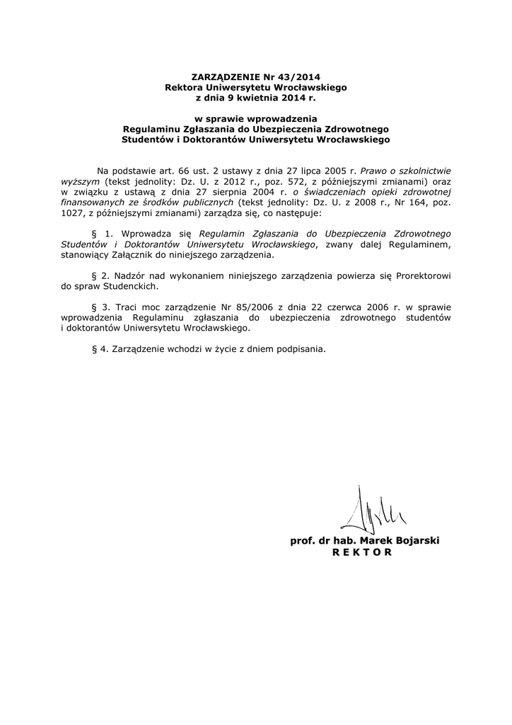 ZARZĄDZENIE Nr 43/2014 Rektora Uniwersytetu Wrocławskiego z dnia 9 kwietnia 2014 r. w sprawie wprowadzenia Regulaminu Zgłaszania do Ubezpieczenia Zdrowotnego Studentów i Doktorantów Uniwersytetu Wrocławskiego Na podstawie art. 66 ust. 2 ustawy z dnia 27 lipca 2005 r. Prawo o szkolnictwie wyŜszym (tekst jednolity: Dz. U. z 2012 r., poz. 572, z późniejszymi zmianami) oraz w związku z ustawą z dnia 27 sierpnia 2004 r. o świadczeniach opieki zdrowotnej finansowanych ze środków publicznych (tekst jednolity: Dz. U. z 2008 r., Nr 164, poz. 1027, z późniejszymi zmianami) zarządza się, co następuje: § 1. Wprowadza się Regulamin Zgłaszania do Ubezpieczenia Zdrowotnego Studentów i Doktorantów Uniwersytetu Wrocławskiego, zwany dalej Regulaminem, stanowiący Załącznik do niniejszego zarządzenia. § 2. Nadzór nad wykonaniem niniejszego zarządzenia powierza się Prorektorowi do spraw Studenckich. § 3. Traci moc zarządzenie Nr 85/2006 z dnia 22 czerwca 2006 r. w sprawie wprowadzenia Regulaminu zgłaszania do ubezpieczenia zdrowotnego studentów i doktorantów Uniwersytetu Wrocławskiego. § 4. Zarządzenie wchodzi w Ŝycie z dniem podpisania. Załącznik do zarządzenia Nr 43/2014 z dnia 9 kwietnia 2014 r. REGULAMIN ZGŁASZANIA DO UBEZPIECZENIA ZDROWOTNEGO STUDENTÓW I DOKTORANTÓW UNIWERSYTETU WROCŁAWSKIEGO I. Wstęp §1 Niniejszy Regulamin ma na celu określenie zasad i trybu zgłaszania do ubezpieczenia zdrowotnego studentów i doktorantów Uniwersytetu Wrocławskiego. II. Ubezpieczenie zdrowotne studentów obywatelami Rzeczypospolitej Polskiej i doktorantów będących Zasady ogólne §2 1. Wszyscy studenci i doktoranci Uniwersytetu Wrocławskiego, będący obywatelami Rzeczypospolitej Polskiej, podlegają obowiązkowi ubezpieczenia zdrowotnego i mają prawo do korzystania bezpłatnie ze świadczeń opieki medycznej. 2. Student lub doktorant korzysta z ubezpieczenia zdrowotnego jako członek rodziny osoby ubezpieczonej: 1/ do czasu ukończenia 26. roku Ŝycia - obowiązek zgłoszenia do ubezpieczenia ciąŜy na rodzicach bądź opiekunach prawnych; 2/ bez ograniczenia wieku - jeŜeli posiada orzeczenie o znacznym stopniu niepełnosprawności lub inne traktowane na równi - obowiązek zgłoszenia do ubezpieczenia ciąŜy na rodzicach bądź opiekunach prawnych; 3/ bez ograniczenia wieku – jeŜeli jego małŜonek podlega obowiązkowemu ubezpieczeniu zdrowotnemu (wynikającemu np. ze stosunku pracy) - obowiązek zgłoszenia do ubezpieczenia ciąŜy na małŜonku. 3. Obowiązkowi ubezpieczenia zdrowotnego w Rzeczypospolitej Polskiej podlegają między innymi: 1/ osoby spełniające warunki do objęcia ubezpieczeniem społecznym lub ubezpieczeniem społecznym rolników, które są: a/ pracownikami w rozumieniu ustawy o systemie ubezpieczeń społecznych, b/ rolnikami lub ich domownikami w rozumieniu przepisów o ubezpieczeniu społecznym rolników, c/ osobami prowadzącymi działalność pozarolniczą lub osobami z nimi współpracującymi, d/ osobami wykonującymi pracę nakładczą, e/ osobami wykonującymi pracę na podstawie umowy agencyjnej lub umowy zlecenia albo innej umowy o świadczenie usług, do której zgodnie z przepisami Kodeksu cywilnego stosuje się przepisy dotyczące zlecenia, lub osobami z nimi współpracującymi, f/ członkami rolniczych spółdzielni produkcyjnych, spółdzielni kółek rolniczych lub członkami ich rodzin; 2/ osoby pobierające emeryturę lub rentę; 3/ osoby pobierające stypendium sportowe; 4/ bezrobotni niepodlegający obowiązkowi ubezpieczenia zdrowotnego z innego tytułu; 5/ osoby pobierające zasiłek stały z pomocy społecznej; 2 6/ osoby uprawnione do świadczeń alimentacyjnych na podstawie ugody sądowej lub prawomocnego orzeczenia sądu; 7/ rolnicy i ich domownicy, którzy nie podlegają ubezpieczeniom społecznym rolników na podstawie ustawy o ubezpieczeniu społecznym rolników, niepodlegający obowiązkowi ubezpieczenia zdrowotnego na podstawie pkt 1-6. Zgłoszenie studenta/doktoranta do ubezpieczenia zdrowotnego przez Uczelnię §3 1. Uczelnia zgłasza do ubezpieczenia zdrowotnego studentów i doktorantów, którzy: 1/ ukończyli 26. rok Ŝycia i nie podlegają obowiązkowi ubezpieczenia zdrowotnego z tytułów, o których mowa w § 2 ust. 2 i 3; 2/ nie ukończyli 26. roku Ŝycia i nie podlegają obowiązkowi ubezpieczenia zdrowotnego z tytułów, o których mowa w § 2 ust. 2 i 3 (np. nie posiadają rodziców, opiekunów prawnych, małŜonka bądź osoby te nie podlegają obowiązkowi ubezpieczenia zdrowotnego) - po rozpoznaniu sytuacji studenta lub doktoranta. 2. Uczelnia zgłasza do ubezpieczenia zdrowotnego osoby, o których mowa w ust. 1 na ich pisemny wniosek. 3. Za studentów i doktorantów, o których mowa w ust. 1 Uczelnia odprowadza składkę na ubezpieczenie zdrowotne. Prawa i obowiązki studenta/doktoranta w związku ze zgłoszeniem do ubezpieczenia zdrowotnego przez Uczelnię §4 1. Podstawą do zgłoszenia do ubezpieczenia zdrowotnego przez Uniwersytet Wrocławski jest złoŜenie przez studenta/doktoranta we właściwym dziekanacie studiów lub innej odpowiedniej jednostce dydaktycznej prawidłowo wypełnionego: 1/ druku zgłoszenia do ubezpieczenia zdrowotnego oraz 2/ oświadczenia o niepodleganiu obowiązkowi ubezpieczenia zdrowotnego z innego tytułu. 2. Wzór oświadczenia, o którym mowa w ust. 1 składanego przez studenta stanowi Załącznik Nr 1 do niniejszego Regulaminu. 3. Wzór oświadczenia, o którym mowa w ust. 1 składanego przez doktoranta stanowi Załącznik Nr 2 do niniejszego Regulaminu. 4. Dokumenty, o których mowa w ust. 1 moŜe złoŜyć w imieniu studenta/doktoranta upowaŜniona przez niego osoba. Wzór upowaŜnienia stanowi Załącznik Nr 3 do niniejszego Regulaminu. 5. JeŜeli osoba zgłaszana przez Uczelnię do ubezpieczenia zdrowotnego lub którykolwiek ze zgłaszanych członków rodziny ma orzeczony stopień niepełnosprawności, student/doktorant zobowiązany jest do dos
