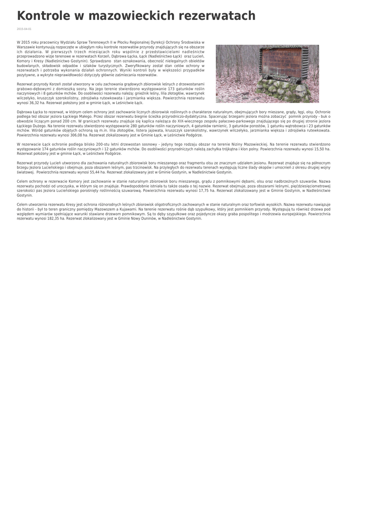 Kontrole w mazowieckich rezerwatach 2015-04-01 W 2015 roku pracownicy Wydziału Spraw Terenowych II w Płocku Regionalnej Dyrekcji Ochrony Środowiska w Warszawie kontynuują rozpoczęte w ubiegłym roku kontrole rezerwatów przyrody znajdujących się na obszarze ich działania. W pierwszych trzech miesiącach roku wspólnie z przedstawicielami nadleśnictw przeprowadzono wizje terenowe w rezerwatach Korzeń, Dąbrowa Łącka, Łąck (Nadleśnictwo Łąck) oraz Lucień, Komory i Kresy (Nadleśnictwo Gostynin). Sprawdzano stan oznakowania, obecność nielegalnych obiektów budowlanych, składowisk odpadów i szlaków turystycznych. Zweryfikowany został stan celów ochrony w rezerwatach i potrzeba wykonania działań ochronnych. Wyniki kontroli były w większości przypadków pozytywne, a wykryte nieprawidłowości dotyczyły głównie zaśmiecania rezerwatów. Rezerwat przyrody Korzeń został utworzony w celu zachowania grądowych zbiorowisk leśnych z drzewostanami grabowo-dębowymi z domieszką sosny. Na jego terenie stwierdzono występowanie 173 gatunków roślin naczyniowych i 8 gatunków mchów. Do osobliwości rezerwatu należą: gnieźnik leśny, lilia złotogłów, wawrzynek wilczełyko, kruszczyk szerokolistny, zdrojówka rutewkowata i jarzmianka większa. Powierzchnia rezerwatu wynosi 36,32 ha. Rezerwat położony jest w gminie Łąck, w Leśnictwie Łąck. Dąbrowa Łącka to rezerwat, w którym celem ochrony jest zachowanie licznych zbiorowisk roślinnych o charakterze naturalnym, obejmujących bory mieszane, grądy, łęgi, olsy. Ochronie podlega też obszar jeziora Łąckiego Małego. Przez obszar rezerwatu biegnie ścieżka przyrodniczo-dydaktyczna. Spacerując brzegami jeziora można zobaczyć pomnik przyrody - buk o obwodzie liczącym ponad 200 cm. W granicach rezerwatu znajduje się kaplica należąca do XIX-wiecznego zespołu pałacowo-parkowego znajdującego się po drugiej stronie jeziora Łąckiego Dużego. Na terenie rezerwatu stwierdzono występowanie 280 gatunków roślin naczyniowych, 4 gatunków ramienic, 3 gatunków porostów, 1 gatunku wątrobowca i 23 gatunków mchów. Wśród gatunków objętych ochroną są m.in. lilia złotogłów, listera jajowata, kruszczyk szerokolistny, wawrzynek wilczełyko, jarzmianka większa i zdrojówka rutewkowata. Powierzchnia rezerwatu wynosi 306,08 ha. Rezerwat zlokalizowany jest w Gminie Łąck, w Leśnictwie Podgórze. W rezerwacie Łąck ochronie podlega blisko 200-stu letni drzewostan sosnowy - jedyny tego rodzaju obszar na terenie Niziny Mazowieckiej. Na terenie rezerwatu stwierdzono występowanie 174 gatunków roślin naczyniowych i 12 gatunków mchów. Do osobliwości przyrodniczych należą zachyłka trójkątna i klon polny. Powierzchnia rezerwatu wynosi 15,50 ha. Rezerwat położony jest w gminie Łąck, w Leśnictwie Podgórze. Rezerwat przyrody Lucień utworzono dla zachowania naturalnych zbiorowisk boru mieszanego oraz fragmentu olsu ze znacznym udziałem jesionu. Rezerwat znajduje się na północnym brzegu Jeziora Lucieńskiego i obejmuje, poza obszarem leśnym, pas trzcinowisk. Na przyległych do rezerwatu terenach występują liczne ślady okopów i umocnień z okresu drugiej wojny światowej. Powierzchnia rezerwatu wynosi 55,44 ha. Rezerwat zlokalizowany jest w Gminie Gostynin, w Nadleśnictwie Gostynin. Celem ochrony w rezerwacie Komory jest zachowanie w stanie naturalnym zbiorowisk boru mieszanego, grądu z pomnikowymi dębami, olsu oraz nadbrzeżnych szuwarów. Nazwa rezerwatu pochodzi od uroczyska, w którym się on znajduje. Prawdopodobnie istniała tu także osada o tej nazwie. Rezerwat obejmuje, poza obszarami leśnymi, pięćdziesięciometrowej szerokości pas Jeziora Lucieńskiego porośnięty roślinnością szuwarową. Powierzchnia rezerwatu wynosi 17,75 ha. Rezerwat zlokalizowany jest w Gminie Gostynin, w Nadleśnictwie Gostynin. Celem utworzenia rezerwatu Kresy jest ochrona różnorodnych leśnych zbiorowisk oligotroficznych zachowanych w stanie naturalnym oraz torfowisk wysokich. Nazwa rezerwatu nawiązuje do historii - był to teren graniczny pomiędzy Mazowszem a Kujawami. Na terenie rezerwatu rośnie dąb szypułkowy, który jest pomnikiem przyrody. Występują tu również drzewa pod względem wymiarów spełniające warunki stawiane drzewom pomnikowym. Są to dęby szypułkowe oraz pojedyncze okazy graba pospolitego i modrzewia europejskiego. Powierzchnia rezerwatu wynosi 182,35 ha. Rezerwat zlokalizowany jest w Gminie Nowy Duninów, w Nadleśnictwie Gostynin.