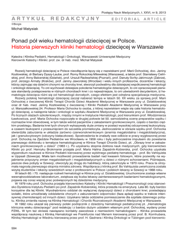 Postępy Nauk Medycznych, t. XXVI, nr 9, 2013 artykuł redakcyjny editorial article ©Borgis Michał Matysiak Ponad pół wieku hematologii dziecięcej w Polsce. Historia pierwszych kliniki hematologii dziecięcej w Warszawie Katedra i Klinika Pediatrii, Hematologii i Onkologii, Warszawski Uniwersytet Medyczny Kierownik Katedry i Kliniki: prof. zw. dr hab. med. Michał Matysiak Rozwój hematologii dziecięcej w Polsce nieodłącznie łączy się z nazwiskami prof. Marii Ochockiej, doc. Janiny Kozłowskiej, dr Barbary Dyszy-Laube, prof. Romy Rokockiej-Milewskiej (Warszawa), a także prof. Stanisławy Celińskiej, prof. Anny Balcerskiej (Gdańsk), prof. Urszuli Radwańskiej (Poznań), prof. Danuty Sońty-Jakimczyk (Zabrze), prof. Jerzego Armaty (Kraków), prof. Janiny Jaworskiej (Wrocław) i wielu innych profesorów, docentów i lekarzy, którzy zajmując się dziećmi chorymi na choroby krwi, stworzyli podwalimy dla dzisiejszej współczesnej hematologii i onkologii dziecięcej. To oni wychowali dzisiejsze pokolenie hematologów dziecięcych, to oni opracowywali pierwsze standardy postępowania w różnych chorobach krwi i co najważniejsze, to oni uświadomili decydentom, iż hematologia dziecięca różni się od hematologii dorosłych, czego efektem jest odrębna specjalizacja medyczna. Rozwój polskiej hematologii dziecięcej zaczął nabierać tempa w latach 50. XX wieku za sprawą prof. Marii Ochockiej z ówczesnej Kliniki Terapii Chorób Dzieci Akademii Medycznej w Warszawie przy ul. Działdowskiej oraz dr hab. med. Janiny Kozłowskiej z ówczesnej I Kliniki Pediatrii Akademii Medycznej w Warszawie przy ul. Marszałkowskiej 24. Profesor Maria Ochocka to osoba, z której nazwiskiem wiąże się cała historia hematologii dziecięcej, a następnie także i onkologii w szpitalu Akademii Medycznej w Warszawie przy ul. Działdowskiej. Po licznych stażach szkoleniowych, między innymi w Instytucie Hematologii, pod kierunkiem prof. Włodzimierza Ławkowicza, prof. Maria Ochocka rozpoczęła w drugiej połowie lat 50. samodzielną ocenę preparatów szpiku i rozmazów krwi obwodowej, w tym także wśród pacjentów z zakażeniami gronkowcowymi, często o bardzo ciężkim przebiegu. Badania krwi tych chorych wykazywały duże zmiany w postaci wysokiej odczynowej leukocytozy, a czasem leukopenii z przesunięciem do szczebla promielocyta. Jednocześnie w obrazie szpiku prof. Ochocka stwierdziła zaburzenia w układzie zarówno czerwonokrwinkowym (anemia megaloidalna i megaloblastyczna), jak i granulocytowym (odczyny białaczkowe). Spostrzeżenia te znalazły swe odbicie w pracy wygłoszonej przez prof. Ochocką na Zjeździe Pediatrów we Wrocławiu w 1959 roku i były jednocześnie impulsem do powstania pierwszego doktoratu o tematyce hematologicznej w Klinice Terapii Chorób Dzieci, pt. „Obrazy krwi w zakażeniach gronkowcowych u dzieci” (1963 r.). Po uzyskaniu stopnia doktora nauk medycznych, gdy kierownictwo Kliniki po prof. Henryku Brokmanie przejęła prof. Maria Halina Zapaśnik-Kobierska, prof. Ochocka uzyskała stypendium naukowe w Klinice Pediatrii kierowanej przez wybitnego pediatrę-hematologa – prof. Bo Vahlquista w Uppsali (Szwecja). Miała tam możliwość prowadzenia badań nad kwasem foliowym, które pozwoliły na wyjaśnienie przyczyny zmian megaloidalnych i megaloblastycznych u dzieci z różnymi schorzeniami. Późniejsze, jeszcze dwa pobyty w Szwecji, otworzyły jej drogę do habilitacji, którą zakończyła w 1970 roku. Praca ta otrzymała nagrodę pierwszego stopnia ministra zdrowia. Współpraca z kliniką prof. Bo Vahlquista uwieńczona została wizytą studentów i lekarzy szwedzkich wraz z profesorami w Polsce i polskich lekarzy w Szwecji w 1968 roku. W latach 60. i 70. następuje rozkwit hematologii w Klinice przy ul. Działdowskiej. Uruchomione zostaje własne wewnątrzoddziałowe laboratorium, zwiększa się liczba lekarzy zainteresowanych badaniami hematologicznymi, pojawia się coraz więcej prac poświęconych tej dziedzinie medycyny. W 1979 roku prof. Ochocka przejęła kierownictwo Katedry i Kliniki Hematologii i Pneumonologii oraz stanowisko Dyrektora Instytutu Pediatrii po prof. Zapaśnik-Kobierskiej, która przeszła na emeryturę. Lata 80. były bardzo korzystne dla tej Kliniki. Wyodrębniono oddział do wyłącznej dyspozycji dzieci z chorobami krwi, posiadający izolatki, które umożliwiały oddzielenie chorych z zaburzeniami odporności (faza aplazji szpiku w trakcie intensywnej chemioterapii) od innych dzieci. Uzyskano także oddzielne pomieszczenie dla szpitala dziennego pobytu. Klinika zmieniła nazwę na Klinikę Hematologii i Chorób Rozrostowych Akademii Medycznej w Warszawie. W 1982 roku ukazał się pierwszy polski podręcznik z dziedziny hematologii pediatrycznej pt. „Hematologia kliniczna wieku dziecięcego” pod redakcją i z bardzo dużym udziałem własnym prof. Ochockiej, wydany przez PZWL. W tym też okresie nawiązano kontakty zawodowe z niemieckimi hematologiami – Klinika prowadziła współpracę naukową z Kliniką Hematologii we Frankfurcie nad Menem kierowaną przez prof. B. Kornhubera, Kliniką Hematologii w Wiedniu kierowaną przez prof. H. Gadnera i Kliniką Onkologii w Tübingen pod kierownic- 594 Ponad pół wieku hematologii dziecięcej w Polsce. Historia pierwszych kliniki hematologii dziecięcej w Warszawie twem prof. D. Niethammera. W klinikach tych polscy lekarze odbywali staże kliniczne i naukowe. Nastąpił też rozwój przyklinicznej pracowni cytohematologii, którą prowadziła dr n. biol. Alicja Siwicka. Pracownia ta stała się wiodącą, referencyjną placówką cytohematologii pediatrycznej w kraju. W uznaniu dorobku naukowego prof. Ochocka otrzymała tytuł profesora, a także członkostwo w American Society of Pediatric Hematology & Oncology (1985 r.), SIOP, Polskiego Towarzystwa Onkologii i Hematologii Dziecięcej, Polskiego Towarzystwa Hematologii i Transfuzjologii oraz zaproszenia na liczne wyk