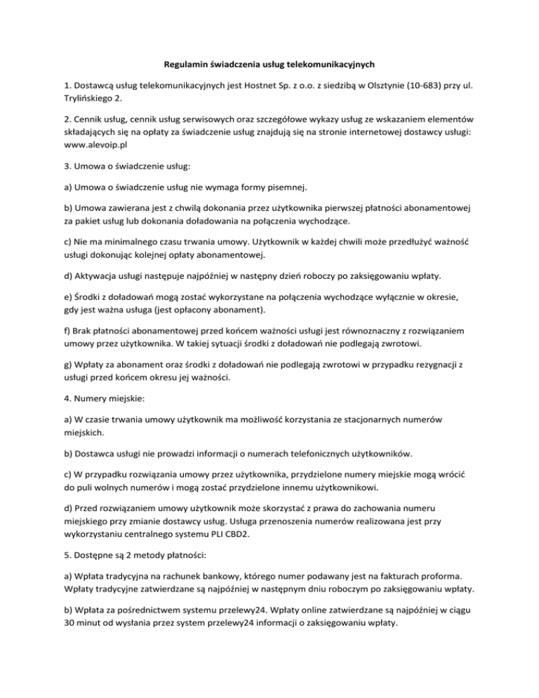 Regulamin świadczenia usług telekomunikacyjnych 1. Dostawcą usług telekomunikacyjnych jest Hostnet Sp. z o.o. z siedzibą w Olsztynie (10-683) przy ul. Trylińskiego 2. 2. Cennik usług, cennik usług serwisowych oraz szczegółowe wykazy usług ze wskazaniem elementów składających się na opłaty za świadczenie usług znajdują się na stronie internetowej dostawcy usługi: www.alevoip.pl 3. Umowa o świadczenie usług: a) Umowa o świadczenie usług nie wymaga formy pisemnej. b) Umowa zawierana jest z chwilą dokonania przez użytkownika pierwszej płatności abonamentowej za pakiet usług lub dokonania doładowania na połączenia wychodzące. c) Nie ma minimalnego czasu trwania umowy. Użytkownik w każdej chwili może przedłużyć ważność usługi dokonując kolejnej opłaty abonamentowej. d) Aktywacja usługi następuje najpóźniej w następny dzień roboczy po zaksięgowaniu wpłaty. e) Środki z doładowań mogą zostać wykorzystane na połączenia wychodzące wyłącznie w okresie, gdy jest ważna usługa (jest opłacony abonament). f) Brak płatności abonamentowej przed końcem ważności usługi jest równoznaczny z rozwiązaniem umowy przez użytkownika. W takiej sytuacji środki z doładowań nie podlegają zwrotowi. g) Wpłaty za abonament oraz środki z doładowań nie podlegają zwrotowi w przypadku rezygnacji z usługi przed końcem okresu jej ważności. 4. Numery miejskie: a) W czasie trwania umowy użytkownik ma możliwość korzystania ze stacjonarnych numerów miejskich. b) Dostawca usługi nie prowadzi informacji o numerach telefonicznych użytkowników. c) W przypadku rozwiązania umowy przez użytkownika, przydzielone numery miejskie mogą wrócić do puli wolnych numerów i mogą zostać przydzielone innemu użytkownikowi. d) Przed rozwiązaniem umowy użytkownik może skorzystać z prawa do zachowania numeru miejskiego przy zmianie dostawcy usług. Usługa przenoszenia numerów realizowana jest przy wykorzystaniu centralnego systemu PLI CBD2. 5. Dostępne są 2 metody płatności: a) Wpłata tradycyjna na rachunek bankowy, którego numer podawany jest na fakturach proforma. Wpłaty tradycyjne zatwierdzane są najpóźniej w następnym dniu roboczym po zaksięgowaniu wpłaty. b) Wpłata za pośrednictwem systemu przelewy24. Wpłaty online zatwierdzane są najpóźniej w ciągu 30 minut od wysłania przez system przelewy24 informacji o zaksięgowaniu wpłaty. 6. Funkcjonalność usług głosowych: a) Dostawca usług zapewnia połączenia z numerami alarmowymi pod warunkiem określenia przez użytkownika lokalizacji centrum alarmowego w panelu klienta (zakładka telefony -> ustawienie telefonu -> numery alarmowe). b) Dane o lokalizacji telekomunikacyjnego urządzenia końcowego mogą być przekazywane bezpośrednio służbom alarmowym, pod warunkiem określenia tej lokalizacji w panelu klienta. c) Informacje na temat ewentualnych ograniczeń w dostępie do usług telekomunikacyjnych są zamieszczane na stronach internetowych dostawcy usług. d) W przypadku naruszenia przez użytkownika bezpieczeństwa lub integralności sieci lub usług, dostawca ma prawo ograniczyć funkcjonalność usług oraz rozwiązać umowę ze skutkiem natychmiastowym. 7. Bezpieczeństwo: a) Dostawca Usług nie gwarantuje bezpieczeństwa przekazu w sieciach telekomunikacyjnych, w szczególności w sieci Internet. b) Użytkownik zobowiązany jest zabezpieczyć na własny koszt dostęp do usług w taki sposób, aby mogły z niej korzystać wyłącznie osoby upoważnione, w szczególności poprzez wprowadzenie stosownego identyfikatora i hasła. c) Użytkownik zobowiązany jest do zabezpieczenia sieci lokalnej przy użyciu oprogramowania zabezpieczającego przed atakiem poprzez sieć. d) Dane osobowe użytkownika są przetwarzane wyłącznie w zakresie niezbędnym do świadczenia usługi. e) Edycja danych użytkownika możliwa jest za pośrednictwem panelu klienta (zakładka dane adresowe). f) Dostęp do panelu klienta zabezpieczony jest protokołem https. 8. Dane dotyczące jakości usług, w szczególności minimalne oferowane poziomy jakości usług, są wyszczególnione w dokumencie Gwarancje SLA, który jest integralną częścią umowy. 9. Zakres odpowiedzialności z tytułu niewykonania lub nienależytego wykonania umowy, wysokość odszkodowania oraz zasady i terminy jego wypłaty określa dokument Gwarancje SLA. 10. Dostawca usługi zapewnia możliwość samodzielnego sprawdzania środków zgromadzonych na koncie rozliczeniowym za pośrednictwem panelu klienta. 11. Dostawca nie zapewnia usług serwisowych świadczonych w lokalizacji klienta. 12. Reklamacje można składać za pośrednictwem panelu klienta (zakładka zgłoszenia), pisemnie lub telefonicznie (w dni robocze w godz. 10:00-16:00). Będą one rozpatrywane w ciągu 14 dni od zgłoszenia. 13. Dostawca usługi zastrzega sobie prawo do zmiany regulaminu oraz cennika w każdym czasie, z tym że: a) w przypadku zmian niekorzystnych dla użytkowników, informacja o zmianach zostanie zamieszczona na stronie internetowej oraz wysłana emailem minimum 30 dni przed planowanymi zmianami. b) W przypadku zmian neutralnych lub korzystnych dla użytkowników, informacja o zmianach nie musi być zamieszczana na stronie internetowej z wyprzedzeniem. 14. W sprawach nieuregulowanych w regulaminie zastosowanie mają przepisy powszechnie obowiązującego prawa polskiego. Wszelkie spory będą rozstrzygane przez polski sąd powszechny właściwy miejscowo dla dostawcy usług. 15. Niniejszy regulamin obowiązuje od 1 stycznia 2016 roku.