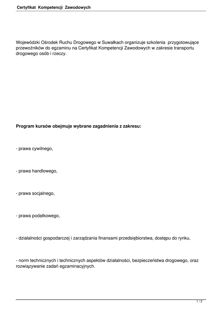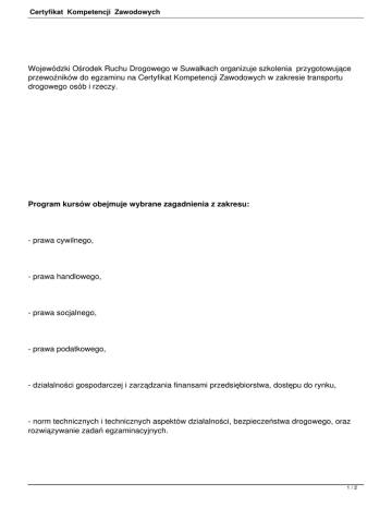 Certyfikat Kompetencji Zawodowych Wojewódzki Ośrodek Ruchu Drogowego w Suwałkach organizuje szkolenia przygotowujące przewoźników do egzaminu na Certyfikat Kompetencji Zawodowych w zakresie transportu drogowego osób i rzeczy. Program kursów obejmuje wybrane zagadnienia z zakresu: - prawa cywilnego, - prawa handlowego, - prawa socjalnego, - prawa podatkowego, - działalności gospodarczej i zarządzania finansami przedsiębiorstwa, dostępu do rynku, - norm technicznych i technicznych aspektów działalności, bezpieczeństwa drogowego, oraz rozwiązywanie zadań egzaminacyjnych. 1/2 Certyfikat Kompetencji Zawodowych W sumie 65 godz. zajęć lekcyjnych (zgodnie z zakresem zagadnień objętych egzaminem, które określa część I załącznika do rozporządzenia Parlamentu Europejskiego i Rady (WE) Nr 1071/2009). Podstawa prawna w/w szkolenia: Ustawa z dnia 6 września 2001 r. o transporcie drogowym (Dz. U. z 2007r. Nr 125, poz. 874 z późn. zm.). Rozporządzenie Ministra Transportu, Budownictwa i Gospodarki Morskiej z dnia 10 stycznia 2012r. w sprawie uzyskiwania certyfikatów kompetencji zawodowych w transporcie drogowym (Dz. U. 2012 poz.96). Opłata za szkolenie wynosi 1500 zł brutto od osoby. 2/2