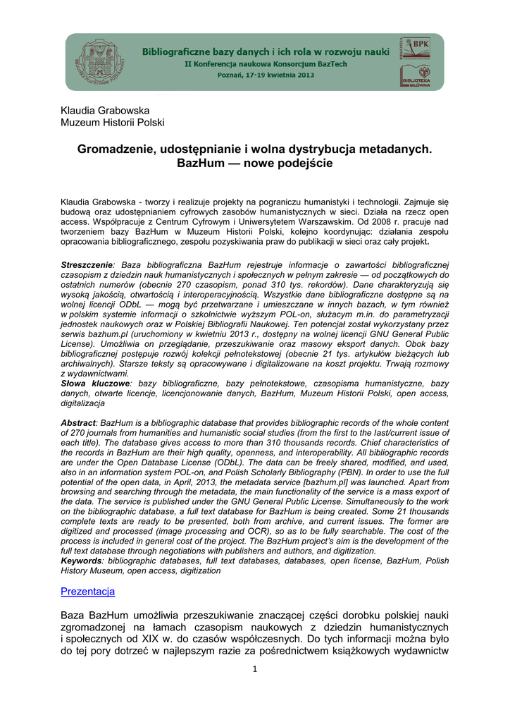 Klaudia Grabowska Muzeum Historii Polski Gromadzenie, udostępnianie i wolna dystrybucja metadanych. BazHum — nowe podejście Klaudia Grabowska - tworzy i realizuje projekty na pograniczu humanistyki i technologii. Zajmuje się budową oraz udostępnianiem cyfrowych zasobów humanistycznych w sieci. Działa na rzecz open access. Współpracuje z Centrum Cyfrowym i Uniwersytetem Warszawskim. Od 2008 r. pracuje nad tworzeniem bazy BazHum w Muzeum Historii Polski, kolejno koordynując: działania zespołu opracowania bibliograficznego, zespołu pozyskiwania praw do publikacji w sieci oraz cały projekt. Streszczenie: Baza bibliograficzna BazHum rejestruje informacje o zawartości bibliograficznej czasopism z dziedzin nauk humanistycznych i społecznych w pełnym zakresie — od początkowych do ostatnich numerów (obecnie 270 czasopism, ponad 310 tys. rekordów). Dane charakteryzują się wysoką jakością, otwartością i interoperacyjnością. Wszystkie dane bibliograficzne dostępne są na wolnej licencji ODbL — mogą być przetwarzane i umieszczane w innych bazach, w tym również w polskim systemie informacji o szkolnictwie wyższym POL-on, służacym m.in. do parametryzacji jednostek naukowych oraz w Polskiej Bibliografii Naukowej. Ten potencjał został wykorzystany przez serwis bazhum.pl (uruchomiony w kwietniu 2013 r., dostępny na wolnej licencji GNU General Public License). Umożliwia on przeglądanie, przeszukiwanie oraz masowy eksport danych. Obok bazy bibliograficznej postępuje rozwój kolekcji pełnotekstowej (obecnie 21 tys. artykułów bieżących lub archiwalnych). Starsze teksty są opracowywane i digitalizowane na koszt projektu. Trwają rozmowy z wydawnictwami. Słowa kluczowe: bazy bibliograficzne, bazy pełnotekstowe, czasopisma humanistyczne, bazy danych, otwarte licencje, licencjonowanie danych, BazHum, Muzeum Historii Polski, open access, digitalizacja Abstract: BazHum is a bibliographic database that provides bibliographic records of the whole content of 270 journals from humanities and humanistic social studies (from the first to the last/current issue of each title). The database gives access to more than 310 thousands records. Chief characteristics of the records in BazHum are their high quality, openness, and interoperability. All bibliographic records are under the Open Database License (ODbL). The data can be freely shared, modified, and used, also in an information system POL-on, and Polish Scholarly Bibliography (PBN). In order to use the full potential of the open data, in April, 2013, the metadata service [bazhum.pl] was launched. Apart from browsing and searching through the metadata, the main functionality of the service is a mass export of the data. The service is published under the GNU General Public License. Simultaneously to the work on the bibliographic database, a full text database for BazHum is being created. Some 21 thousands complete texts are ready to be presented, both from archive, and current issues. The former are digitized and processed (image processing and OCR), so as to be fully searchable. The cost of the process is included in general cost of the project. The BazHum project’s aim is the development of the full text database through negotiations with publishers and authors, and digitization. Keywords: bibliographic databases, full text databases, databases, open license, BazHum, Polish History Museum, open access, digitization Prezentacja Baza BazHum umożliwia przeszukiwanie znaczącej części dorobku polskiej nauki zgromadzonej na łamach czasopism naukowych z dziedzin humanistycznych i społecznych od XIX w. do czasów współczesnych. Do tych informacji można było do tej pory dotrzeć w najlepszym razie za pośrednictwem książkowych wydawnictw 1 bibliograficznych, nawarstwiających się tomów i zasłużonych serii. To szacowne, ale z dzisiejszej perspektywy niewystarczające — mało praktyczne, nieefektywne i trudne w użyciu narzędzia. Na łamach czasopism zgromadzono wielki zasób wiedzy, informacji i danych naukowych. Zmagazynowany i utrwalony na kartach periodyków pozostaje on także trudno dostępny — i to nie tylko dla szerokiego odbiorcy, lecz także dla węższego grona specjalistów. Wiedza jest niedostępna w równym stopniu przez materialną nieosiągalność nośnika, jak i ze względu na brak efektywnych narzędzi umożliwiających zapoznanie się z treścią. Koncepcja budowy narzędzi umożliwiających intensywniejszy kontakt z zasobami, przyspieszających proces kwerend i analiz naukowych oraz poszerzających dostęp do materiałów była i jest oczywistą odpowiedzią na te braki i potrzeby. Narzędzia ukierunkowane na organizowanie i przetwarzanie zasobów powinny także znosić bariery technologiczne i prawne pomiędzy użytkownikami a treścią lub materiałem. Ich zadaniem jest nie tylko upowszechnianie dostępu, lecz także akceleracja wykorzystania treści. Od momentu, gdy w Muzeum Historii Polski sformułowano te założenia dla projektu BazHum, możliwości pozyskiwania i przetwarzania informacji o zawartości czasopism oraz dostęp do pełnych tekstów poprawiły się niestety tylko w nieznaczny sposób1. Dziś dostęp do informacji o zawartości czasopism ułatwiają multiwyszukiwarki, które wydobywają i gromadzą informacje z ustandaryzowanych repozytoriów naukowych, serwisów i baz wyposażonych w odpowiednie protokoły wymiany danych. Dane do tych wszystkich rodzajów baz są gromadzone w rozmaitych instytucjach, na różnych poziomach i w różnych celach. W rezultacie użytkownik prowadzący kwerendę może odczuwać zakłopotanie2. Inny typ narzędzi gromadzących zasoby naukowe to repozytoria instytucjonalne. Skupione na rejestrowaniu dorobku całej instytucji, udostępniają informacje o dorobku naukowym swoich pracowników i publikacjach wydawanych w ramach uczelnianego wydawnictwa. Repozytoria zawierają często dane dotyczące publikacji bieżących, podczas gdy w ram