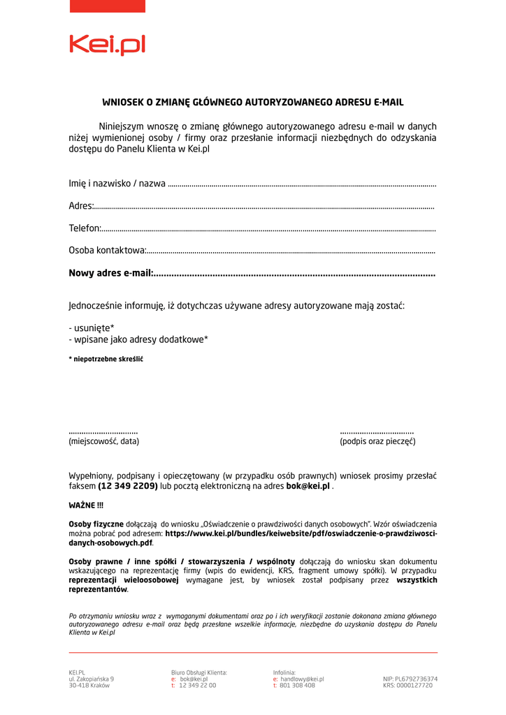 WNIOSEK O ZMIANĘ GŁÓWNEGO AUTORYZOWANEGO ADRESU E-MAIL Niniejszym wnoszę o zmianę głównego autoryzowanego adresu e-mail w danych niżej wymienionej osoby / firmy oraz przesłanie informacji niezbędnych do odzyskania dostępu do Panelu Klienta w Kei.pl Imię i nazwisko / nazwa ….................................................................................................................................... Adres:........................................................................................................................................................................... Telefon:........................................................................................................................................................................ Osoba kontaktowa:................................................................................................................................................. Nowy adres e-mail:.............................................................................................................. Jednocześnie informuję, iż dotychczas używane adresy autoryzowane mają zostać: - usunięte* - wpisane jako adresy dodatkowe* * niepotrzebne skreślić …............................. .................................. (miejscowość, data) (podpis oraz pieczęć) Wypełniony, podpisany i opieczętowany (w przypadku osób prawnych) wniosek prosimy przesłać faksem (12 349 2209) lub pocztą elektroniczną na adres [email protected] . WAŻNE !!! Osoby fizyczne dołączają do wniosku „Oświadczenie o prawdziwości danych osobowych”. Wzór oświadczenia można pobrać pod adresem: https://www.kei.pl/bundles/keiwebsite/pdf/oswiadczenie-o-prawdziwoscidanych-osobowych.pdf. Osoby prawne / inne spółki / stowarzyszenia / wspólnoty dołączają do wniosku skan dokumentu wskazującego na reprezentację firmy (wpis do ewidencji, KRS, fragment umowy spółki). W przypadku reprezentacji wieloosobowej wymagane jest, by wniosek został podpisany przez wszystkich reprezentantów. Po otrzymaniu wniosku wraz z wymaganymi dokumentami oraz po i ich weryfikacji zostanie dokonana zmiana głównego autoryzowanego adresu e-mail oraz będą przesłane wszelkie informacje, niezbędne do uzyskania dostępu do Panelu Klienta w Kei.pl