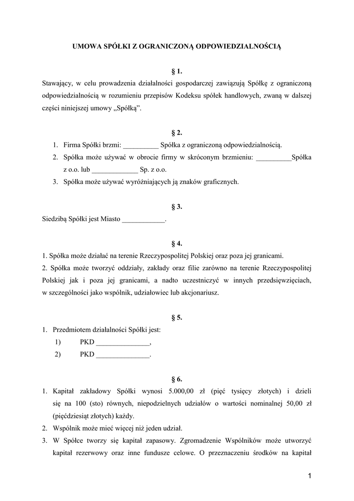 UMOWA SPÓŁKI Z OGRANICZONĄ ODPOWIEDZIALNOŚCIĄ § 1. Stawający, w celu prowadzenia działalności gospodarczej zawiązują Spółkę z ograniczoną odpowiedzialnością w rozumieniu przepisów Kodeksu spółek handlowych, zwaną w dalszej części niniejszej umowy „Spółką”. § 2. 1. Firma Spółki brzmi: __________ Spółka z ograniczoną odpowiedzialnością. 2. Spółka może używać w obrocie firmy w skróconym brzmieniu: __________Spółka z o.o. lub _____________ Sp. z o.o. 3. Spółka może używać wyróżniających ją znaków graficznych. § 3. Siedzibą Spółki jest Miasto ____________. § 4. 1. Spółka może działać na terenie Rzeczypospolitej Polskiej oraz poza jej granicami. 2. Spółka może tworzyć oddziały, zakłady oraz filie zarówno na terenie Rzeczypospolitej Polskiej jak i poza jej granicami, a nadto uczestniczyć w innych przedsięwzięciach, w szczególności jako wspólnik, udziałowiec lub akcjonariusz. § 5. 1. Przedmiotem działalności Spółki jest: 1) PKD _______________, 2) PKD _______________. § 6. 1. Kapitał zakładowy Spółki wynosi 5.000,00 zł (pięć tysięcy złotych) i dzieli się na 100 (sto) równych, niepodzielnych udziałów o wartości nominalnej 50,00 zł (pięćdziesiąt złotych) każdy. 2. Wspólnik może mieć więcej niż jeden udział. 3. W Spółce tworzy się kapitał zapasowy. Zgromadzenie Wspólników może utworzyć kapitał rezerwowy oraz inne fundusze celowe. O przeznaczeniu środków na kapitał 1 zapasowy, rezerwowy lub inny fundusz celowy decyduje każdorazowo Zgromadzenie Wspólników. § 8. 1. Udziały w kapitale zakładowym Spółki objęte zostały w następujący sposób: a. _______________ obejmuje 50 (pięćdziesiąt) udziałów o łącznej wartości 2500 (dwa tysiące pięćset) złotych, pokrywając je w całości wkładem pieniężnym, b. _______________ obejmuje 50 (pięćdziesiąt) udziałów o łącznej wartości 2500 (dwa tysiące pięćset) złotych, pokrywając je w całości wkładem pieniężnym. § 9. W sprawach nieuregulowanych w niniejszej umowie stosuje się przepisy prawa polskiego. 2