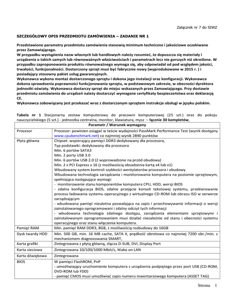 Załącznik nr 7 do SIWZ SZCZEGÓŁOWY OPIS PRZEDMIOTU ZAMÓWIENIA – ZADANIE NR 1 Przedstawione parametry przedmiotu zamówienia stanowią minimum techniczne i jakościowe oczekiwane przez Zamawiającego. W przypadku wystąpienia nazw własnych lub handlowych należy rozumieć, że dopuszcza się materiały i urządzenia o takich samych lub równoważnych właściwościach i parametrach lecz nie gorszych niż określone. W przypadku zaproponowania produktu równoważnego wymaga się, aby odpowiadał od pod względem jakości, trwałości, funkcjonalności. Dostarczony sprzęt musi być fabrycznie nowy (wyprodukowane w 2015 r. ) i posiadający stosowny pakiet usług gwarancyjnych. Wykonawca wykona montaż dostarczonego sprzętu i dokona jego instalacji oraz konfiguracji. Wykonawca dokona sprawdzenia poprawności funkcjonowania sprzętu, w podstawowym zakresie, w obecności dyrektora jednostki oświaty. Wykonawca dostarczy sprzęt do miejsc wskazanych przez Zamawiającego. Przy dostawie przedmiotu zamówienia do urządzeń należy dostarczyć wymagane certyfikaty bezpieczeństwa oraz deklarację CE. Wykonawca zobowiązany jest przekazać wraz z dostarczonym sprzętem instrukcje obsługi w języku polskim. Tabela nr 1 Stacjonarny zestaw komputerowy do pracowni komputerowej (25 szt.) oraz do pokoju nauczycielskiego (5 szt.) - jednostka centralna, monitor, klawiatura, mysz – łącznie 30 kompletów, Parametr / Warunek wymagany Procesor Płyta główna Pamięć RAM Dysk twardy HDD Procesor: powinien osiągać w teście wydajności PassMark Performance Test (wynik dostępny www.cpubenchmark.net) co najmniej wynik 2890 punktów Chipset: wspierający pamięci DDR3 dedykowany dla procesora, Typ podstawki: dedykowany dla procesora Min. 6 portów SATA3 Min. 2 porty USB 3.0 Min. 6 portów USB 2.0 (2 wyprowadzone na przód obudowy) Min. 2 x PCI Express x 16 (z możliwością obsadzenia kartą x4 lub x1) Wbudowany system kontroli szybkości wentylatorów procesora i obudowy. Wbudowana technologia zarządzania i monitorowania komputera na poziomie sprzętowym, spełniająca następujące wymogi: - monitorowanie stanu komponentów komputera CPU, HDD, wersji BIOS - zdalna konfiguracja BIOS, zdalne przejęcie konsoli tekstowej systemu, przekierowanie procesu ładowania systemu operacyjnego z wirtualnego CD-ROM lub obrazu ISO w serwerze zarządzającym - wbudowana pamięć nieulotna pozwalająca na zapis i przechowywanie informacji o wersji zainstalowanego oprogramowani i zdalny odczyt tych informacji - wbudowana technologia zdalnego dostępu, zarządzania elementami sprzętowymi i zainstalowanym oprogramowaniem musi działać niezależnie od stanu i obecności systemu operacyjnego oraz stanu włączenia komputera. Min. pamięć RAM DDR3, 8GB, z możliwością rozbudowy do 16GB Karta grafiki Min. 500 GB, min. 16 MB cache, SATA II, prędkość obrotowa co najmniej 7200 obr./min. z mechanizmem diagnozowania SMART, Zintegrowana z płytą główną, złącza D-SUB, DVI, Display Port Karta sieciowa Karta dźwiękowa Zintegrowana 10/100/1000 Mbit/s, Wake on LAN Zintegrowana BIOS W pamięci FlashROM, PnP - umożliwiający uruchomienie komputera z urządzenia podpiętego przez port USB (CD-ROM, DVD-ROM lub FDD) - pamięć CMOS musi umożliwiać zapis numeru inwentarzowego komputera (ASSET TAG) Strona 1 Klawiatura Mysz Klawiatura USB standard QWERTY producenta zestawu komputerowego Mysz optyczna USB producenta zestawu komputerowego, podkładka pod mysz optyczną Obudowa - Mini Tower - min. 2 x USB z przodu obudowy - obudowa musi posiadać zamknięcie na zamek lub kłódkę Min 350W, zapewniający spełnienie przez oferowany komputer wymagań normy Energy Star 5.0 Ze względu na następujące warunki: 1. Wszystkie komputery aktualnie znajdujące się w szkole pracują w oparciu o system operacyjny Windows (również pracownia informatyczna dostarczona w ramach programu ministerialnego – łącznie z oprogramowaniem serwera. 2. Realizowany program nauczania informatyki w Szkole Podstawowej oparty jest na systemie Windows. 3. Wszystkie programy edukacyjne jakie posiada szkole na nośnikach CD wymagają systemu operacyjnego Windows. 4. Wszystkie programy (sekretariat, świadectwa, plan lekcji, arkusz organizacyjny) jakie posiada szkoła zgodnie z umową licencyjną, pracują w oparciu o system operacyjny Windows Systemem operacyjnym jaki należy zainstalować na komputerach jest Windows 8.1 Professional bądź inny równoważny, który pozwoli na realizację warunków określonych w pkt 1-4. Ponadto zalecany system operacyjny powinien spełniać następujące warunki: preinstalowany na dysku twardym wraz z nośnikiem pozwalającym na ponowną instalację systemu niewymagającą wpisywania klucza rejestracyjnego lub rejestracji poprzez Internet czy telefon. Oprogramowanie producenta komputera w języku polskim do zdalnego zarządzania i diagnostyki komputera umożliwiające: Wykrywanie podłączonych do sieci komputerów, nawet, gdy są wyłączone. Grupowanie komputerów, dodawanie nowych komputerów i grup (zmiana nazwy), usuwanie wybranych, informowanie o statusie komputera (włączony/wyłączony) i czy jest wyposażony w technologię IAMT. Zdalne włączenie, restart i wyłączenie wybranych komputerów (hard reset i hard shutdown) oraz zdalne wejście do biosu, przechwycenie konsoli zdalnego komputera. Zdalny odczyt informacji o hardware poszczególnych komputerów (typ płyty głównej, procesor, ram, napędy, porty), sprawdzanie stanu SMART w HDD. Zdalny monitoring sprzętowy - odczyt: temperatury procesora, temperatury systemu, napięcia zasilającego, prędkości obrotowych wentylatorów. Zdalne odczytanie stanu oraz blokowanie na poziomie systemu operacyjnego hosta napędów FDD, CD oraz portów LPT, USB, COM. Identyfikacja komputera wg danych umieszczonych w BIOS, wyświetlenie wersji, zmiana daty. Zdalne rozłączanie wszystkich lub pojedynczego użytkownika. Zdalny monitoring zainstalowanych aplikacji 