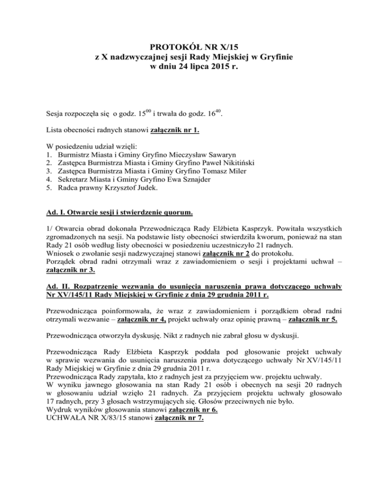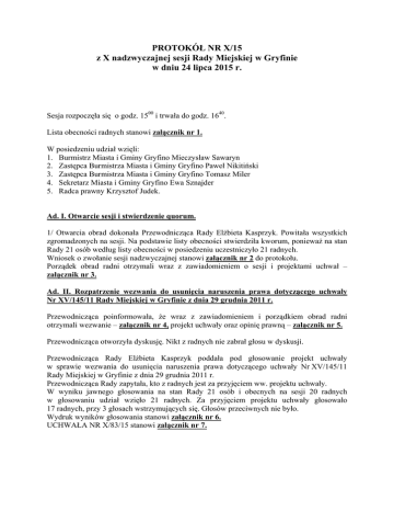 PROTOKÓŁ NR X/15 z X nadzwyczajnej sesji Rady Miejskiej w Gryfinie w dniu 24 lipca 2015 r. Sesja rozpoczęła się o godz. 1500 i trwała do godz. 1640. Lista obecności radnych stanowi załącznik nr 1. W posiedzeniu udział wzięli: 1. Burmistrz Miasta i Gminy Gryfino Mieczysław Sawaryn 2. Zastępca Burmistrza Miasta i Gminy Gryfino Paweł Nikitiński 3. Zastępca Burmistrza Miasta i Gminy Gryfino Tomasz Miler 4. Sekretarz Miasta i Gminy Gryfino Ewa Sznajder 5. Radca prawny Krzysztof Judek. Ad. I. Otwarcie sesji i stwierdzenie quorum. 1/ Otwarcia obrad dokonała Przewodnicząca Rady Elżbieta Kasprzyk. Powitała wszystkich zgromadzonych na sesji. Na podstawie listy obecności stwierdziła kworum, ponieważ na stan Rady 21 osób według listy obecności w posiedzeniu uczestniczyło 21 radnych. Wniosek o zwołanie sesji nadzwyczajnej stanowi załącznik nr 2 do protokołu. Porządek obrad radni otrzymali wraz z zawiadomieniem o sesji i projektami uchwał – załącznik nr 3. Ad. II. Rozpatrzenie wezwania do usunięcia naruszenia prawa dotyczącego uchwały Nr XV/145/11 Rady Miejskiej w Gryfinie z dnia 29 grudnia 2011 r. Przewodnicząca poinformowała, że wraz z zawiadomieniem i porządkiem obrad radni otrzymali wezwanie – załącznik nr 4, projekt uchwały oraz opinię prawną – załącznik nr 5. Przewodnicząca otworzyła dyskusję. Nikt z radnych nie zabrał głosu w dyskusji. Przewodnicząca Rady Elżbieta Kasprzyk poddała pod głosowanie projekt uchwały w sprawie wezwania do usunięcia naruszenia prawa dotyczącego uchwały Nr XV/145/11 Rady Miejskiej w Gryfinie z dnia 29 grudnia 2011 r. Przewodnicząca Rady zapytała, kto z radnych jest za przyjęciem ww. projektu uchwały. W wyniku jawnego głosowania na stan Rady 21 osób i obecnych na sesji 20 radnych w głosowaniu udział wzięło 21 radnych. Za przyjęciem projektu uchwały głosowało 17 radnych, przy 3 głosach wstrzymujących się. Głosów przeciwnych nie było. Wydruk wyników głosowania stanowi załącznik nr 6. UCHWAŁA NR X/83/15 stanowi załącznik nr 7. Ad. III. Informacja Burmistrza dotycząca protokołu kontroli prowadzonej przez Centralne Biuro Antykorupcyjne w dniach od 13 lutego 2014 r. do 13 listopada 2014 r. w sprawie prawidłowości zamówień publicznych w Urzędzie Miasta i Gminy w Gryfinie. Radni wraz z materiałami na sesję otrzymali na płytach CD materiały z kontroli prowadzonej przez Centralne Biuro Antykorupcyjne – załącznik nr 8. Burmistrz Miasta i Gminy Gryfino Mieczysław Sawaryn – w dniu dzisiejszym w trybie nadzwyczajnym zwołaliśmy sesję, ponieważ uważamy, że państwo radni, jako ciało ustawodawcze oraz społeczeństwo Gryfina powinni dowiedzieć się o problemach, o których mówiliśmy jako opozycja w poprzednich latach, o problemach, które teraz na Gminę Gryfino spadają. Mamy tutaj wiele zagadnień dotyczących kontroli prowadzonej przez CBA w kwestii wykonania zamówień publicznych na ul. Mieszka I, Pomorskiej oraz na nabrzeżu. W naszej ocenie te informacje mogą rodzić poważne skutki dla finansów publicznych Gminy Gryfino, stąd istnieje konieczność poinformowania o tym fakcie Rady Miejskiej w Gryfinie. Kontrola rozpoczęła się w 2014 r., 13 listopada w Urzędzie Miasta i Gminy został złożony raport CBA, na ten raport Burmistrz Miasta i Gminy Gryfino udzielił odpowiedzi 20 listopada, 2 lipca wpłynęło stanowisko CBA w sprawie uwag zgłoszonych przez Burmistrza Miasta i Gminy Gryfino. Zwróciłem się do CBA o udostępnienie mi całego zebranego materiału, dokonałem stosownego przeglądu akt sprawy, podpisałem protokół, jednocześnie zobowiązałem naczelnika Wydziału Planowania i Inwestycji do przedstawienia mi swoich argumentów dla wyjaśnienia całej sytuacji. Te argumenty zostały przez Naczelnika sporządzone, przekazałem je do CBA z prośbą o zamieszczenie w zebranym materiale dowodowym w celu ewentualnej oceny ich znaczenia dla prowadzonej sprawy. Kontrola CBA dla Gminy Gryfino skończyła się 10 lipca 2015 r., cały materiał faktograficzny macie państwo przekazany w formie elektronicznej do analizy, mam świadomość, że trzeba poświęcić tej analizie wiele dni, jestem w identycznej sytuacji jak państwo, te materiały otrzymałem dopiero w dniu 4 lipca, znając drogę obiegu dokumentów. Nie chciałbym wyrażać swoich sądów, bo te sądy wyrażałem wielokrotnie w towarzystwie pani radnej Kasprzyk, pani De La Torre, pana Nikitińskiego, pana Tomasza Namiecińskiego i radnych poprzedniej kadencji, którzy nie zgadzali się z systemem zarządzania Gminą Gryfino. Nie zawieram tu żadnych komentarzy, mam świadomość, że to jest pierwsza sesja, która rozpoczyna pewną dyskusję. Osiem miesięcy, wydaje się, że to jest dużo czasu, ale w trakcie tych ośmiu miesięcy nie zebraliśmy jeszcze wszystkich informacji, dotyczących zagrożeń panujących w Gminie Gryfino, będziemy z państwem rozmawiać również w najbliższej przyszłości o zagadnieniach związanych z podatkami PGE, które tak naprawdę, w 2014 r., jeszcze za poprzedniej władzy zostały przegrane. Będziemy z państwem rozmawiać o naruszeniach umowy z Marszałkiem Województwa dotyczących nabrzeża gryfińskiego i o skutkach decyzji Marszałka, który zobowiązał Gminę Gryfino do zwrotu kwoty ponad 1.300.000 zł VAT-u. Tych zagrożeń jest bardzo dużo, od samego początku apeluję do pracowników Urzędu Miasta i Gminy Gryfino, żeby te wszystkie niebezpieczeństwa przedstawić. Większość z państwa wie, że największym zagrożeniem dla gminy jest niekontrolowane działanie, związane z egzekwowaniem zobowiązań wobec naszej gminy. Chcemy to wszystko zdiagnozować, pokończyć i przedstawić państwu uczciwy raport z zagrożeń i ewentualnych wydatków w przyszłości. Oddaję państwu głos, przekazaliśmy dokumenty, liczymy, że Rada w tej kwestii będzie chciała otrzymać albo od nas odpowiedzi, albo wymienić swoje poglądy. Radny Rafał Guga