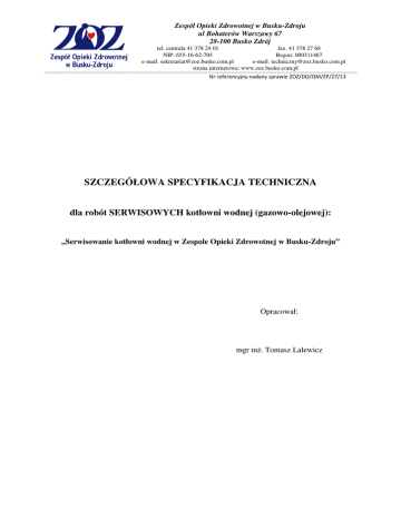 Zespół Opieki Zdrowotnej w Busku-Zdroju ul Bohaterów Warszawy 67 28-100 Busko Zdrój tel. centrala 41 378 24 01 fax. 41 378 27 68 NIP: 655-16-62-705 Regon: 000311467 e-mail: [email protected] e-mail: [email protected] strona internetowa: www.zoz.busko.com.pl Nr referencyjny nadany sprawie ZOZ/DO/OM/ZP/27/13 SZCZEGÓŁOWA SPECYFIKACJA TECHNICZNA dla robót SERWISOWYCH kotłowni wodnej (gazowo-olejowej): ,,Serwisowanie kotłowni wodnej w Zespole Opieki Zdrowotnej w Busku-Zdroju” Opracował: mgr inŜ. Tomasz Lalewicz Zespół Opieki Zdrowotnej w Busku-Zdroju ul Bohaterów Warszawy 67 28-100 Busko Zdrój tel. centrala 41 378 24 01 fax. 41 378 27 68 NIP: 655-16-62-705 Regon: 000311467 e-mail: [email protected] e-mail: [email protected] strona internetowa: www.zoz.busko.com.pl Nr referencyjny nadany sprawie ZOZ/DO/OM/ZP/27/13 Spis treści SST- ROBOTY SERWISOWE KOTŁOWNI WODNEJ.................................................................................... 2 1. WSTĘP.............................................................................................................................................. 2 1.1. Przedmiot Szczegółowej Specyfikacji Technicznej. .................................................................. 2 1.2. Zakres stosowania Szczegółowej Specyfikacji Technicznej. ..................................................... 2 1.3. Zakres robót objętych Szczegółowej Specyfikacji Technicznej................................................. 2 1.4. Wymagania dotyczące prowadzenia prac serwisowych. ......................................................... 4 2. WYPOSAŻENIE KOTŁOWNI .............................................................................................................. 4 3. MATERIAŁY ...................................................................................................................................... 4 4. SPRZĘT ............................................................................................................................................. 5 5. TERMIN REALIZACJI ......................................................................................................................... 5 6. WARUNKI WYBORU OFERTY ........................................................................................................... 5 7. WARUNKI PŁATNOŚCI...................................................................................................................... 5 1 Zespół Opieki Zdrowotnej w Busku-Zdroju ul Bohaterów Warszawy 67 28-100 Busko Zdrój tel. centrala 41 378 24 01 fax. 41 378 27 68 NIP: 655-16-62-705 Regon: 000311467 e-mail: [email protected] e-mail: [email protected] strona internetowa: www.zoz.busko.com.pl Nr referencyjny nadany sprawie ZOZ/DO/OM/ZP/27/13 SST- ROBOTY SERWISOWE KOTŁOWNI WODNEJ 1. WSTĘP 1.1. Przedmiot Szczegółowej Specyfikacji Technicznej. Przedmiotem niniejszej szczegółowej specyfikacji technicznej (SST) są wymagania dotyczące serwisowania kotłowni wodnej (gazowo-olejowej) w budynku Zespołu Opieki Zdrowotnej w Busku-Zdroju. 1.2. Zakres stosowania Szczegółowej Specyfikacji Technicznej. Szczegółowa Specyfikacja Techniczna jest stosowana, jako dokument kontraktowy przy zlecaniu i realizacji robót wymienionych w punkcie 1.1. 1.3. Zakres robót objętych Szczegółowej Specyfikacji Technicznej. Roboty, których dotyczy specyfikacja, obejmują wszystkie czynności serwisowe kotłowni wykonywane na kotłowni głównej szpitala. Niniejsza specyfikacja techniczna związana jest z wykonaniem niŜej wymienionych robót: 1) Przegląd i konserwacja układów automatyki oraz palników jeden raz w miesiącu. Przegląd ma obejmować: a) sprawdzenie parametrów pracy kotłowni wodnej, b) sprawdzenie prawidłowości działania rozdzielni elektrycznej obsługującej kotły, c) sprawdzenie prawidłowości działania stacji zmiękczania wody, d) sprawdzenie parametrów nastaw palników, e) czyszczenie i regulacji palników, f) kontrolę pracy pomp obiegowych w trybie automatycznym i ręcznym g) sprawdzenie działania aktywnego systemu bezpieczeństwa instalacji gazowej GAZEX. h) sprawdzenie elementów termoizolacyjnych kotła i) sprawdzenie działania urządzeń zabezpieczających (zawory bezpieczeństwa, STB, czujnik minimalnego poziomu wody w kotle) 2 Zespół Opieki Zdrowotnej w Busku-Zdroju ul Bohaterów Warszawy 67 28-100 Busko Zdrój tel. centrala 41 378 24 01 fax. 41 378 27 68 NIP: 655-16-62-705 Regon: 000311467 e-mail: [email protected] e-mail: [email protected] strona internetowa: www.zoz.busko.com.pl Nr referencyjny nadany sprawie ZOZ/DO/OM/ZP/27/13 j) likwidacji drobnych przecieków k) sprawdzenie szczelności instalacji gazowej wraz z ewentualnym jej uszczelnieniem i wystawieniem osobnego protokołu dla tego typu badań. l) regulacji i kontroli systemu sterowania (automatyki kotłów) m) kontrola naczyń przeponowych (sprawdzenie ciśnienia po stronie powietrza) n) sporządzanie dla Zamawiającego protokołów z przeprowadzonych przeglądów wraz z wynikami pomiarów i zaleceniami do wykonania. 2) Ponadto obowiązkiem serwisu jest: a) zapewnienie wykwalifikowanej obsługi technicznej posiadającej niezbędne uprawnienia do realizacji zamówienia, osoby serwisujące kotłownie muszą posiadać autoryzację producentów serwisowanych kotłów, b) posiadanie uprawnień producenta urządzeń De Dietrich w zakresie napraw gwarancyjnych oraz bieŜących czynności serwisowych, c) zapewnienie wszelkich niezbędnych narzędzi i środków do realizacji zamówienia, d) typowanie urządzeń kotłowni do remontu lub wymiany, e) sporządzenie kosztorysu dla Zamawiającego w przypadku konieczności wymiany uszkodzonych urządzeń, f) obecność serwisu w trakcie corocznego dozoru kotła przez Urząd Dozoru Technicznego. g) czyszczenie płomieniówek 1 raz na pół roku h) zapewnienie pełnego 24 godzinnego serwisu przez 365 dni w roku, i) sporządzenia na Ŝądanie zamawiającego lub co najmni