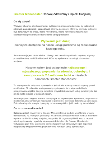 Greater Manchester Rozwój Zdrowotny i Opieki Socjalnej Co się dzieje? Wszyscy chcemy, aby Manchester był lepszym miejscem do życia, by ludzie byli zdrowsi, zamożniejsi i szczęśliwsi. Wiemy, że rzeczy, które by pomogły ludziomy być zdrowszymi to praca, dobre mieszkania, dobre konekcje z rodziną i ze społecznością oraz także odpowiednie usługi publiczne. Wyzwanie jest duże; pieniądze dostępne na nasze usługi publiczne są redukowane każdego roku. Jednak okazja jest także wielka i dlatego też zawarliśmy układ z rządem, abyśmy przejęli kontrolę nad £6 miliardami, które są wydawane na usługi zdrowotne i socjalne. Naszym celem jest osiągnięcie najlepszego i najszybszego poprawienia zdrowia, dobrobytu i samopoczucia 2.8 milionów ludzi w miastach i ośrodkach Greater Manchester. Tu się wyzwania związane z pieniędzmi jednak nie kończą – nadal stajemy przed obniżeniem £2 miliardów w ciągu następnych pięciu lat – więc nadal będą podejmowane ciężkie decyzje odnośnie przyszłości pewnych usług publicznych, tak jak to miało miejsce w ostanich latach. Jednak poprzez objęcie kontroli nad tym jak są te pieniądze wydawane, daje nam to możliwość, aby spróbować rozwiązać te problemy, które nas dotykały już jakiś czas. Potrzebna będzie energia i pomysły od nas wszystkich, jeśli miało by to zadziałać. Co to oznacza dla mnie? Dziesięć miast zawartych w Greater Manchester już podjęło współpracę w wielu dziedzinach, np. transport publiczny. W zamian za objęcie kontroli nad £6 milardami wydane na NHS i opiekę socjalną, wszystkie 37 organizacji NHS wraz z radami miast wystosowały i zgodziły się na pięcioletni plan dla Greater Manchester, wytyczając przy tym, jak można pomóc ludziom być zdrowszymi i jak zapewnić bezpieczną długoterminową przyszłość dla naszych usług społecznych. Są cztery główne obszary zmian. 1. Zacznij dobrze, żyj dobrze, starzej się dobrze – bardziej zapobiegaj złemu zdrowiu Wielu ludzi żyjących w Greater Manchester nie są zdrowi – niektórzy cierpią na bardzo złe schodrzenia; różni się to w stosunku od miejsca zamieszkania. Ogólnie odnotowaną mamy słabszą średnią zdrowotną od ogólnej średniej w Zjednoczonym Królestwie. Na przykład, schorzenia serca lub rak dotykają więcej ludzi w Greater Manchester niż w większości innych miejsc w Zjednoczonym Królestwie. Złe zdrowie może być spowodowane wieloma czynnikami takimi jak bezrobocie, długi, samotność, zatrucie powietrza, palenie i przez to co jesz lub pijesz. Jest wiele także innych czynników, które wpływają na zdrowie, ale my chcemy zmienić te, na które możemy mieć wpływ. Razem z Wami, Waszymi rodzinami i społecznością, chcemy stworzyć lepsze usługi, takie które by były dopasowane do naszych potrzeb. Tak samo chcemy być w stanie podejmować lepsze wybory odnośnie zdrowia i samopoczucia i słuchać Waszych pomysłów odnośnie realizacji tych rzeczy. 2. Lepsza współpraca lokalnych usług społecznych W wielu częściach Greater Manchester lokalne organizacje już podjęły lepszą współpracę ze sobą. Chcemy to rozwinąć dalej wraz z lekarzami GP, lekarzami szpitalnymi, pielęgniarkami/pielęgniarzami oraz z innymi profesjonalistami branży zdrowotnej, by wraz z opieką socjalną i grupami charytatywnymi stworzyć Local Care Organisations (Organizacje Opieki Lokalnej), gdzie szpitale byłyby jedynie zaangażowane w potrzebie opieki specjalistycznej. 3. Bliższa współpraca szpitali Lekarze, pielęgniarki/pielęgniarze oraz inni profesjonaliści opieki zdrowotnej i socjalnej posiadają umiejętności i doświadczenie, które winno być bardziej rozpowszechnione w obrębie Greater Manchester, tak aby każdy mógł czerpać równomierne korzyści z wysokiego standartu opieki. Byłoby to zbudowane w oparciu o historię rozprowadzenia najlepszych praktyk we wszystkich z naszych szpitali – zapewnienie lepszego standartu opieki, osadzanie personelu w jednostkach szpitalnych, co pozwoli na dalsze szkolenia personelu, wliczając w to prace specjalistyczne. Jakoże więcej rutynowej opieki jest zapewniane w obrębie społeczności – bliżej domostw – większa liczba szpitali wówczas się może skoncentrować na zapewnieniu opieki specjalistycznej i krytycznej, tak aby ludzie mogli być leczeni oraz objęci opięką we właściwych ku temu miejscach. 4. Dzielenie się budynkami, rolami, pomysłami i sposobami pracy Wiele jest sposobów na rozdzielenie rzeczy w sektorze publicznym. To może oznaczać dzielenie się budynkami, tak by były one lepiej użytkowane, używanie tej samej technologii, tworzenie miejsc pracy w opiece zdrowotnej i socjalnej, lub nawet w jeszcze szerszym mniemaniu, spojrzenie na najlepsze pomysły wraz z wdrażaniem ich w różnych częsciach Greater Manchester. Wiele z tych rzeczy już mogą się odbywać w Waszym otoczeniu i one się nie zmienią. My patrzymy jak się dzielić najlepszymi pomysłami, wraz z sposobami pracy, by je wtem zaaplikować w obrębie Greater Manchester. W czym rzecz? Długoterminowe zdrowie wraz z dobrym samopoczuciem ludzi może się polepszyć poprzez nowe relacje pomiędzy ludźmi a usługami, z których korzystają. Jeśli chcemy dłogoterminowo poprawić zdrowie w Greater Manchester oraz ochronić przyszłość naszych usług publicznych, musimy nakreślić nową umowę. Jeśli organizacje publiczne przejmą kontrolę w lokalnych obszarach, wówczas także poprosimy ludzi o większą kontrolę i odpowiedzialność za ich własne zdrowie. Na przykład organizacje publiczne będą: Upewniać się, że są lepsze udogodnienia w pobliższym otoczeniu, takie jak parki, otwarte przestrzenie, wypoczynek, bezpieczne trasy rowerowe oraz dobrej jakości mieszkania. Zapewniać łatwy i szybki dostęp do wysokiej jakości klinik GP, siedem dni w tygodniu na badania, diagnostykę, leczenie oraz zapobieganie chorobom tak wcześnie, jak to 