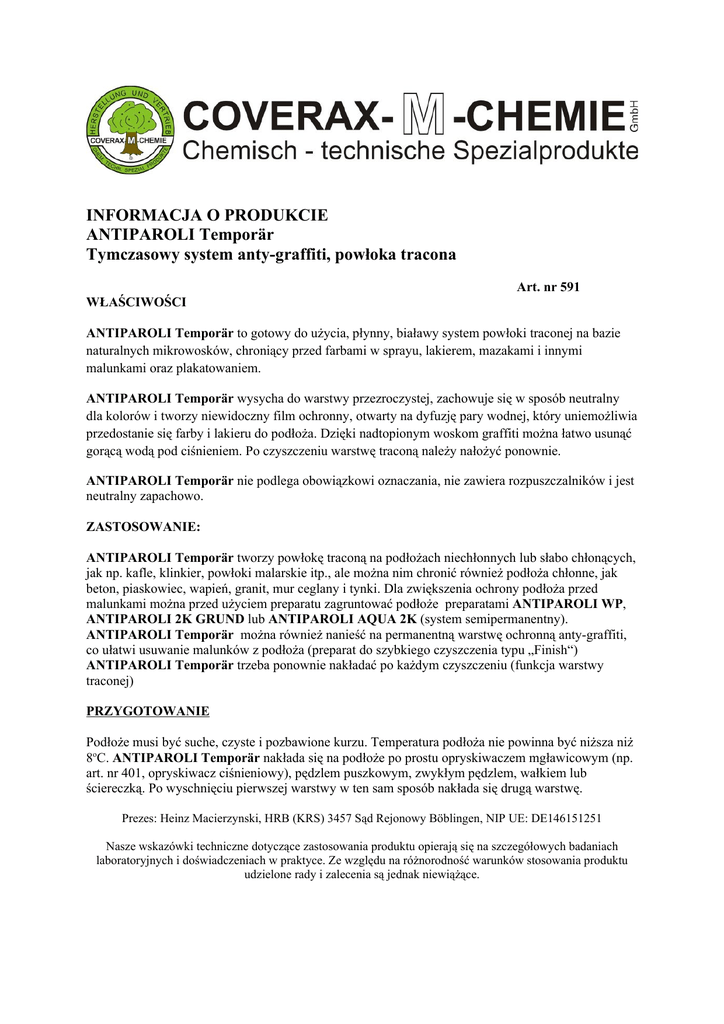INFORMACJA O PRODUKCIE ANTIPAROLI Temporär Tymczasowy system anty-graffiti, powłoka tracona Art. nr 591 WŁAŚCIWOŚCI ANTIPAROLI Temporär to gotowy do użycia, płynny, białawy system powłoki traconej na bazie naturalnych mikrowosków, chroniący przed farbami w sprayu, lakierem, mazakami i innymi malunkami oraz plakatowaniem. ANTIPAROLI Temporär wysycha do warstwy przezroczystej, zachowuje się w sposób neutralny dla kolorów i tworzy niewidoczny film ochronny, otwarty na dyfuzję pary wodnej, który uniemożliwia przedostanie się farby i lakieru do podłoża. Dzięki nadtopionym woskom graffiti można łatwo usunąć gorącą wodą pod ciśnieniem. Po czyszczeniu warstwę traconą należy nałożyć ponownie. ANTIPAROLI Temporär nie podlega obowiązkowi oznaczania, nie zawiera rozpuszczalników i jest neutralny zapachowo. ZASTOSOWANIE: ANTIPAROLI Temporär tworzy powłokę traconą na podłożach niechłonnych lub słabo chłonących, jak np. kafle, klinkier, powłoki malarskie itp., ale można nim chronić również podłoża chłonne, jak beton, piaskowiec, wapień, granit, mur ceglany i tynki. Dla zwiększenia ochrony podłoża przed malunkami można przed użyciem preparatu zagruntować podłoże preparatami ANTIPAROLI WP, ANTIPAROLI 2K GRUND lub ANTIPAROLI AQUA 2K (system semipermanentny). ANTIPAROLI Temporär można również nanieść na permanentną warstwę ochronną anty-graffiti, co ułatwi usuwanie malunków z podłoża (preparat do szybkiego czyszczenia typu „Finish“) ANTIPAROLI Temporär trzeba ponownie nakładać po każdym czyszczeniu (funkcja warstwy traconej) PRZYGOTOWANIE Podłoże musi być suche, czyste i pozbawione kurzu. Temperatura podłoża nie powinna być niższa niż 8oC. ANTIPAROLI Temporär nakłada się na podłoże po prostu opryskiwaczem mgławicowym (np. art. nr 401, opryskiwacz ciśnieniowy), pędzlem puszkowym, zwykłym pędzlem, wałkiem lub ściereczką. Po wyschnięciu pierwszej warstwy w ten sam sposób nakłada się drugą warstwę. Prezes: Heinz Macierzynski, HRB (KRS) 3457 Sąd Rejonowy Böblingen, NIP UE: DE146151251 Nasze wskazówki techniczne dotyczące zastosowania produktu opierają się na szczegółowych badaniach laboratoryjnych i doświadczeniach w praktyce. Ze względu na różnorodność warunków stosowania produktu udzielone rady i zalecenia są jednak niewiążące. Czyszczenie powierzchni przeprowadza się urządzeniem ciśnieniowym na gorącą wodę (ok. 65-80oC) pod ciśnieniem dopasowanym do podłoża. ANTIPAROLI temporär pod wpływem temperatury pęcznieje i odrywa się. Po czyszczeniu system ochronny trzeba nałożyć ponownie! Jak wszystkie produkty biologiczne, preparat ANTIPAROLI temporär ulega naturalnej biodegradacji.Preparatu nie należy opracowywać na nagrzanej powierzchni. DANE TECHNICZNE: Stosunek mieszanki: gotowa do użycia Warunki przygotowania: podłoże musi być suche i czyste Temperatura przygotowania: Temperatura produktu musi kształtować się na poziomie 3oC powyżej punktu rosy. Obiekt i otoczenie powinny mieć min. 8oC Schnięcie: po ok. 30 minutach system można ponownie opracowywać tym samym systemem. Zużycie: zależnie od podłożą ok. 40-100ml/m2 Usuwanie graffiti: Farby i plakaty czyścić gorącą wodą pod ciśnieniem. Materiały stałe i resztki farby wyłapać nad strumieniem wody. Wymyć potem otoczenie i podłogę z resztek farby. Czyszczenie narzędzi: spłukać wodą Przechowywanie: w nie otwieranym opakowaniu 12 miesięcy. Prezes: Heinz Macierzynski, HRB (KRS) 3457 Sąd Rejonowy Böblingen, NIP UE: DE146151251 Nasze wskazówki techniczne dotyczące zastosowania produktu opierają się na szczegółowych badaniach laboratoryjnych i doświadczeniach w praktyce. Ze względu na różnorodność warunków stosowania produktu udzielone rady i zalecenia są jednak niewiążące.