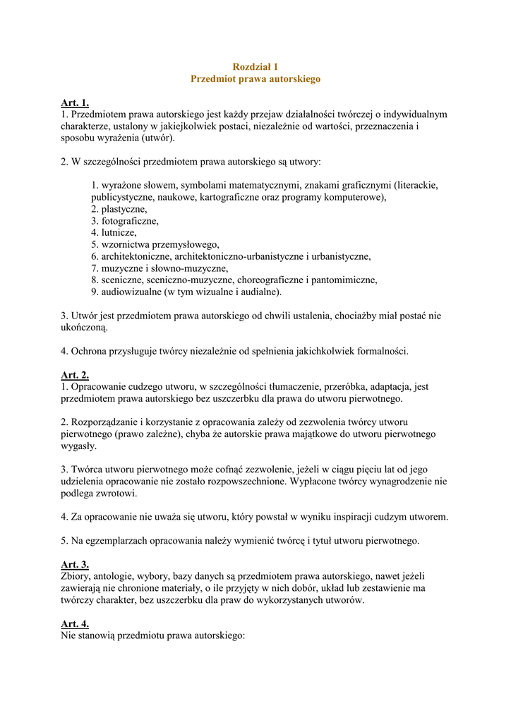 Rozdział 1 Przedmiot prawa autorskiego Art. 1. 1. Przedmiotem prawa autorskiego jest każdy przejaw działalności twórczej o indywidualnym charakterze, ustalony w jakiejkolwiek postaci, niezależnie od wartości, przeznaczenia i sposobu wyrażenia (utwór). 2. W szczególności przedmiotem prawa autorskiego są utwory: 1. wyrażone słowem, symbolami matematycznymi, znakami graficznymi (literackie, publicystyczne, naukowe, kartograficzne oraz programy komputerowe), 2. plastyczne, 3. fotograficzne, 4. lutnicze, 5. wzornictwa przemysłowego, 6. architektoniczne, architektoniczno-urbanistyczne i urbanistyczne, 7. muzyczne i słowno-muzyczne, 8. sceniczne, sceniczno-muzyczne, choreograficzne i pantomimiczne, 9. audiowizualne (w tym wizualne i audialne). 3. Utwór jest przedmiotem prawa autorskiego od chwili ustalenia, chociażby miał postać nie ukończoną. 4. Ochrona przysługuje twórcy niezależnie od spełnienia jakichkolwiek formalności. Art. 2. 1. Opracowanie cudzego utworu, w szczególności tłumaczenie, przeróbka, adaptacja, jest przedmiotem prawa autorskiego bez uszczerbku dla prawa do utworu pierwotnego. 2. Rozporządzanie i korzystanie z opracowania zależy od zezwolenia twórcy utworu pierwotnego (prawo zależne), chyba że autorskie prawa majątkowe do utworu pierwotnego wygasły. 3. Twórca utworu pierwotnego może cofnąć zezwolenie, jeżeli w ciągu pięciu lat od jego udzielenia opracowanie nie zostało rozpowszechnione. Wypłacone twórcy wynagrodzenie nie podlega zwrotowi. 4. Za opracowanie nie uważa się utworu, który powstał w wyniku inspiracji cudzym utworem. 5. Na egzemplarzach opracowania należy wymienić twórcę i tytuł utworu pierwotnego. Art. 3. Zbiory, antologie, wybory, bazy danych są przedmiotem prawa autorskiego, nawet jeżeli zawierają nie chronione materiały, o ile przyjęty w nich dobór, układ lub zestawienie ma twórczy charakter, bez uszczerbku dla praw do wykorzystanych utworów. Art. 4. Nie stanowią przedmiotu prawa autorskiego: 1. akty normatywne lub ich urzędowe projekty, 2. urzędowe dokumenty, materiały, znaki i symbole, 3. opublikowane opisy patentowe lub ochronne, 4. proste informacje prasowe. Art. 5. Przepisy ustawy stosuje się do utworów: 1. których twórca lub współtwórca jest obywatelem polskim lub 2. które zostały opublikowane po raz pierwszy na terytorium Rzeczypospolitej Polskiej albo równocześnie na tym terytorium i za granicą, lub 3. które zostały opublikowane po raz pierwszy w języku polskim, lub 4. których ochrona wynika z umów międzynarodowych. Art. 6. W rozumieniu ustawy: 1. utworem opublikowanym jest utwór, który za zezwoleniem twórcy został zwielokrotniony i którego egzemplarze zostały udostępnione publicznie, 2. opublikowaniem równoczesnym utworu jest opublikowanie utworu na terytorium Rzeczypospolitej Polskiej i za granicą w okresie trzydziestu dni od jego pierwszej publikacji, 3. utworem rozpowszechnionym jest utwór, który za zezwoleniem twórcy został udostępniony publicznie. Art. 7. Jeżeli umowy międzynarodowe, których Rzeczpospolita Polska jest stroną, przewidują dalej idącą ochronę, niż to wynika z ustawy, do nieopublikowanych utworów obywateli polskich albo do utworów opublikowanych po raz pierwszy na terytorium Rzeczypospolitej Polskiej lub równocześnie na terytorium Rzeczypospolitej Polskiej albo opublikowanych po raz pierwszy w języku polskim - stosuje się postanowienia tych umów.