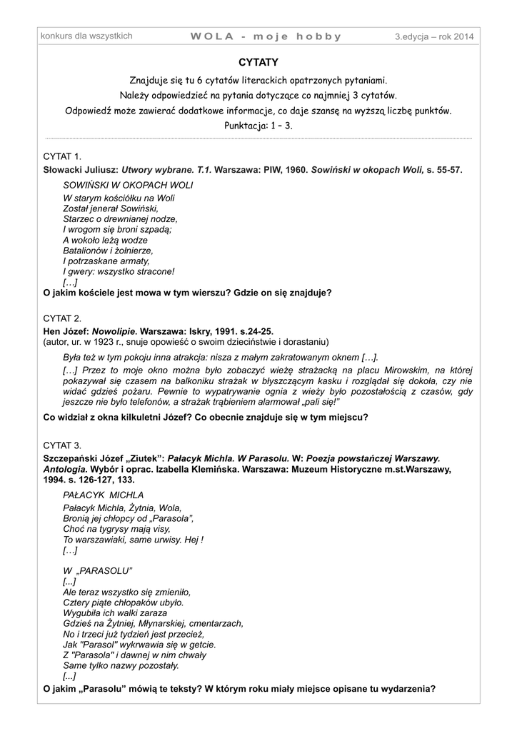 konkurs dla wszystkich WOLA - moje hobby 3.edycja – rok 2014 CYTATY Znajduje się tu 6 cytatów literackich opatrzonych pytaniami. Należy odpowiedzieć na pytania dotyczące co najmniej 3 cytatów. Odpowiedź może zawierać dodatkowe informacje, co daje szansę na wyższą liczbę punktów. Punktacja: 1 – 3. ….............................................................................................................................................................................................................................................................................................................. CYTAT 1. Słowacki Juliusz: Utwory wybrane. T.1. Warszawa: PIW, 1960. Sowiński w okopach Woli, s. 55-57. SOWIŃSKI W OKOPACH WOLI W starym kościółku na Woli Został jenerał Sowiński, Starzec o drewnianej nodze, I wrogom się broni szpadą; A wokoło leżą wodze Batalionów i żołnierze, I potrzaskane armaty, I gwery: wszystko stracone! […] O jakim kościele jest mowa w tym wierszu? Gdzie on się znajduje? CYTAT 2. Hen Józef: Nowolipie. Warszawa: Iskry, 1991. s.24-25. (autor, ur. w 1923 r., snuje opowieść o swoim dzieciństwie i dorastaniu) Była też w tym pokoju inna atrakcja: nisza z małym zakratowanym oknem […]. […] Przez to moje okno można było zobaczyć wieżę strażacką na placu Mirowskim, na której pokazywał się czasem na balkoniku strażak w błyszczącym kasku i rozglądał się dokoła, czy nie widać gdzieś pożaru. Pewnie to wypatrywanie ognia z wieży było pozostałością z czasów, gdy jeszcze nie było telefonów, a strażak trąbieniem alarmował „pali się!” Co widział z okna kilkuletni Józef? Co obecnie znajduje się w tym miejscu? CYTAT 3. Szczepański Józef „Ziutek”: Pałacyk Michla. W Parasolu. W: Poezja powstańczej Warszawy. Antologia. Wybór i oprac. Izabella Klemińska. Warszawa: Muzeum Historyczne m.st.Warszawy, 1994. s. 126-127, 133. PAŁACYK MICHLA Pałacyk Michla, Żytnia, Wola, Bronią jej chłopcy od „Parasola”, Choć na tygrysy mają visy, To warszawiaki, same urwisy. Hej ! […] W „PARASOLU” [...] Ale teraz wszystko się zmieniło, Cztery piąte chłopaków ubyło. Wygubiła ich walki zaraza Gdzieś na Żytniej, Młynarskiej, cmentarzach, No i trzeci już tydzień jest przecież, Jak "Parasol" wykrwawia się w getcie. Z "Parasola" i dawnej w nim chwały Same tylko nazwy pozostały. [...] O jakim „Parasolu” mówią te teksty? W którym roku miały miejsce opisane tu wydarzenia? konkurs dla wszystkich WOLA - moje hobby 3.edycja – rok 2014 CYTAT 4. Hłasko Marek: Opowiadania. Warszawa: Czytelnik, 1976. Baza Xxx, s.5-63 BAZA Xxx Rzucony z daleka od miasta transport, a mówiąc potocznie ba za , gniótł się na peryferiach Woli w zaułku ulicy Xxx. Stanowczo słowo ba za brzmiało zbyt szumnie i obszernie w odniesieniu do tego małego placyku, zatłoczonego samochodami od płotu do płotu. […] Samochody wyjeżdżały rano, pierwsze o świcie, ostatnie zjeżdżały nieraz późno w nocy, zabłocone, zakurzone, powracające z dalekiej drogi. Przetaczały się, dudniły donośnym basem na hali, […]. Osobno stały zisy, osobno dżemsy i osobno opelblitze. […] Z daleka, od ulicy Wolskiej nadciągał znajomy głos, zwykle wysoki i silny. Rustecki znał ten gong. Dżems! Od razu poznał, że silnik nie pracuje na wszystkich cylindrach. O jakiej bazie, oznaczonej w cytacie jako Xxx, pisze autor w tym opowiadaniu z 1951 r.? W jakim rejonie Woli znajduje się ulica, która dała nazwę bazie transportowej? CYTAT 5. Wiechecki Stefan: Wiech na 102. Warszawa: Wydaw. Polskiego Towarzystwa Wydawców Książek, 1987. Kudy mu do Kiercelaka!, s. 126-127. KUDY MU DO KIERCELAKA! - No i jak, panie Królik, byłeś pan w tem nowem Xxx na Wolskiej?[…] Podobnież lokal luksus [...]? - Faktycznie tak jest. Lokal wybudowany tak, że mucha nie siada. Najładniejszy podobnież Xxx w całej Polsce. W środku na głównych ścianach masz pan wymalowane w zielonym kolorze lanszafta w charakterze rebusów do nagrody. Mądrze to jest wykompinowane, żeby się publika w ogonkach nie nudziła. Nie stoisz już pan bezczynnie, nie kłócisz się pan z ludźmi, bo umysłową pracą jesteś pan zajęty, co który lanszaft przedstawia. […] Ale najwięcej mnie sie spodobało, że tak zwanego jarzynowego światła nie ma, tylko naturalne żaróweczki […] w leguralnych, ma się rozumieć, kryształowych kloszach całe oświetlenie lokalu stanowią. […] W tem wolskiem Xxx towary na wesoło oświetlone niedługo poleżą [...] Jaki obiekt, opisany w felietonie z 1956 r., a oznaczony w cytacie jako Xxx, tak podobał się panu Królikowi? Co obecnie tam się znajduje? CYTAT 6. Grochola Katarzyna: Zielone drzwi. Kraków: Wydaw. Literackie, 2010. s.141-142. (autobiograficzna opowieść autorki, ur. w 1957 r., która po maturze pracowała w szpitalu) Szpital Xxx jest szpitalem starym i rozległym. Ma kilka pawilonów rozsianych po całym parku, odległości między nimi są duże, prawie przy bramie jest kostnica. […] Najgorsze były dla mnie nocne dyżury. […] jeśli przywożono chorego, trzeba było zrobić natychmiast badania krwi i wtedy musiałam z nią wyjść w nocy z oddziału i iść ciemną aleją, gdzie wszystko straszyło, pod laboratorium, dzwonić na górę, ktoś łaskawie schodził, uchylał drzwi, brał ode mnie krew, potem drzwi się zatrzaskiwały, a ja ile tchu w nogach biegłam do siebie, nie patrząc na cienie, które jak żywe wyciągały po mnie swoje macki, ani na drzewa i krzaki, które próbowały mnie dotknąć, ani blade, niebieskawe światła, świecące trupim blaskiem z bloków operacyjnych. Jaki szpital, oznaczony w cytacie jako Xxx, był miejscem pierwszych zawodowych doświadczeń autorki? Jak stary jest ten szpital? ….................................................................................................................................................................................