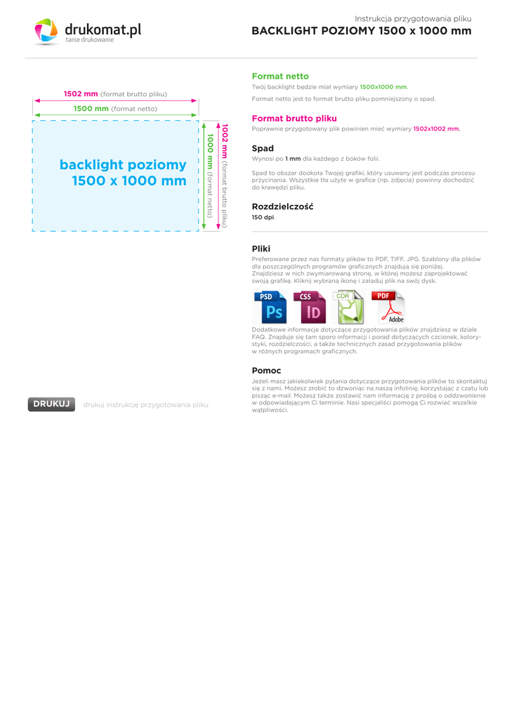 Instrukcja przygotowania pliku drukomat.pl tanie drukowanie BACKLIGHT POZIOMY 1500 x 1000 mm Format netto Twój backlight będzie miał wymiary 1500x1000 mm. 1502 mm (format brutto pliku) Format netto jest to format brutto pliku pomniejszony o spad. 1500 mm (format netto) drukomat.pl tanie drukowanie 1002 mm (format brutto pliku) 1000 mm (format netto) backlight poziomy 1500 x 1000 mm Format brutto pliku Poprawnie przygotowany plik powinien mieć wymiary 1502x1002 mm. Spad Wynosi po 1 mm dla każdego z boków folii. Spad to obszar dookoła Twojej grafiki, który usuwany jest podczas procesu przycinania. Wszystkie tła użyte w grafice (np. zdjęcia) powinny dochodzić do krawędzi pliku. Rozdzielczość 150 dpi. Pliki Preferowane przez nas formaty plików to PDF, TIFF, JPG. Szablony dla plików dla poszczególnych programów graficznych znajdują się poniżej. Znajdziesz w nich zwymiarowaną stronę, w której możesz zaprojektować swoją grafikę. Kliknij wybraną ikonę i załaduj plik na swój dysk. Dodatkowe informacje dotyczące przygotowania plików znajdziesz w dziale FAQ. Znajduje się tam sporo informacji i porad dotyczących czcionek, kolorystyki, rozdzielczości, a także technicznych zasad przygotowania plików w różnych programach graficznych. Pomoc DRUKUJ drukuj instrukcję przygotowania pliku Jeżeli masz jakiekolwiek pytania dotyczące przygotowania plików to skontaktuj się z nami. Możesz zrobić to dzwoniąc na naszą infolinię, korzystając z czatu lub pisząc e-mail. Możesz także zostawić nam informację z prośbą o oddzwonienie w odpowiadającym Ci terminie. Nasi specjaliści pomogą Ci rozwiać wszelkie wątpliwości. Instrukcja przygotowania pliku drukomat.pl tanie drukowanie BACKLIGHT PIONOWY 1000 x 1500 mm Format netto 1002 mm (format brutto pliku) Twój backlight będzie miał wymiary 1000x1500 mm. Format netto jest to format brutto pliku pomniejszony o spad. 1000 mm (format netto) drukomat.pl tanie drukowanie Format brutto pliku Poprawnie przygotowany plik powinien mieć wymiary 1002x1502 mm. Spad Wynosi po 1 mm dla każdego z boków folii. 1502 mm (format brutto pliku) 1500 mm (format netto) backlight pionowy 1000 x 1500 mm Spad to obszar dookoła Twojej grafiki, który usuwany jest podczas procesu przycinania. Wszystkie tła użyte w grafice (np. zdjęcia) powinny dochodzić do krawędzi pliku. Rozdzielczość 150 dpi. Pliki Preferowane przez nas formaty plików to PDF, TIFF, JPG. Szablony dla plików dla poszczególnych programów graficznych znajdują się poniżej. Znajdziesz w nich zwymiarowaną stronę, w której możesz zaprojektować swoją grafikę. Kliknij wybraną ikonę i załaduj plik na swój dysk. Dodatkowe informacje dotyczące przygotowania plików znajdziesz w dziale FAQ. Znajduje się tam sporo informacji i porad dotyczących czcionek, kolorystyki, rozdzielczości, a także technicznych zasad przygotowania plików w różnych programach graficznych. Pomoc DRUKUJ drukuj instrukcję przygotowania pliku Jeżeli masz jakiekolwiek pytania dotyczące przygotowania plików to skontaktuj się z nami. Możesz zrobić to dzwoniąc na naszą infolinię, korzystając z czatu lub pisząc e-mail. Możesz także zostawić nam informację z prośbą o oddzwonienie w odpowiadającym Ci terminie. Nasi specjaliści pomogą Ci rozwiać wszelkie wątpliwości.