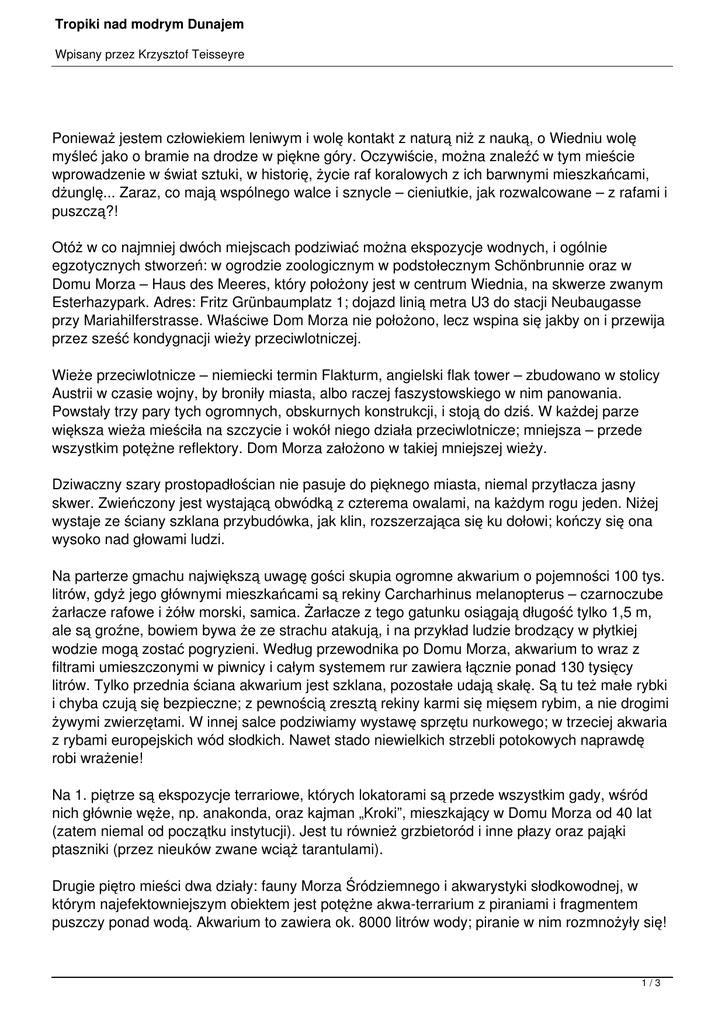 Tropiki nad modrym Dunajem Wpisany przez Krzysztof Teisseyre Ponieważ jestem człowiekiem leniwym i wolę kontakt z naturą niż z nauką, o Wiedniu wolę myśleć jako o bramie na drodze w piękne góry. Oczywiście, można znaleźć w tym mieście wprowadzenie w świat sztuki, w historię, życie raf koralowych z ich barwnymi mieszkańcami, dżunglę... Zaraz, co mają wspólnego walce i sznycle – cieniutkie, jak rozwalcowane – z rafami i puszczą?! Otóż w co najmniej dwóch miejscach podziwiać można ekspozycje wodnych, i ogólnie egzotycznych stworzeń: w ogrodzie zoologicznym w podstołecznym Schönbrunnie oraz w Domu Morza – Haus des Meeres, który położony jest w centrum Wiednia, na skwerze zwanym Esterhazypark. Adres: Fritz Grünbaumplatz 1; dojazd linią metra U3 do stacji Neubaugasse przy Mariahilferstrasse. Właściwe Dom Morza nie położono, lecz wspina się jakby on i przewija przez sześć kondygnacji wieży przeciwlotniczej. Wieże przeciwlotnicze – niemiecki termin Flakturm, angielski flak tower – zbudowano w stolicy Austrii w czasie wojny, by broniły miasta, albo raczej faszystowskiego w nim panowania. Powstały trzy pary tych ogromnych, obskurnych konstrukcji, i stoją do dziś. W każdej parze większa wieża mieściła na szczycie i wokół niego działa przeciwlotnicze; mniejsza – przede wszystkim potężne reflektory. Dom Morza założono w takiej mniejszej wieży. Dziwaczny szary prostopadłościan nie pasuje do pięknego miasta, niemal przytłacza jasny skwer. Zwieńczony jest wystającą obwódką z czterema owalami, na każdym rogu jeden. Niżej wystaje ze ściany szklana przybudówka, jak klin, rozszerzająca się ku dołowi; kończy się ona wysoko nad głowami ludzi. Na parterze gmachu największą uwagę gości skupia ogromne akwarium o pojemności 100 tys. litrów, gdyż jego głównymi mieszkańcami są rekiny Carcharhinus melanopterus – czarnoczube żarłacze rafowe i żółw morski, samica. Żarłacze z tego gatunku osiągają długość tylko 1,5 m, ale są groźne, bowiem bywa że ze strachu atakują, i na przykład ludzie brodzący w płytkiej wodzie mogą zostać pogryzieni. Według przewodnika po Domu Morza, akwarium to wraz z filtrami umieszczonymi w piwnicy i całym systemem rur zawiera łącznie ponad 130 tysięcy litrów. Tylko przednia ściana akwarium jest szklana, pozostałe udają skałę. Są tu też małe rybki i chyba czują się bezpieczne; z pewnością zresztą rekiny karmi się mięsem rybim, a nie drogimi żywymi zwierzętami. W innej salce podziwiamy wystawę sprzętu nurkowego; w trzeciej akwaria z rybami europejskich wód słodkich. Nawet stado niewielkich strzebli potokowych naprawdę robi wrażenie! Na 1. piętrze są ekspozycje terrariowe, których lokatorami są przede wszystkim gady, wśród nich głównie węże, np. anakonda, oraz kajman „Kroki”, mieszkający w Domu Morza od 40 lat (zatem niemal od początku instytucji). Jest tu również grzbietoród i inne płazy oraz pająki ptaszniki (przez nieuków zwane wciąż tarantulami). Drugie piętro mieści dwa działy: fauny Morza Śródziemnego i akwarystyki słodkowodnej, w którym najefektowniejszym obiektem jest potężne akwa-terrarium z piraniami i fragmentem puszczy ponad wodą. Akwarium to zawiera ok. 8000 litrów wody; piranie w nim rozmnożyły się! 1/3 Tropiki nad modrym Dunajem Wpisany przez Krzysztof Teisseyre W dziale śródziemnomorskim podziwiamy m.in. ośmiornice, rozgwiazdy, murenę, rekinka psiego, skorpenę, ukwiały... Trzecie piętro gości dział raf koralowych, skromny jak na nasze potrzeby, choć... akwarium rafowe ma pojemność 13 000 l. Na czwartym piętrze znajdujemy wejście do tzw. Tropenhaus, który po naszemu powinien chyba się nazywać tropikarium. Po przejściu szklanych drzwi, nagle nieprzyjemnie uderza gościa ciepło i wilgoć. Koszula flanelowa nie jest tu wskazana! Wchodzę na drewniany ganek, wszędzie mnóstwo zielonych tropikalnych roślin, barwne ptaki nie boją się ludzi. Znajduję schody wiodące w dół, wiszące mosty i ścianę szyb, za którą niewyraźnie majaczy widok miasta.... Jestem zatem w owej szklanej dobudówce; wewnątrz wydaje się ona wielką, stromo opadającą halą; okazuje się, iż ma wysokość trzech pięter. Niewielkie reflektory, ustawione trochę niżej niż górny pomost, przy szybach, świecą skośnie w górę; snopy światła i promieni cieplnych odbijają się od wypukłych, poziomych zwierciadeł nad nami. Ptak, lśniącogranatowy, z ogniście pomarańczową piersią i brzuchem, skubie włókna z czegoś w rodzaju wora, w jaki zawinięto donicę; potem próbuje skubać paski mojego plecaczka, gdy położyłem go przy ławce. Odlatuje tylko na chwilę, gdy dzieci nadchodzą i przechodzą, rozszczebiotaną czeredą pod wodzą przedszkolanek.To wschodniofrykański kuzyn szpaka, błyszczak wspaniały (Lamprospreo superbus, synonim – Lamprotornis superbus). Jest tu więcej ptaków z tego gatunku i są również inne. Piętro niżej odkrywam mały wodospad, tryskający ze „skały”, czyli ze ściany wieży, a mnie odkrywa ... mała małpa, biegająca tu swobodnie. Owa uistiti białoucha (Callitrhrix jacchus), przedstawicielka pazurczatek, należąca oczywiście do fauny południowoamerykańskiej, uff! weszła mi nawet na głowę, korzystając z chwilowego punktu widokowego. Wewnątrz tropikarium, w wolierach miały mieszkać owocożerne nietoperze, ale nie było ich tam; były tylko w klatce małpki z tego samego gatunku i w drugiej wielkie jaszczurki – legwany zielone. Na dole tropikarium spotykamy te same błyszczaki, raczące się suchą karmą z miski. W wielkim akwa-terrarium, w części nadwodnej, odkrytej, wygrzewają się ziemno-wodne żółwie, a w półmrocznej wodzie majestatycznie suną pacú – roślinożerne ryby, ogromne jak na kąsaczowate, nie reagując na towarzystwo mniejszych od nich pielęgnic – są to pielęgnice pawiookie z Ameryki Południowej 