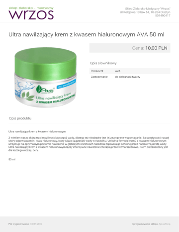 Sklep Zielarsko-Medyczny "Wrzos" Ul.Kolejowa 13 box 51, 10-284 Olsztyn 501490417 Ultra nawilżający krem z kwasem hialuronowym AVA 50 ml Cena: 10,00 PLN Opis słownikowy Producent AVA Zastosowanie do pielęgnacji twarzy Opis produktu Ultra nawilżający krem z kwasem hialuronowym Z wiekiem nasza skóra traci możliwości absorpcji wody, dlatego też niezbędne jest jej zewnętrzne wspomaganie. Za sprężystość naszej skóry odpowiada m.in. kwas hialuronowy, który wiąże cząsteczki wody w naskórku. Unikalna formuła kremu z kwasem hialuronowym utrzymuje na optymalnym poziomie nawilżenie w głębszych warstwach naskórka zapewniając ochronę przed nadmierną utratą wody. Ultra nawilżający krem z kwasem hialuronowym łączy intensywne nawilżenie z terapią przeciwzmarszczkową. Krem przeznaczony jest dla każdego rodzaju cery. 50 ml Plik wygenerowano: 03-03-2017 Powered by TCPDF (www.tcpdf.org) Oprogramowanie sklepu: AptusShop