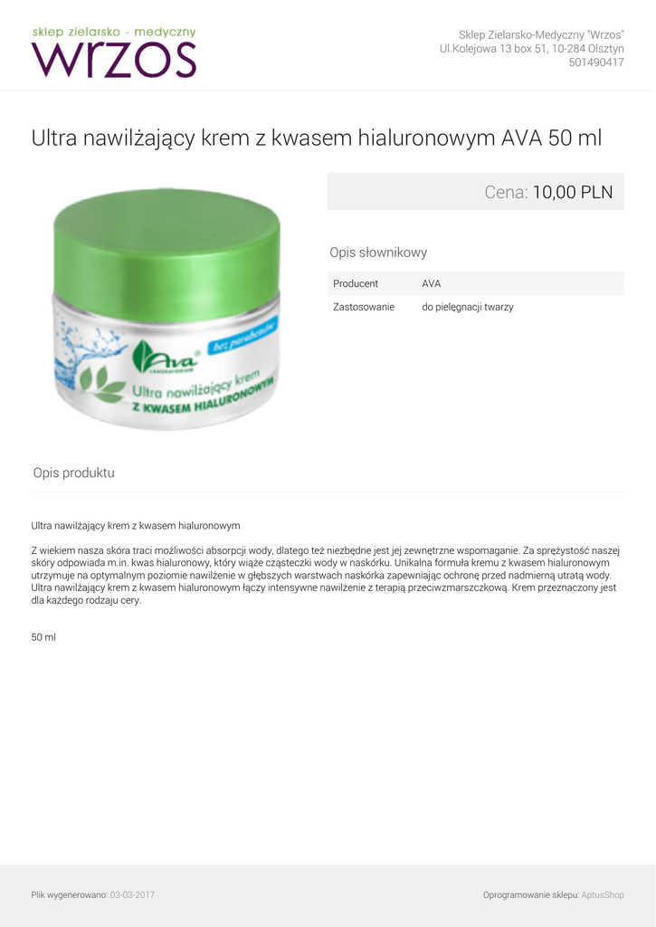 Ultra nawilżający krem z kwasem hialuronowym AVA