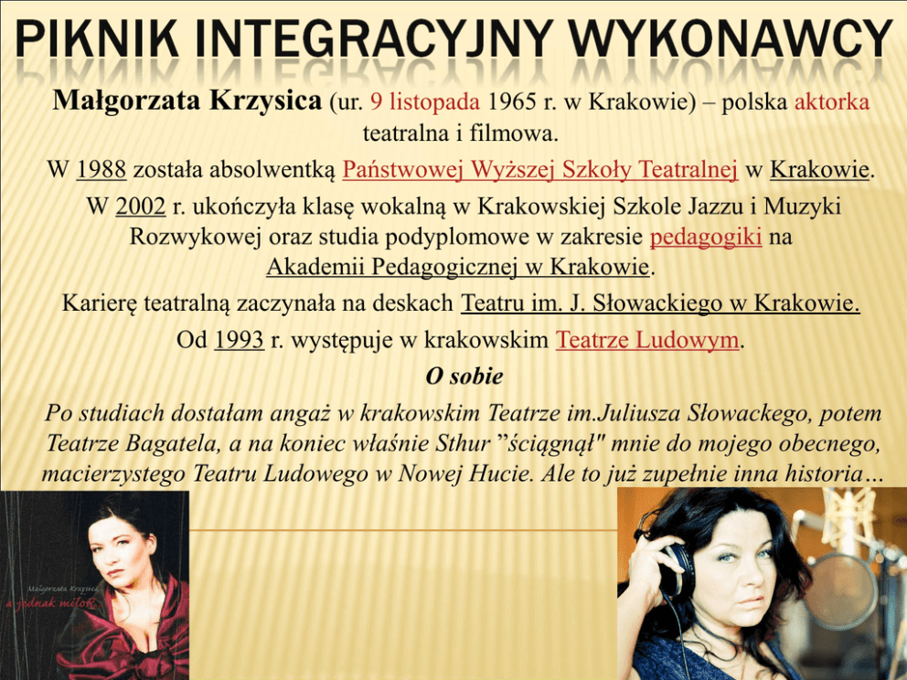 Małgorzata Krzysica (ur. 9 listopada 1965 r. w Krakowie) – polska aktorka teatralna i filmowa. W 1988 została absolwentką Państwowej Wyższej Szkoły Teatralnej w Krakowie. W 2002 r. ukończyła klasę wokalną w Krakowskiej Szkole Jazzu i Muzyki Rozwykowej oraz studia podyplomowe w zakresie pedagogiki na Akademii Pedagogicznej w Krakowie. Karierę teatralną zaczynała na deskach Teatru im. J. Słowackiego w Krakowie. Od 1993 r. występuje w krakowskim Teatrze Ludowym. O sobie Po studiach dostałam angaż w krakowskim Teatrze im.Juliusza Słowackego, potem Teatrze Bagatela, a na koniec właśnie Sthur ”ściągnął" mnie do mojego obecnego, macierzystego Teatru Ludowego w Nowej Hucie. Ale to już zupełnie inna historia… Marcin Tytko - (ur. 28.10.1986r w Krakowie), obecnie student II roku SUM na kier. Administracja Publiczna, podopieczny Fundacji Andrzeja Brandstattera i uczestnik warsztatów oraz koncertów muzyki góralskiej. Absolwent Szkoły Wokalno-Aktorskiej w Krakowie pod kierunkiem Pana Bogusława Kalarusa. Swoje pierwsze kroki jako wokalista stawiał w wieku dziecięcym. Wielokrotny laureat krakowskich festiwali. Laureat Festiwalu Zaczarowanej Piosenki. W roku 2001 trafił do Grupy Teatralnej „eMKa” Małgorzaty Krzysicy, gdzie występował kilka lat. Od 2004r. tancerz Studio Tańca NARCYZ. Laureat X Edycji Ogólnopolskiego Konkursu Nastolatków „Ośmiu Wspaniałych”. Grupa Rafała Kmity - kabaret założony w 1993 roku, działający w Krakowie przy Teatrze STU. Popularność Grupa zdobyła w pierwszej połowie lat 90., kiedy to programami Głusi jak pień, Trzy zdania o umieraniu oraz Popshow trzy razy z rzędu zdobyła najwyższe wyróżnienia na Przeglądzie Kabaretów PaKA. Ponadto realizacja telewizyjna programu Pop-show reprezentowała Polskę na Międzynarodowym Festiwalu Telewizyjnym w Montreux w 1996. Po roku 1997 Grupa odeszła od widowisk o charakterze kabaretowym w stronę własnych niepozbawionych humoru przedstawień teatralnych. Dużą popularność zdobył skecz Radio. Gość specjalny Pan Łukasz Szeliga - paraolimpijczyk narciarstwa zjazdowe, aktualnie trener kadry przygotowującej się do IP Soczi 2014. Członek Zarządu Polskiego Komitetu Paraolimpijskiego. Prezes Beskidzkiego Zrzeszenia Sportowo-Rehabilitacyjnego "Start" w Bielsku-Białej. Monika Kuszyńska - ur. się w Łodzi, polska piosenkarka solowa, autorka tekstów, była wokalistka zespołu Varius Manx. Ukończyła studia wyższe, została magistrem sztuki. Ze swoim pierwszym zespołem, Farenheit wydała singel „Film”. Podczas nagrywania tej piosenki zauważona została przez lidera Varius Manx Roberta Jansona. Pod koniec roku 2000 została wokalistką tego zespołu na miejsce Kasi Stankiewicz. W 2009 ukazał się album Beaty Bednarz pt. Pasja miłości, na której Kuszyńska zaśpiewała napisany przez siebie utwór, „Nowa rodzę się”. 2 czerwca z utworem „Ocaleni” wystąpiła podczas koncertu Premier na 49. KFPP w Opolu. W 2013 piosenkarka została reporterką od spraw trudnych w porannym magazynie telewizji TVN Dzień Dobry TVN. Wokalistka jest gospodynią cyklu przedstawiającego wzruszające, inspirujące lub dramatyczne historie ludzi .