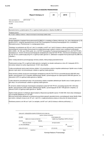 ELZAB RB 23 2015 KOMISJA NADZORU FINANSOWEGO Raport bieżący nr 23 / 2015 2015-12-02 Data sporządzenia: Skróc ona nazwa emitenta ELZAB Temat Zawiadomienie o przekroczeniu 5% w ogólnej liczbie głosów w Spółce ELZAB S.A. Podstawa prawna Art. 70 pkt 1 Ustawy o oferc ie - nabyc ie lub zbycie znac znego pakietu akcji Treść raportu: Zarząd Zakładów Urządzeń Komputerowych ELZAB S.A. z siedzibą w Zabrzu informuje, iż w dniu dzisiejszym tj. 02 grudnia 2015 r. otrzymał zawiadomienie od ALTUS Towarzystwo Funduszy Inwestycyjnych S.A. z siedzibą w Warszawie przy ul. Pankiewicza 3 o następującej treści: „Działając na podstawie art. 69 ust.1 pkt.1) w związku z art.87 ust.1 pkt 2) Ustawy o ofercie publicznej i warunkach wprowadzania instrumentów finansowych do zorganizowanego systemu obrotu oraz o spółkach publicznych (DZ.U.2005 r. Nr 184, poz.1539 z późn. zm.), ALTUS Towarzystwo Funduszy Inwestycyjnych S.A. („ALTUS TFI SA”), zawiadamia w imieniu funduszy inwestycyjnych zarządzanych przez ALTUS TFI SA., iż fundusze zarządzane przez ALTUS TFI S.A. przekroczyły próg 5% w ogólnej liczbie głosów w Zakładach Urządzeń Komputerowych ELZAB S.A. („Spółka”). Data i rodzaj zdarzenia powodującego zmianę udziału, której dotyczy zawiadomienie: Przekroczenie progu 5% w ogólnej liczbie głosów nastąpiło na skutek rozliczenia w dniu 30 listopada 2015 r. transakcji nabycia na rynku regulowanym 12 641 akcji Spółki. Liczba posiadanych akcji przed zmianą udziału i ich procentowy udział w kapitale zakładowym Spółki oraz o liczbie głosów z tych akcji i ich procentowym udziale w ogólnej liczbie głosów: Przed zmianą udziału fundusze inwestycyjne zarządzane przez ALTUS TFI S.A. posiadały łącznie 808 805 akcji Spółki, stanowiących 5,01% kapitału zakładowego Spółki, uprawniających do wykonywania 808 805 głosów, co stanowiło 4,97% w ogólnej liczbie głosów w Spółce. Liczba aktualnie posiadanych akcji i ich procentowy udział w kapitale zakładowym Spółki oraz o liczbie głosów z tych akcji i ich procentowym udziale w ogólnej liczbie głosów: Po zmianie udziału fundusze inwestycyjne zarządzane przez ALTUS TFI S.A. posiadają łącznie 821 446 akcji Spółki, stanowiących 5,09% kapitału zakładowego Spółki, uprawniających do 821 446 głosów w Spółce, co stanowi 5,04% w ogólnej liczbie głosów w Spółce. Ogólna liczba głosów na Walnym Zgromadzeniu Akcjonariuszy Spółki wynosi 16 282 930. Ilość akcji składająca się na kapitał zakładowy 16 137 050. Brak jest podmiotów zależnych od akcjonariuszy dokonujących zawiadomienia, posiadających akcje Spółki. Brak jest osób, o których mowa w art. 87 ust. 1 pkt 3 lit. c wyżej powołanej ustawy w stosunku do akcjonariuszy”. Podstawa prawna: art. 69 ust.1 pkt.1) w związku z art.87 ust.1 pkt 2) Ustawy o ofercie publicznej (...) ZAKŁADY URZĄDZEŃ KOMPUTEROWYCH ELZAB SA (pełna nazwa emitenta) Informatyka (inf) ELZAB (skróc ona nazwa emitenta) 41-813 (sektor wg. klasyfikac ji GPW w W-wie) Zabrze (kod poc ztowy) (miejscowość) ul. Kruczkowskiego 39 (ulica) (032) 272 20 21 (numer) 272 25 83 (telefon) (fax) Komisja Nadzoru Finansowego 1 ELZAB RB 23 2015 [email protected] www.elzab.c om.pl (e-mail) (www) 6480000255 270036336 (NIP) (REGON) PODPISY OSÓB REPREZENTUJĄCYCH SPÓŁKĘ Data Imię i Nazwisko Stanowisko/Funkc ja 2015-12-02 Jerzy Popławski Wic eprezes Zarządu 2015-12-02 Zbigniew Stanasiuk Członek Zarządu Podpis Komisja Nadzoru Finansowego 2