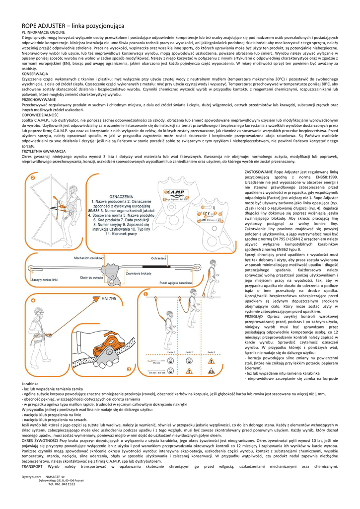 ROPE ADJUSTER – linka pozycjonująca PL INFORMACJE OGOLNE Z tego sprzętu mogą korzystać wyłącznie osoby przeszkolone i posiadające odpowiednie kompetencje lub też osoby znajdujące się pod nadzorem osób przeszkolonych i posiadających odpowiednie kompetencje. Niniejsza instrukcja nie umożliwia poznania technik pracy na wysokości, ani jakiegokolwiek podobnej działalności: aby moc korzystać z tego sprzętu, należy wcześniej przejść odpowiednie szkolenia. Praca na wysokości, wspinaczka oraz wszelkie inne sporty, do których uprawiania może być użyty ten produkt, są potencjalnie niebezpieczne. Nieprawidłowy wybór lub użycie, lub też nieprawidłowa konserwacja wyrobu, mogą spowodować uszkodzenia, poważne obrażenia lub śmierć. Wyrobu należy używać wyłącznie w opisany poniżej sposób; wyrobu nie wolno w żaden sposób modyfikować. Należy z niego korzystać w połączeniu z innymi artykułami o odpowiedniej charakterystyce oraz w zgodzie z normami europejskimi (EN), biorąc pod uwagę ograniczenia, jakimi obarczona jest każda pojedyncza część wyposażenia. W miarę możliwości sprzęt ten powinien być uważany za osobisty. KONSERWACJA Czyszczenie części wykonanych z tkaniny i plastiku: myć wyłącznie przy użyciu czystej wody z neutralnym mydłem (temperatura maksymalna 30°C) i pozostawić do swobodnego wyschnięcia, z dala od źródeł ciepła. Czyszczenie części wykonanych z metalu: myć przy użyciu czystej wody i wysuszyć. Temperatura: przechowywać w temperaturze poniżej 80°C, aby zachowane zostały skuteczność działania i bezpieczeństwo wyrobu. Czynniki chemiczne: wyrzucić wyrób w przypadku kontaktu z reagentami chemicznymi, rozpuszczalnikami lub paliwami, które mogłyby zmienić charakterystykę wyrobu. PRZECHOWYWANIE Przechowywać rozpakowany produkt w suchym i chłodnym miejscu, z dala od źródeł światła i ciepła, dużej wilgotności, ostrych przedmiotów lub krawędzi, substancji żrących oraz innych możliwych źródeł uszkodzeń. ODPOWIEDZIALNOŚĆ Spółka C.A.M.P., lub dystrybutor, nie ponoszą żadnej odpowiedzialności za szkody, obrażania lub śmierć spowodowane nieprawidłowym użyciem lub modyfikacjami wprowadzonymi do wyrobu. Użytkownik jest odpowiedzialny za zrozumienie i stosowanie się do instrukcji na temat prawidłowego i bezpiecznego korzystania z wszelkich wyrobów dostarczonych przez lub poprzez firmę C.A.M.P. spa oraz za korzystanie z nich wyłącznie do celów, do których zostały przeznaczone, jak również za stosowanie wszystkich procedur bezpieczeństwa. Przed użyciem sprzętu, należy opracować sposób, w jaki w przypadku zagrożenia może zostać skutecznie i bezpiecznie przeprowadzona akcja ratunkowa. Są Państwo osobiście odpowiedzialni za swe działania i decyzje: jeśli nie są Państwo w stanie poradzić sobie ze związanym z tym ryzykiem i niebezpieczeństwem, nie powinni Państwo korzystać z tego sprzętu. TRZYLETNIA GWARANCJA Okres gwarancji niniejszego wyrobu wynosi 3 lata i dotyczy wad materiału lub wad fabrycznych. Gwarancja nie obejmuje: normalnego zużycia, modyfikacji lub poprawek, nieprawidłowego przechowywania, korozji, uszkodzeń spowodowanych wypadkami lub zaniedbaniem oraz użyciem, do którego wyrób nie został przeznaczony. ZASTOSOWANIE Rope Adjuster jest regulowaną linką pozycjonującą zgodną z normą EN358:1999. Urządzenie nie jest wyposażone w absorber energii i nie stanowi prawidłowego zabezpieczenia przed upadkiem z wysokości w przypadku, gdy współczynnik odpadnięcia (Factor) jest większy niż 1. Rope Adjuster może być używany zarówno jako linka opasująca (rys. 2) jak i lonża o regulowanej długości (rys. 4). Regulacji długości liny dokonuje się poprzez wciśnięcię języka zwalniającego blokadę. Aby skrócić pracującą linę wystarczy pociągnąć za wolny koniec liny. Zakotwienie liny powinno znajdować się powyżej położenia użytkownika, a jego wytrzymałość musi być zgodna z normą EN 795 (>15kN) Z urządzeniem należy używać wyłącznie kompatybilnych karabinków zgodnych z normą EN362 typu B. Sprzęt chroniący przed upadkiem z wysokości musi być tak dobrany i użyty, aby praca została wykonana w sposób minimalizujący możliwość upadku i długość potencjalnego spadania. Każdorazowo należy sprawdzać wolną przestrzeń poniżej użytkownikiem i jego miejscem pracy na wysokości, tak, aby w przypadku upadku nie doszło do uderzenia o podłoże bądź o inne przeszkody na drodze upadku. Uprząż/szelki bezpieczeństwa zabezpieczające przed upadkiem są jedynym dopuszczalnym środkiem obejmującym ciało, który może zostać użyty w systemie zabezpieczającym przed upadkiem. PRZEGLĄD Oprócz zwykłej kontroli wzrokowej przeprowadzanej przed, podczas i po każdym użyciu, niniejszy wyrób musi być sprawdzany przez posiadającą odpowiednie kompetencje osobę, co 12 miesięcy; przeprowadzenie kontroli należy zapisać w karcie wyrobu. Sprawdzić czytelność oznaczeń wyrobu. W przypadku którejś z poniższych wad, łącznik nie nadaje się do dalszego użytku: - korozja powodująca silne zmiany na powierzchni stali, (które nie znikają przy lekkim potarciu papierem ściernym) - luz lub wypadanie nitu ramienia karabinka - nieprawidłowe zaczepianie się zamka na korpusie karabinka - luz lub wypadanie ramienia zamka - ogólne zużycie korpusu powodujące znaczne zmniejszenie przekroju (rowek), obecność karbów na korpusie, jeśli głębokość karbu lub rowka jest szacowana na więcej niż 1 mm, - obecność pęknięć, w szczególności dotyczących osi obrotu ramienia - w przypadku ogniwa typu maillon rapide, trudności w ręcznym całkowitym dokręcaniu nakrętki W przypadku jednej z poniższych wad lina nie nadaje się do dalszego użytku: - nacięcia i/lub przepalenia na linie - nacięcia i/lub przepalenia na szwach. Jeśli wyrób lub któraś z jego części są zużyte lub wadliwe, należ