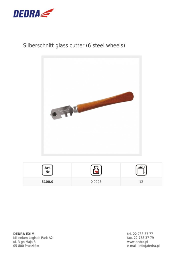 Silberschnitt glass cutter (6 steel wheels) S100.0 DEDRA EXIM Millenium Logistic Park A2 ul. 3-go Maja 8 05-800 Pruszków 0,0298 12 tel. 22 738 37 77 fax. 22 738 37 79 www.dedra.pl e-mail: [email protected]