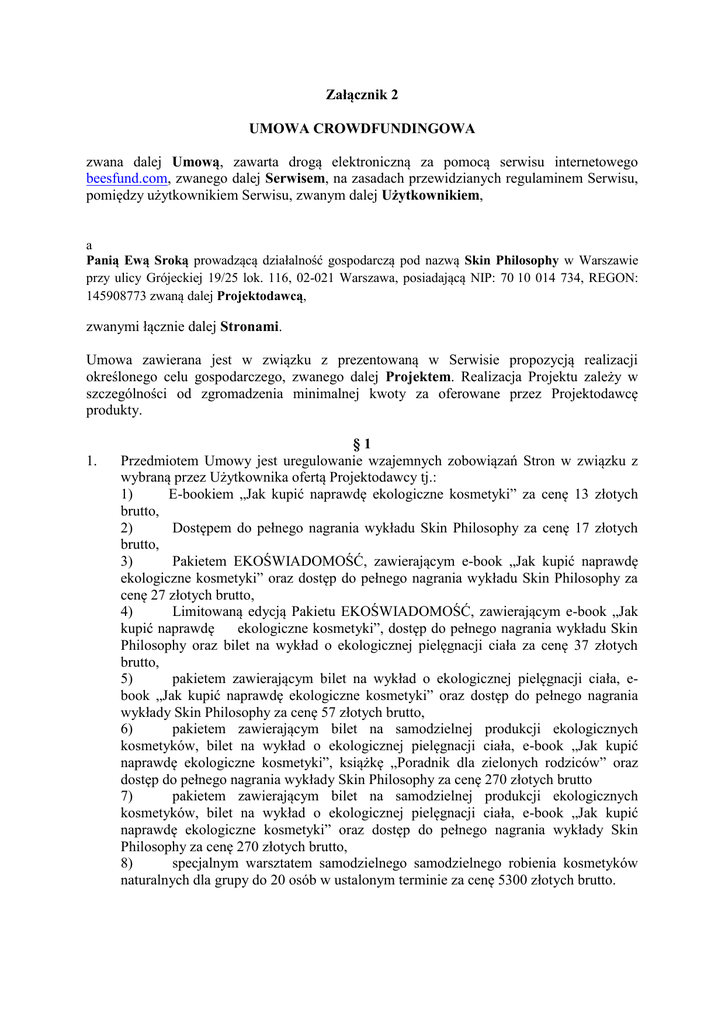 Załącznik 2 UMOWA CROWDFUNDINGOWA zwana dalej Umową, zawarta drogą elektroniczną za pomocą serwisu internetowego beesfund.com, zwanego dalej Serwisem, na zasadach przewidzianych regulaminem Serwisu, pomiędzy użytkownikiem Serwisu, zwanym dalej Użytkownikiem, a Panią Ewą Sroką prowadzącą działalność gospodarczą pod nazwą Skin Philosophy w Warszawie przy ulicy Grójeckiej 19/25 lok. 116, 02-021 Warszawa, posiadającą NIP: 70 10 014 734, REGON: 145908773 zwaną dalej Projektodawcą, zwanymi łącznie dalej Stronami. Umowa zawierana jest w związku z prezentowaną w Serwisie propozycją realizacji określonego celu gospodarczego, zwanego dalej Projektem. Realizacja Projektu zależy w szczególności od zgromadzenia minimalnej kwoty za oferowane przez Projektodawcę produkty. 1. §1 Przedmiotem Umowy jest uregulowanie wzajemnych zobowiązań Stron w związku z wybraną przez Użytkownika ofertą Projektodawcy tj.: 1) E-bookiem „Jak kupić naprawdę ekologiczne kosmetyki” za cenę 13 złotych brutto, 2) Dostępem do pełnego nagrania wykładu Skin Philosophy za cenę 17 złotych brutto, 3) Pakietem EKOŚWIADOMOŚĆ, zawierającym e-book „Jak kupić naprawdę ekologiczne kosmetyki” oraz dostęp do pełnego nagrania wykładu Skin Philosophy za cenę 27 złotych brutto, 4) Limitowaną edycją Pakietu EKOŚWIADOMOŚĆ, zawierającym e-book „Jak kupić naprawdę ekologiczne kosmetyki”, dostęp do pełnego nagrania wykładu Skin Philosophy oraz bilet na wykład o ekologicznej pielęgnacji ciała za cenę 37 złotych brutto, 5) pakietem zawierającym bilet na wykład o ekologicznej pielęgnacji ciała, ebook „Jak kupić naprawdę ekologiczne kosmetyki” oraz dostęp do pełnego nagrania wykłady Skin Philosophy za cenę 57 złotych brutto, 6) pakietem zawierającym bilet na samodzielnej produkcji ekologicznych kosmetyków, bilet na wykład o ekologicznej pielęgnacji ciała, e-book „Jak kupić naprawdę ekologiczne kosmetyki”, książkę „Poradnik dla zielonych rodziców” oraz dostęp do pełnego nagrania wykłady Skin Philosophy za cenę 270 złotych brutto 7) pakietem zawierającym bilet na samodzielnej produkcji ekologicznych kosmetyków, bilet na wykład o ekologicznej pielęgnacji ciała, e-book „Jak kupić naprawdę ekologiczne kosmetyki” oraz dostęp do pełnego nagrania wykłady Skin Philosophy za cenę 270 złotych brutto, 8) specjalnym warsztatem samodzielnego samodzielnego robienia kosmetyków naturalnych dla grupy do 20 osób w ustalonym terminie za cenę 5300 złotych brutto. 2. 3. 4. 5. 6. 1. 2. 1. 2. 3. 4. 5. Umowa zostaje zawarta z chwilą dokonania płatności przez Użytkownika za wybrane przez niego produkty Projektodawcy. Umowa wejdzie w życie pod warunkiem, że łączna kwota wpłat dokonanych przez użytkowników Serwisu za oferowane przez Projektodawcę produkty, przekroczy kwotę 10 800 zł, o czym Użytkownik zostanie niezwłocznie powiadomiony przez Projektodawcę. W razie niespełnienia się warunku, o którym mowa w ust. 3 powyżej, Umowa rozwiązuje się z chwilą zakończenia gromadzenia środków na realizację Projektu w Serwisie. Kwota wpłacona przez Użytkownika stanowi zaliczkę na poczet ceny za wybrane z oferty Projektodawcy produkty. Projektodawca nie może uzależniać spełnienia zaoferowanych przez siebie świadczeń wybranych w Serwisie przez Użytkownika od dokonania jakichkolwiek dodatkowych wpłat, niezależnie od tytułu płatności chyba, że Umowa stanowi inaczej. §2 Wejście w życie Umowy oznacza zobowiązanie Projektodawcy do dostarczenia wybranego przez Użytkownika produktu, w terminie 180 dni od daty zakończenia Projektu. Przed wysyłką produktu do Użytkownika, Projektodawca zawiadomi Użytkownika o zamiarze wysłania produktu na znany Projektodawcy adres zamieszkania Użytkownika lub adres poczty elektronicznej Użytkownika, przesyłając stosowną wiadomość pocztą elektroniczną. Użytkownik uprawniony jest do podania Projektodawcy innego adresu dostawy produktu, przesyłając stosowną informację pocztą elektroniczną, w terminie 2 dni od daty zawiadomienia przez Projektodawcę. §3 Użytkownikowi przysługuje prawo do odstąpienia od Umowy w terminie 10 dni od dnia dostarczenia zamówionych przez niego produktów poprzez przesłanie oświadczenia o odstąpieniu od Umowy na adres Projektodawcy. Zwracany towar nie może nosić śladów użytkowania i nie może być zniszczony, należy również dołączyć oświadczenie o odstąpieniu od umowy. Koszt przesyłki zwracanego towaru ponosi Użytkownik. W przypadku odstąpienia od Umowy Użytkownik jest zobowiązany do odesłania otrzymanych produktów na adres Projektodawcy, z wykorzystaniem usług Poczty Polskiej lub firmy kurierskiej uzgodnionej z Projektodawcą, w terminie 14 dni od dnia otrzymania przez Projektodawcę oświadczenia o odstąpieniu od Umowy, zaś odnośnie produktów dostarczonych droga elektroniczną, do zniszczenia/usunięcia wszelkich posiadanych egzemplarzy/kopii produktu oraz usunięcia produktu Projektodawcy z nośników informatycznych (takich jak np. dyski twarde, pamięć flash, poczta elektroniczna). Projektodawca zobowiązany jest do zwrotu Użytkownikowi, który złożył oświadczenie o odstąpieniu od Umowy, całej uiszczonej dotychczas przez Użytkownika kwoty przedpłaty. W przypadku odstąpienia przez Użytkownika od Umowy Projektodawca w terminie 14 dni od dnia otrzymania zwróconego produktu, prześle Użytkownikowi potwierdzenie otrzymania zwróconego produktu. Wszelkie reklamacje należy kierować w formie pisemnej na adres Projektodawcy. 1. 2. §4 Umowa podlega prawu polskiemu. Wszelkie zmiany Umowy wymagają formy pisemnej pod rygorem nieważności.