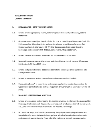 REGULAMIN LOTERII „Loteria Dentastix” 1. ORGANIZATOR I CZAS TRWANIA LOTERII 1.1. Loteria promocyjna (dalej zwana „Loterią") prowadzona jest pod nazwą „Loteria Dentastix”. 1.2. Organizatorem Loterii jest: Loyalty Point Sp. z o. o. z siedzibą w Warszawie (kod: 02235), przy ulicy Równoległej 4a, wpisana do rejestru przedsiębiorców przez Sąd Rejonowy dla m.st. Warszawy, XIII Wydział Gospodarczy Krajowego Rejestru Sądowego pod numerem KRS 491369, dalej zwana „Organizatorem”. 1.3. Loteria trwa od 10 czerwca 2015 roku do 19 października 2015 roku. 1.4. Sprzedaż towarów uprawniających do wzięcia udziału w Loterii trwa od 10 czerwca 2015 roku do 31 lipca 2015 roku. 1.5. Loteria jest prowadzona na podstawie zezwolenia wydanego przez Dyrektora Izby Celnej w Warszawie. 1.6. Loteria prowadzona jest na całym obszarze Rzeczypospolitej Polskiej. 1.7. Przez „dni robocze” w rozumieniu niniejszego regulaminu uważa się wszystkie dni tygodnia od poniedziałku do piątku z wyjątkiem dni uznanych za ustawowo wolne od pracy. 2. WARUNKI UCZESTNICTWA W LOTERII 2.1. Loteria przeznaczona jest wyłącznie dla zamieszkałych na terytorium Rzeczypospolitej Polskiej pełnoletnich osób fizycznych, nabywających produkty, o których mowa w ust. 3.1., jako konsumenci w rozumieniu art. 221 Kodeksu cywilnego. 2.2. W Loterii nie mogą brać udziału pracownicy i współpracownicy Organizatora oraz Mars Polska Sp. z o.o. W Loterii nie mogą brać udziału również członkowie rodzin osób powyżej wymienionych. Przez członków rodziny, o których mowa powyżej, 1 rozumie się: wstępnych, zstępnych, rodzeństwo, małżonków i osoby pozostające w stosunku przysposobienia. 3. ZASADY PROWADZENIA LOTERII 3.1. Towarami objętymi Loterią są wszystkie produkty marki Pedigree Dentastix niezależnie od tego, czy są oznaczone jako towary promocyjne informacją o Loterii i sprzedawane w punktach sprzedaży detalicznej na obszarze Rzeczypospolitej Polskiej, dalej zwane „Produktami”. 3.2. W celu wzięcia udziału w Loterii uczestnik powinien w okresie, o którym mowa w ust. 1.4. powyżej zakupić Produkt, a następnie w tym samym okresie zgłosić swój udział w Loterii rejestrując się na stronie internetowej www.pedigree.pl 3.3. Zgłaszając swój udział w Loterii uczestnik Loterii wypełnia formularz rejestracyjny, gdzie podaje następujące dane osobowe: imię i nazwisko, adres e-mail, data zakupu Produktu (zgodna z paragonem potwierdzającym zakup Produktu), godzinę zakupu produktu (zgodna z paragonem potwierdzającym zakup Produktu), numer paragonu zawierającego informację o zakupionym Produkcie lub Produktach, i potwierdza zapoznanie się z Regulaminem Loterii oraz wyraża zgodę na przestrzeganie jego postanowień., w szczególności potwierdza fakt, że nie jest osobą wskazaną w ust. 2.2. Regulaminu i może wziąć udział w Loterii. 3.4. O czasie zgłoszenia, o którym mowa w ust. 3.3. powyżej, decyduje chwila rejestracji w systemie komputerowym Organizatora. 3.5. Organizator zastrzega sobie możliwość zastosowania systemu zabezpieczenia CAPTCHA (konieczność przepisania kodu z obrazka wskazanego na stronie internetowej) przy wypełnianiu przez uczestnika Loterii formularza rejestracyjnego, o jakim mowa w ust. 3.3. 3.6. Nabycie jednego Produktu potwierdzone paragonem dokumentującym zakup, upoważnia tylko do jednego zgłoszenia udziału w Loterii. 2 3.7. Zakup kilku Produktów potwierdzony jednym paragonem upoważnia do jednego zgłoszenia udziału w Loterii. 3.8. Zakup kilku Produktów potwierdzony osobnymi paragonami upoważnia do zgłoszenia udziału w Loterii tyle razy, ile paragonów na zakup Produktów posiada uczestnik. 3.9. O prawidłowym zgłoszeniu udziału w Loterii uczestnik jest powiadomiony automatycznym komunikatem na stronie internetowej www.pedigree.pl kończącym procedurę zgłoszenia. 3.10. Pięciokrotne wprowadzenie w ciągu doby przez potencjalnego uczestnika Loterii błędnego numeru paragonu lub numeru paragonu już wcześniej zgłoszonego do udziału w Loterii powoduje tymczasowe zablokowanie możliwości zgłaszania udziału w Loterii przez tego zgłaszającego. Odblokowanie możliwości zgłoszenia jest możliwe po kontakcie uczestnika z Organizatorem pod adres e-mail: [email protected] albo następuje automatycznie po upływie 72 godzin od momentu pierwszej nieprawidłowej próby zgłoszenia się do udziału w Loterii. 3.11. Organizator zastrzega sobie możliwość sprawdzania poprawności wpisanych w formularzach rejestracyjnych numerów paragonów, a w przypadku wątpliwości co do prawidłowości tychże numerów lub źródła ich pochodzenia Organizator może zażądać przedstawienia przez uczestnika wszystkich paragonów, których numery zostały podane w formularzach rejestracyjnych w terminie do 30 lipca 2015 r. Organizator informuje o konieczności przedstawienia paragonów przesyłając uczestnikowi wiadomość elektroniczną na adres e-mail wskazany przez uczestnika w formularzu rejestracyjnym. 3.12. Przedstawienie paragonów, o jakich mowa w ust. 3.11, powinno nastąpić w terminie do trzech dni, od daty poinformowania uczestnika przez Organizatora o konieczności przedstawienia paragonów, w formie wiadomości e-mail na adres [email protected], wskazany także w wiadomości elektronicznej przesłanej przez Organizatora, zawierającej jako załącznik czytelne skany wszystkich zarejestrowanych paragonów. 3.13. Wykorzystanie przez uczestnika programów komputerowych lub użycie innych technicznych środków generujących automatyczne wpisy numerów paragonów powoduje nieważność zgłoszenia do udziału w Loterii. 3 4. 4.1. NAGRODY Pulę nagród w Loterii stanowi 156 (sto pięćdziesiąt sześć) voucherów na podstawową opiekę weterynaryjną dla psa, do zrealizowania w jednym z wybranych przez uczestnika gabinetów weterynaryjnych na terenie całego kraju, na zasadach określonych w pkt. 7 poniżej, obejmującą: jedno sz
