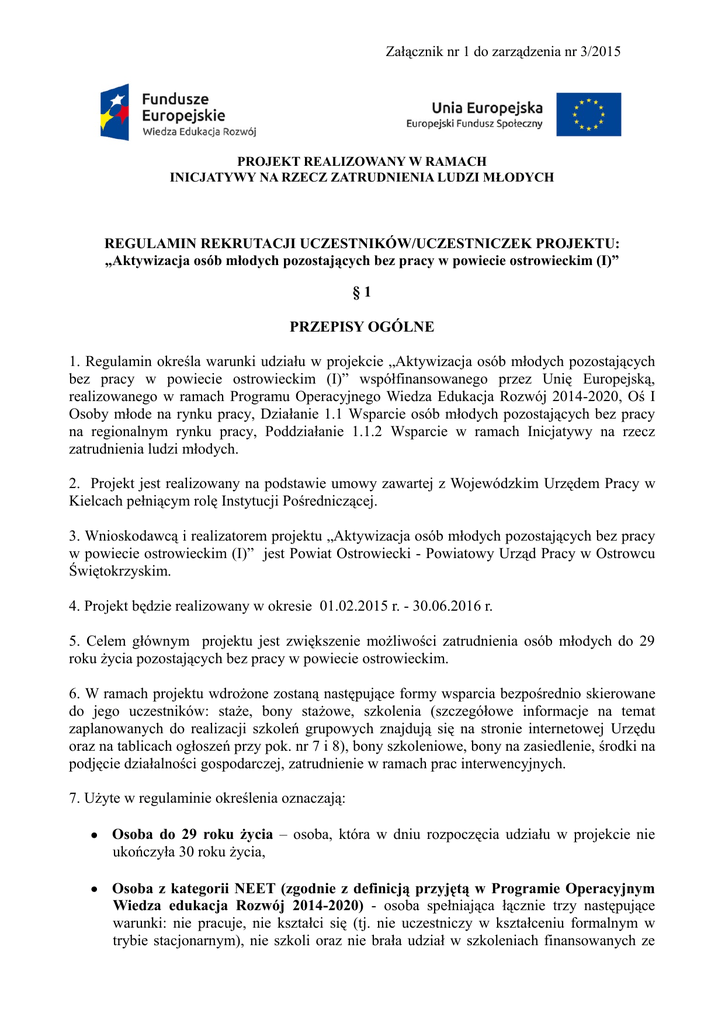 Załącznik nr 1 do zarządzenia nr 3/2015 PROJEKT REALIZOWANY W RAMACH INICJATYWY NA RZECZ ZATRUDNIENIA LUDZI MŁODYCH REGULAMIN REKRUTACJI UCZESTNIKÓW/UCZESTNICZEK PROJEKTU: „Aktywizacja osób młodych pozostających bez pracy w powiecie ostrowieckim (I)” §1 PRZEPISY OGÓLNE 1. Regulamin określa warunki udziału w projekcie „Aktywizacja osób młodych pozostających bez pracy w powiecie ostrowieckim (I)” współfinansowanego przez Unię Europejską, realizowanego w ramach Programu Operacyjnego Wiedza Edukacja Rozwój 2014-2020, Oś I Osoby młode na rynku pracy, Działanie 1.1 Wsparcie osób młodych pozostających bez pracy na regionalnym rynku pracy, Poddziałanie 1.1.2 Wsparcie w ramach Inicjatywy na rzecz zatrudnienia ludzi młodych. 2. Projekt jest realizowany na podstawie umowy zawartej z Wojewódzkim Urzędem Pracy w Kielcach pełniącym rolę Instytucji Pośredniczącej. 3. Wnioskodawcą i realizatorem projektu „Aktywizacja osób młodych pozostających bez pracy w powiecie ostrowieckim (I)” jest Powiat Ostrowiecki - Powiatowy Urząd Pracy w Ostrowcu Świętokrzyskim. 4. Projekt będzie realizowany w okresie 01.02.2015 r. - 30.06.2016 r. 5. Celem głównym projektu jest zwiększenie możliwości zatrudnienia osób młodych do 29 roku życia pozostających bez pracy w powiecie ostrowieckim. 6. W ramach projektu wdrożone zostaną następujące formy wsparcia bezpośrednio skierowane do jego uczestników: staże, bony stażowe, szkolenia (szczegółowe informacje na temat zaplanowanych do realizacji szkoleń grupowych znajdują się na stronie internetowej Urzędu oraz na tablicach ogłoszeń przy pok. nr 7 i 8), bony szkoleniowe, bony na zasiedlenie, środki na podjęcie działalności gospodarczej, zatrudnienie w ramach prac interwencyjnych. 7. Użyte w regulaminie określenia oznaczają: Osoba do 29 roku życia – osoba, która w dniu rozpoczęcia udziału w projekcie nie ukończyła 30 roku życia, Osoba z kategorii NEET (zgodnie z definicją przyjętą w Programie Operacyjnym Wiedza edukacja Rozwój 2014-2020) - osoba spełniająca łącznie trzy następujące warunki: nie pracuje, nie kształci się (tj. nie uczestniczy w kształceniu formalnym w trybie stacjonarnym), nie szkoli oraz nie brała udział w szkoleniach finansowanych ze Załącznik nr 1 do zarządzenia nr 3/2015 środków publicznych w okresie ostatnich 4 tygodni. Uczestnik/uczestniczka projektu – osoba zakwalifikowana do projektu zgodnie z zasadami określonymi w niniejszym regulaminie, Osoba długotrwale bezrobotna – osoba pozostająca bez pracy, gotowa do podjęcia pracy i aktywnie poszukująca zatrudnienia: - w przypadku osoby w wieku poniżej 25 lat – nieprzerwanie przez okres ponad 6 miesięcy, - w przypadku osoby w wieku powyżej 25 lat – nieprzerwanie przez okres ponad 12 miesięcy. Osoba niepełnosprawna – osoba niepełnosprawna w świetle przepisów ustawy z dnia 27 sierpnia 1997 r. o rehabilitacji zawodowej i społecznej oraz zatrudnieniu osób niepełnosprawnych tj. osobę z orzeczeniem o niepełnosprawności. 8. Osoby kierowane na staż lub szkolenie (w tym również w ramach bonów) mogą ubiegać się o zwrot kosztów opieki nad dzieckiem/osobą zależną. §2 KRYTERIA UCZESTNICTWA W PROJEKCIE I OFEROWANE WSPARCIE 1. Wsparcie w ramach projektu kierowane jest do osób młodych w wieku 18-29 lat bez pracy, zarejestrowanych w PUP w Ostrowcu Św. jako osoby bezrobotne (należące do I lub II profilu pomocy), które nie uczestniczą w kształceniu i szkoleniu (tzw. młodzież NEET), zgodnie z definicją osoby z kategorii NEET przyjętą w Programie Operacyjnym Wiedza Edukacja Rozwój 2014-2020. 2. Zgodnie z kryteriami dostępu, co najmniej 37,56% uczestników/uczestniczek projektu stanowić będą osoby długotrwale bezrobotne oraz co najmniej 5,15% osoby niepełnoprawne. 3. Wsparcie jakie otrzymają uczestnicy projektu opierać się będzie na co najmniej trzech elementach pomocy. Obligatoryjnymi elementami pomocy będą: określenie profilu i przygotowanie indywidualnego planu działania (pierwszy element pomocy) oraz usługa poradnictwa zawodowego lub pośrednictwa pracy (drugi element pomocy). Trzeci element pomocy to fakultatywny element pomocy (wsparcie bezpośrednie o którym mowa w § 1 ust. 6) wybierany w zależności od potrzeb i możliwości osób, którym udzielane jest wsparcie. 4. W przypadku gdy osoba przystępująca do projektu posiada aktualny indywidualny plan działania lub otrzymała wsparcie w postaci pośrednictwa pracy bądź poradnictwa zawodowego przed przystąpieniem do projektu, nie ma konieczności, aby to wsparcie było udzielane ponownie. 5. Wnioskodawca zapewni udział większej ilości kobiet niż mężczyzn w projekcie, co wynika z gorszej – w porównaniu do mężczyzn sytuacji kobiet na rynku pracy w powiecie. Załącznik nr 1 do zarządzenia nr 3/2015 §3 REKRUTACJA DO PROJEKTU 1. Rekrutacja do projektu będzie prowadzona w okresie od 01.02.2015r. do 31.12.2015r. Okres ten może ulec skróceniu w przypadku braku w budżecie projektu wolnych środków, które pozwalają na dalszy nabór uczestników/uczestniczek projektu w ramach danego zadania. 2. Rekrutacja kandydatów do projektu przebiegać będzie zgodnie z zasadą równości szans, tak aby zapewnić uczestnikom/uczestniczkom jednakowy dostęp do oferowanego wsparcia bez względu na miejsce zamieszkania, światopogląd, wiek, niepełnosprawność, wykształcenie, wyznanie itp. 3. Warunkiem zakwalifikowania do projektu jest podpisanie przez osobę bezrobotną oświadczenia potwierdzającego spełnienie kryteriów kwalifikowalności uprawniających do udziału w projekcie. Dodatkowo osoba ubiegająca się o udział w projekcie jest zobowiązana do: podania danych o których mowa w załączniku nr 1 i 2 do rozporządzenia EFS, tj. m.in. płeć, status na rynku pracy, wiek, wykształcenie potrzebnych do monitorowania wskaźników kluczowych oraz przeprowadzenia ewaluacji projektu, do przek