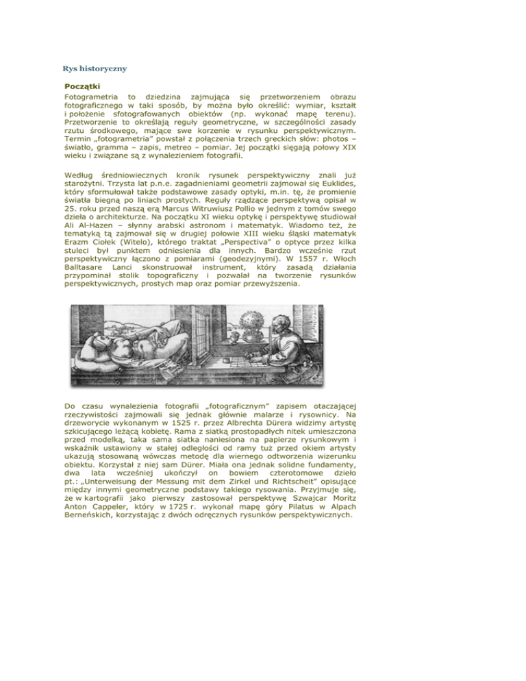 Rys historyczny Początki Fotogrametria to dziedzina zajmująca się przetworzeniem obrazu fotograficznego w taki sposób, by moŜna było określić: wymiar, kształt i połoŜenie sfotografowanych obiektów (np. wykonać mapę terenu). Przetworzenie to określają reguły geometryczne, w szczególności zasady rzutu środkowego, mające swe korzenie w rysunku perspektywicznym. Termin „fotogrametria” powstał z połączenia trzech greckich słów: photos – światło, gramma – zapis, metreo – pomiar. Jej początki sięgają połowy XIX wieku i związane są z wynalezieniem fotografii. Według średniowiecznych kronik rysunek perspektywiczny znali juŜ staroŜytni. Trzysta lat p.n.e. zagadnieniami geometrii zajmował się Euklides, który sformułował takŜe podstawowe zasady optyki, m.in. tę, Ŝe promienie światła biegną po liniach prostych. Reguły rządzące perspektywą opisał w 25. roku przed naszą erą Marcus Witruwiusz Pollio w jednym z tomów swego dzieła o architekturze. Na początku XI wieku optykę i perspektywę studiował Ali Al-Hazen – słynny arabski astronom i matematyk. Wiadomo teŜ, Ŝe tematyką tą zajmował się w drugiej połowie XIII wieku śląski matematyk Erazm Ciołek (Witelo), którego traktat „Perspectiva” o optyce przez kilka stuleci był punktem odniesienia dla innych. Bardzo wcześnie rzut perspektywiczny łączono z pomiarami (geodezyjnymi). W 1557 r. Włoch Balltasare Lanci skonstruował instrument, który zasadą działania przypominał stolik topograficzny i pozwalał na tworzenie rysunków perspektywicznych, prostych map oraz pomiar przewyŜszenia. Do czasu wynalezienia fotografii „fotograficznym” zapisem otaczającej rzeczywistości zajmowali się jednak głównie malarze i rysownicy. Na drzeworycie wykonanym w 1525 r. przez Albrechta Dürera widzimy artystę szkicującego leŜącą kobietę. Rama z siatką prostopadłych nitek umieszczona przed modelką, taka sama siatka naniesiona na papierze rysunkowym i wskaźnik ustawiony w stałej odległości od ramy tuŜ przed okiem artysty ukazują stosowaną wówczas metodę dla wiernego odtworzenia wizerunku obiektu. Korzystał z niej sam Dürer. Miała ona jednak solidne fundamenty, dwa lata wcześniej ukończył on bowiem czterotomowe dzieło pt.: „Unterweisung der Messung mit dem Zirkel und Richtscheit” opisujące między innymi geometryczne podstawy takiego rysowania. Przyjmuje się, Ŝe w kartografii jako pierwszy zastosował perspektywę Szwajcar Moritz Anton Cappeler, który w 1725 r. wykonał mapę góry Pilatus w Alpach Berneńskich, korzystając z dwóch odręcznych rysunków perspektywicznych. Camera obscura Zanim zbudowano pierwszy aparat fotograficzny, przez wiele stuleci jego namiastką była camera obscura (ciemnia optyczna). Według starych przekazów korzystał z niej juŜ Ali Al-Hazen w XI wieku. Dzisiaj trudno określić dokładną datę i faktycznego wynalazcę tego urządzenia. Niektóre źródła wskazują na staroŜytnych Greków lub Egipcjan, inne na bagdadzki O jakości (dokładności) odwzorowania obiektu „zdejmowanego” taką metodą decydowały jednak oko i ręka artysty. Dla zapewnienia poprawności geometrycznej (matematycznej) potrzebne były pewniejsze podstawy. JuŜ w 1639 r. francuski matematyk Gérard Desargues w dziele pt. „Brouillon project” zawarł swe przemyślenia nad geometrią rzutową. Gdy w 1692 r. Wilhelm Leibnitz wprowadził pojęcie współrzędnych, a w 1759 r. inny wybitny matematyk Johann Heinrich Lambert opublikował matematyczne podstawy rzutowania oraz zauwaŜył, Ŝe zasady perspektywy mogą być wykorzystane do produkcji map – od strony matematycznej podwaliny pod fotogrametrię zostały połoŜone. „Dom mądrości” i wiek IX. Sama kamera to nic innego jak światłoszczelna skrzynka z niewielkim otworem (obiektywem) znajdującym się w jednej ze ścian i matówki (pergaminu) na ścianie przeciwległej. Promienie wpadające przez otwór ulegają załamaniu i tworzą na matówce pomniejszony i odwrócony obraz obiektu znajdującego się przed otworem. W średniowieczu camera obscura słuŜyła arabskim astronomom do prowadzenia obserwacji astronomicznych. Była m.in. obiektem zainteresowania angielskiego fizyka Rogera Bacona, który w końcu XIII wieku opisał, jak z niej korzystał przy obserwacji zaćmienia Słońca; w podobnym celu uŜył ją Gemma Frisius w 1544 r. Sam Leonardo da Vinci zajął się jej udoskonaleniem i pełnym opisem, chociaŜ najwcześniej opublikowaną pracą na ten temat moŜe poszczycić się jego uczeń – Caesare Caesarino (1521 r.). Później ciemnia optyczna stała się pomocnym narzędziem w pracowniach malarzy. Korzystali z niej: Vermeer, Canaletto, Reynolds. Bywało jednak i tak, Ŝe występowała w roli jarmarcznej ciekawostki. Swego czasu Włoch Giovanni Batista della Porta zbudował ciemnię wielkości pokoju, w którym na ścianie moŜna było oglądać rzutowany obraz artystów występujących na zewnątrz. Dla widzów sporym utrudnieniem było to, Ŝe obraz „wyświetlany” był do góry nogami. Pierwsze kamery miały wymiary niewielkiego pomieszczenia, w XVII wieku budowano juŜ mniejsze, przenośne wersje urządzenia. Systematycznie zmierzano do polepszenia jakości obrazu. Prawdopodobnie malarz Jan van Eyck był pierwszym, który zastosował w otworze ciemni soczewkę (1430 r.). Przyjmuje się jednak, Ŝe zrobił to włoski matematyk Giordano Cardano (ten od wału kardana), a miało to miejsce w 1550 r. W 1673 r. von Horke skonstruował kamerę ze zwierciadłem (tzw. camera clara) dającym na matówce obraz prosty, który moŜna było łatwo przerysować. Kolejne udoskonalenia wprowadzone przez weneckiego architekta i arystokratę Daniela Barbaro – zastosowanie lustra, obiektywu i przysłony zamieniło skrzynkę w prawdziwy instrument. Następnym ulepszeniem było zamontowanie (1685 r.) przez niemieckiego zakonnika Johannesa Zahna zwierciadła umoŜliwiającego rzu