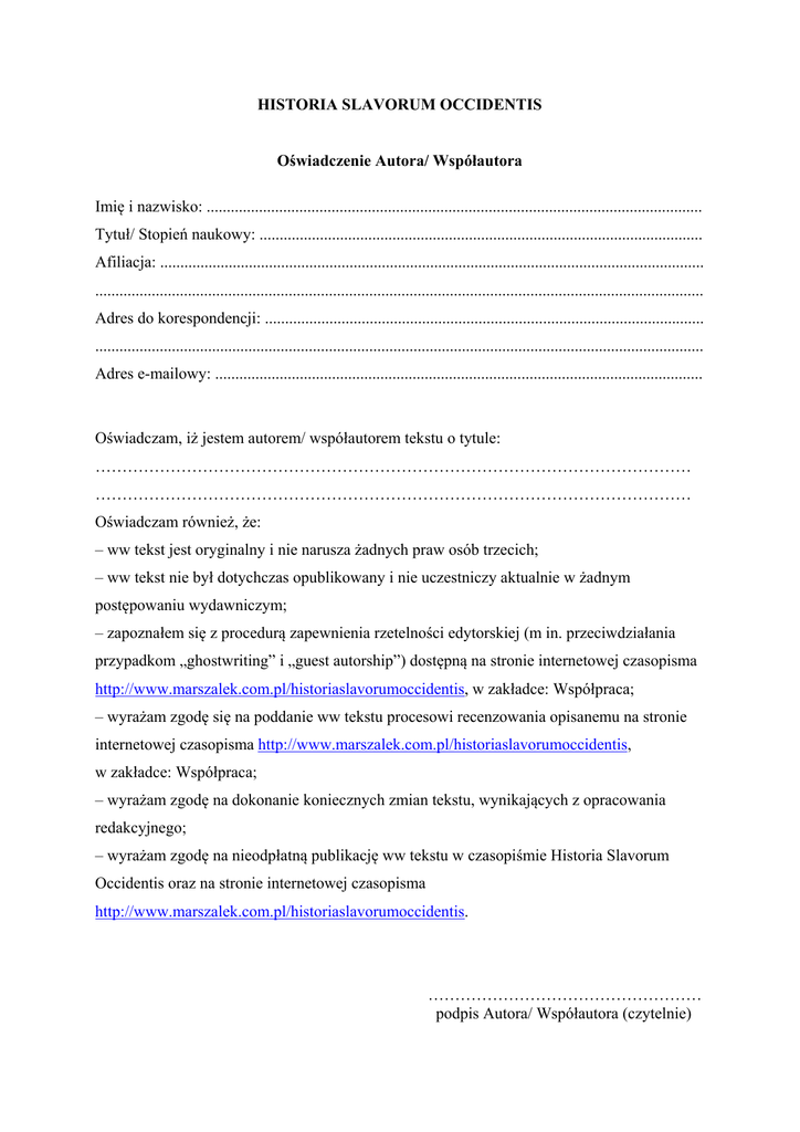 HISTORIA SLAVORUM OCCIDENTIS Oświadczenie Autora/ Współautora Imię i nazwisko: ........................................................................................................................... Tytuł/ Stopień naukowy: .............................................................................................................. Afiliacja: ....................................................................................................................................... ....................................................................................................................................................... Adres do korespondencji: ............................................................................................................. ....................................................................................................................................................... Adres e-mailowy: ......................................................................................................................... Oświadczam, iż jestem autorem/ współautorem tekstu o tytule: ………………………………………………………………………………………………… ………………………………………………………………………………………………… Oświadczam również, że: – ww tekst jest oryginalny i nie narusza żadnych praw osób trzecich; – ww tekst nie był dotychczas opublikowany i nie uczestniczy aktualnie w żadnym postępowaniu wydawniczym; – zapoznałem się z procedurą zapewnienia rzetelności edytorskiej (m in. przeciwdziałania przypadkom „ghostwriting” i „guest autorship”) dostępną na stronie internetowej czasopisma http://www.marszalek.com.pl/historiaslavorumoccidentis, w zakładce: Współpraca; – wyrażam zgodę się na poddanie ww tekstu procesowi recenzowania opisanemu na stronie internetowej czasopisma http://www.marszalek.com.pl/historiaslavorumoccidentis, w zakładce: Współpraca; – wyrażam zgodę na dokonanie koniecznych zmian tekstu, wynikających z opracowania redakcyjnego; – wyrażam zgodę na nieodpłatną publikację ww tekstu w czasopiśmie Historia Slavorum Occidentis oraz na stronie internetowej czasopisma http://www.marszalek.com.pl/historiaslavorumoccidentis. …………………………………………… podpis Autora/ Współautora (czytelnie)