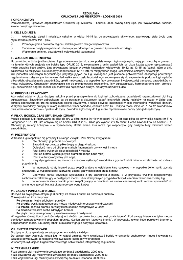 REGULAMIN ORLIKOWEJ LIGI MISTRZÓW – ŁÓDZKIE 2009 I. ORGANIZATOR Pomysłodawcą i głównym organizatorem Orlikowej Ligi Mistrzów – Łódzkie 2009, zwaną dalej Ligą, jest Województwo Łódzkie, zwane dalej Organizatorem. II. CELE LIGI JEST: 1. Aktywizacja dzieci i młodzieży szkolnej w wieku 10-15 lat do prowadzenia aktywnego, sportowego stylu życia oraz stymulowanie postaw fair – play. 2. Promocja gmin i powiatów regionu łódzkiego oraz całego województwa. 3. 4. Tworzenie pozytywnego klimatu dla inicjatyw oddolnych w gminach i powiatach łódzkiego. Wspieranie gminnej, powiatowej i wojewódzkiej tożsamości III. WARUNKI UCZESTNICTWA Uczestnictwo w Lidze jest bezpłatne. Liga adresowana jest do szkół podstawowych i gimnazjalnych, mających siedzibę w gminach, na terenie których znajduje się boisko typu ORLIK 2012, ewentualnie z gmin sąsiednich. W Lidze każdą szkołę reprezentować może dowolna ilość drużyn. Liga prowadzona będzie w dwóch kategoriach wiekowych: 10-12 lat, 13-15 lat (dzieci, które w dniu zgłoszenia do rozgrywek nie ukończyły odpowiednio: 12, 15 lat). W rozgrywkach mogą uczestniczyć chłopcy i dziewczęta. Od jednostek samorządu terytorialnego przystępujących do Ligi wymagane jest pisemne potwierdzenia akceptacji poniższego regulaminu na załączonym formularzu. Jednostka samorządu terytorialnego zobowiązuje się do zapewnienia podczas Ligi: sędziów piłkarskich, ubezpieczenia zawodników, opieki medycznej, a w wypadku fazy powiatowej i wojewódzkiej transportu zawodników na mecz wyjazdowy. Organizator zobowiązuje się do przygotowania regulaminu, listy zgłoszeniowej, harmonogramu gier, promocji Ligi, zapewnienia nagród, medali i pucharów dla najlepszych drużyn, biorących udział w Lidze. IV. DRUŻYNA I ZAWODNICY Aby wziąć udział w Lidze drużyna szkolna przed przystąpieniem do Ligi jest zobowiązana przedstawić organizatorowi Ligi listę zgłoszeniową. Zawodnicy zobowiązani są do posiadania aktualnych badań lekarskich, zgody rodziców na udział w Lidze oraz sprzętu sportowego na grę na sztucznym boisku trawiastym, a także dowodu tożsamości w celu ewentualnej weryfikacji danych. Wszyscy zawodnicy drużyny w miarę możliwości winni posiadać jednolite koszulki. Drużyna może liczyć od 7 do 12 zawodników plus jedna osoba dorosła – opiekun drużyny. Zawodnik zgłoszony do Ligi może reprezentować barwy tylko jednej drużyny. V. PIŁKA, BOISKO, CZAS GRY, SKŁAD I ZMIANY Mecze podczas Ligi rozgrywane są piłką do gry w piłkę nożną (nr 4) w kategorii 10-12 lat oraz piłką do gry w piłkę nożną (nr 5) w kategoriach 13-15 lat. Gra odbywa się na boisku ORLIK 2012. Czas gry wynosi: 2 x 15 minut. Liczba zawodników na boisku: 5+1. Obowiązują zmiany hokejowe – w wyznaczonej strefie zmian. Gra może być rozpoczęta, gdy drużyna liczy minimum trzech zawodników. VI. PRZEPISY GRY W trakcie Ligi respektuje się przepisy Polskiego Związku Piłki Nożnej z wyjątkami: Nie obowiązuje przepis o spalonym Zawodnik wprowadza piłkę do gry w ciągu 4 sekund Odległość muru od piłki przy stałych fragmentach gry wynosi 4 metry Rzut karny wykonuje się z odległości 7 metrów Rzut od bramki wykonuje tylko bramkarz (nogą bądź ręką) Rzut z autu wykonywany jest nogą Kary dyscyplinarne: sędzia może czasowo wykluczyć zawodnika z gry na 2 lub 5 minut – w zależności od rodzaju przewinienia W momencie straty bramki przez zespół grający w osłabieniu kara czasowa - w wypadku żółtej kartki zostaje anulowana, w wypadku kartki czerwonej zespół gra w osłabieniu przez 5 minut Czerwona kartka powoduje wykluczenie z gry zawodnika z meczu, a w przypadku wybitnie niesportowego zachowania zakazem gry w następnym meczu lub w drastycznych przypadkach wykluczeniem zawodnika z całej Ligi W momencie straty bramki przez zespół grający w osłabieniu na skutek czerwonej kartki można wprowadzić do gry innego zawodnika, niż ukaranego czerwoną kartką VII. ZASADY PUNKTACJI w LIDZE Drużyna za zwycięstwo otrzymuje 3 punkty, za remis 1 punkt, za porażkę 0 punktów O kolejności w Lidze decyduje: Po pierwsze: liczba zdobytych punktów Po drugie: wynik bezpośredniego meczu między zainteresowanymi drużynami Po trzecie: różnica bramek ze wszystkich spotkań rozegranych w Lidze Po czwarte: większa liczba zdobytych bramek Po piąte: rzuty karne pomiędzy zainteresowanymi drużynami W wypadku równej ilości punktów więcej niż dwóch zespołów tworzona jest „mała tabela”. Pod uwagę bierze się tylko mecze pomiędzy zainteresowanymi zespołami (punkty, różnica bramek i zdobyte bramki). W przypadku równej ilości punktów i bramek w bezpośrednim meczu lub „małej tabeli” o miejscu w grupie decyduje losowanie. VIII. SYSTEM ROZGRYWEK Drużyny w Lidze rywalizują ze sobą systemem każdy z każdym. Do dalszej fazy awansuje mistrz Ligi (w każdej gminie), który rywalizować będzie w systemie pucharowym (mecz i rewanż) na szczeblu powiatowym, a następnie wojewódzkim (szczegóły w drabince). W spornych sytuacjach Organizator zastrzega sobie własną interpretację regulaminu. IX. TERMINARZ GIER Faza gminna Ligi musi wyłonić zwycięzcę do dnia 2 października 2009 roku. Faza powiatowa Ligi musi wyłonić zwycięzcę do dnia 9 października 2009 roku. Faza wojewódzka Ligi musi wyłonić zwycięzcę do dnia 6 listopada 2009 roku. Załącznik nr 2 1/16 finału – pary Numery w nawiasach symbolizują numery na mapce i tabelce (patrz załącznik w formacie pdf: mapka pucharowa) 1.Zwycięzca Orlikowej Ligi Mistrzów w Poddębicach (1) - Zwycięzca Orlikowej Ligi Mistrzów w Łęczycy (2) 2. Zwycięzca Orlikowej Ligi Mistrzów w Kutnie (3) - Zwycięzca Orlikowej Ligi Mistrzów w Strzelcach (4) 3. Zwycięzca Orlikowej Ligi Mistrzów w Łowiczu (5) - Zwycięzca Orlikowej Ligi Mistrzów w Skierniewicach (6) 4. Zwycięzca Orlikowej Ligi Mistrzów w Makowie (7) - Zwycięzca Orlikowej Ligi 
