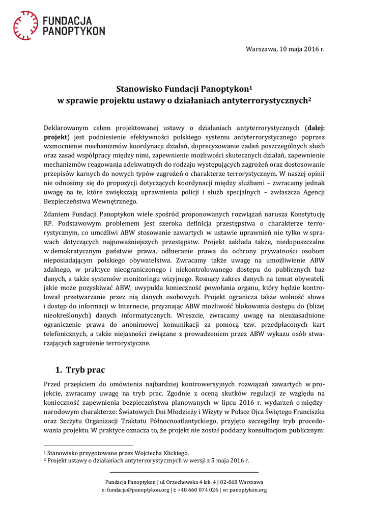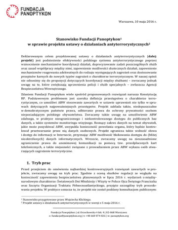 Warszawa, 10 maja 2016 r. Stanowisko Fundacji Panoptykon1 w sprawie projektu ustawy o działaniach antyterrorystycznych2 Deklarowanym celem projektowanej ustawy o działaniach antyterrorystycznych (dalej: projekt) jest podniesienie efektywności polskiego systemu antyterrorystycznego poprzez wzmocnienie mechanizmów koordynacji działań, doprecyzowanie zadań poszczególnych służb oraz zasad współpracy między nimi, zapewnienie możliwości skutecznych działań, zapewnienie mechanizmów reagowania adekwatnych do rodzaju występujących zagrożeń oraz dostosowanie przepisów karnych do nowych typów zagrożeń o charakterze terrorystycznym. W naszej opinii nie odnosimy się do propozycji dotyczących koordynacji między służbami – zwracamy jednak uwagę na te, które zwiększają uprawnienia policji i służb specjalnych – zwłaszcza Agencji Bezpieczeństwa Wewnętrznego. Zdaniem Fundacji Panoptykon wiele spośród proponowanych rozwiązań narusza Konstytucję RP. Podstawowym problemem jest szeroka definicja przestępstwa o charakterze terrorystycznym, co umożliwi ABW stosowanie zawartych w ustawie uprawnień nie tylko w sprawach dotyczących najpoważniejszych przestępstw. Projekt zakłada także, niedopuszczalne w demokratycznym państwie prawa, odbieranie prawa do ochrony prywatności osobom nieposiadającym polskiego obywatelstwa. Zwracamy także uwagę na umożliwienie ABW zdalnego, w praktyce nieograniczonego i niekontrolowanego dostępu do publicznych baz danych, a także systemów monitoringu wizyjnego. Rosnący zakres danych na temat obywateli, jakie może pozyskiwać ABW, uwypukla konieczność powołania organu, który będzie kontrolował przetwarzanie przez nią danych osobowych. Projekt ogranicza także wolność słowa i dostęp do informacji w Internecie, przyznając ABW możliwość blokowania dostępu do (bliżej nieokreślonych) danych informatycznych. Wreszcie, zwracamy uwagę na nieuzasadnione ograniczenie prawa do anonimowej komunikacji za pomocą tzw. przedpłaconych kart telefonicznych, a także niejasności związane z prowadzeniem przez ABW wykazu osób stwarzających zagrożenie terrorystyczne. 1. Tryb prac Przed przejściem do omówienia najbardziej kontrowersyjnych rozwiązań zawartych w projekcie, zwracamy uwagę na tryb prac. Zgodnie z oceną skutków regulacji ze względu na konieczność zapewnienia bezpieczeństwa planowanych w lipcu 2016 r. wydarzeń o międzynarodowym charakterze: Światowych Dni Młodzieży i Wizyty w Polsce Ojca Świętego Franciszka oraz Szczytu Organizacji Traktatu Północnoatlantyckiego, przyjęto szczególny tryb procedowania projektu. W praktyce oznacza to, że projekt nie został poddany konsultacjom publicznym: 1 2 Stanowisko przygotowane przez Wojciecha Klickiego. Projekt ustawy o działaniach antyterrorystycznych w wersji z 5 maja 2016 r. Fundacja Panoptykon | ul. Orzechowska 4 lok. 4 | 02-068 Warszawa e: [email protected] | t: +48 660 074 026 | w: panoptykon.org nie umożliwiono obywatelom ani organizacjom społecznym, a także instytucjom takim jak Rzecznik Praw Obywatelskich czy Generalny Inspektor Ochrony Danych Osobowych, przedstawienia opinii na etapie rządowego procesu legislacyjnego. Negatywnie wpływa to na jakość stanowionego prawa. Jednocześnie, uzasadnienie projektu nie wyjaśnia, dlaczego opracowanie potrzebnych (ze względu na ww. wydarzenia) szczegółowych procedur działania służb w reakcji na zdarzenia o charakterze terrorystycznym nie było możliwe w oparciu o dotychczasowe przepisy. W przypadku tej materii, ze względu na szczególnie wysoki stopień ingerencji w prawa jednostki, bardzo ważnie jest tworzenie przepisów w sposób przemyślany i angażujący jak najszerszą liczbę obywateli i ekspertów. Zwracamy również uwagę na tempo prac nad projektem i zakładany termin wejścia w życie ustawy. Wiele proponowanych rozwiązań (np. dotyczących nowego trybu uzyskiwania przez ABW dostępu do rejestrów publicznych) wymaga wdrożenia technicznego. Z kolei przyznanie ABW wiodącej i koordynacyjnej roli w zwalczaniu terroryzmu wymusza stworzenie nowych procedur współpracy między nią a pozostałymi służbami. W tym kontekście rodzi się pytanie, czy nowe rozwiązania będą w pełni funkcjonalne już w lipcu podczas wydarzeń, które wykorzystywane są do uzasadnienia konieczności przyjęcia przepisów w pilnym trybie. Tryb prac – tj. brak konsultacji publicznych czy konferencji uzgodnieniowej – utrudnia także ocenę konkretnych rozwiązań zawartych w projekcie. Uzasadnienie projektu w wielu punktach sprowadza się do przedstawienia proponowanego rozwiązania, natomiast nie odpowiada na pytanie o jego niezbędność, a także nie wskazuje, czy były rozważane inne możliwości, mniej ingerujące w prawa jednostki. Niektóre propozycje zawarte w projekcie (np. w zakresie przyznania ABW możliwości pozyskiwania danych ze zbiorów publicznych w drodze teletransmisji3) nie są nawet wspomniane w uzasadnieniu. Możliwość zgłoszenia merytorycznych uwag autorom projektu i uzyskania od nich niezbędnych wyjaśnień z pewnością wpłynęłaby pozytywnie na poziom i kierunki debaty publicznej. 2. Definicja przestępstw o charakterze terrorystycznym Kluczowe znaczenie dla oceny zakresu, celu i skutków projektu ma definicja przestępstwa i zdarzenia o charakterze terrorystycznym. Zgodnie z projektem4, przestępstwem o charakterze terrorystycznym jest czyn zabroniony zagrożony karą pozbawienia wolności, której górna granica wynosi co najmniej 3 lata, popełniony w jednym z celów wskazanych w Kodeksie karnym, np. w celu poważnego zastraszenia wielu osób lub zmuszenia organu władzy publicznej do podjęcia lub zaniechania określonych czynności. W takim ujęciu – pod warunkiem spełnienia wymogu dotyczącego celu – przestępstwami o charakterze terrorystycznym mogą być np.: znieważenie Prezydenta Rzeczypospolitej Polskiej (art. 135 § 2 Kodeksu karnego); naru