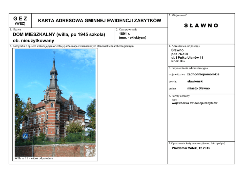 GEZ (WEZ) 3. Miejscowość KARTA ADRESOWA GMINNEJ EWIDENCJI ZABYTKÓW 1. Nazwa DOM MIESZKALNY (willa, po 1945 szkoła) ob. nieużytkowany SŁAWNO 2. Czas powstania 1891 r. (mur. - eklektyzm) 8. Fotografia z opisem wskazującym orientację albo mapa z zaznaczonym stanowiskiem archeologicznym 4. Adres (ulica, nr posesji) Sławno p-ta 76-100 ul. I Pułku Ułanów 11 Nr dz. 335 5. Przynależność administracyjna województwo zachodniopomorskie powiat sławieński gmina miasto Sławno 6. Formy ochrony inne wojewódzka ewidencja zabytków 7. Opracowanie karty adresowej (autor, data i podpis) Waldemar Witek, 12.2015 Willa nr 11 – widok od południa 9. Fotografie, ikonografia 10. Mapy, plany Dawna willa A. Schultza – właściciela browaru i folwarku, po 1945 r. siedziba Zespołu Szkół Zawodowych, ob. nieużytkowana. Budynek o oryginalne formie architektonicznej oraz eklektycznym (bogatym) wystroju elewacji z elementami pierwotnego wyposażenia wnętrza. Budynek o rozczłonkowanej bryle, dwukondygnacyjny z dachem czterospadowym i wystawkami oraz narożną (4-kondygnacyjną) wieżą zwieńczoną hełmem cebulastym. Ściany murowane z cegły ceramicznej, nietynkowane. elewacje z bogatą dekoracją architektoniczna (ceramiczną i cementową): gzymsy, fryzy, architektoniczne obramienia okienne, szczyty. Na elewacji kartusz z nazwiskiem właściciela i datą. Stolarka okienna w większości współczesna. Plan miasta Sławno (Schlawe) - 1939 Architektoniczna dekoracja wieży Mapa topograficzna Sławna