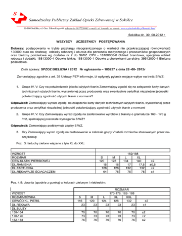 Samodzielny Publiczny Zakład Opieki Zdrowotnej w Sokółce 16-100 Sokółka, ul. Gen. Sikorskiego 40 sekretariat 0857220463 e-mail i tel. kontakt. na stronie www.szpitalsokolka.pl/kontakt.html Sokółka dn. 30 .08.2012 r WSZYSCY UCZESTNICY POSTĘPOWANIA Dotyczy: postępowania w trybie przetargu nieograniczonego o wartości nie przekraczającej równowartość 130000 euro na dostawę odzieży roboczej i obuwia dla personelu medycznego i pracowników gospodarczych oraz bielizny pościelowe wg dodatku nr 2 do SIWZ. CPV - 18100000-0 Odzież branżowa, specjalna odzież robocza i dodatki; 18813300-4 Obuwie lekkie; 18813000-1 Obuwie z cholewkami ze skóry; 39512000-4 Bielizna pościelowa. Znak sprawy: SPZOZ BIELIZNA / 2012 Nr ogłoszenia – 185237 z dnia 28 -08- 2012r Zamawiający zgodnie z art. 38 Ustawy PZP informuje, iż wpłynęły pytania mające wpływ na treść SIWZ: 1. Grupa IV, V: Czy na potwierdzenie jakości użytych tkanin Zamawiający zgodzi się na załączenie karty danych technicznych użytych tkanin, wystawionej przez producenta oraz ewentualnie certyfikat niezależnej jednostki potwierdzający zgodność użytych tkanin z normami? Odpowiedź: Zamawiający wyraża zgodę na załączenie karty danych technicznych użytych tkanin, wystawionej przez producenta oraz certyfikat niezależnej jednostki potwierdzający zgodność użytych tkanin z normami 2. Grupa IV, V: Czy Zamawiający wyrazi zgodę na zaoferowanie wyrobów z tkaniny o gramaturze 160 - 170 g /m2, spełniającej pozostałe wymagania SIWZ? Odpowiedź: Zamawiający podtrzymuje zapisy SIWZ. 3. Czy Zamawiający wyrazi zgodę na zastosowanie w zakresie grupy V tabeli rozmiarów stosowanych przez naszą tkalnię: Poz. 3: fartuchy zielone wiązane z tyłu XL do XXL: WZROST ROZMIAR OBW.KLATKI PIERSIOWEJ DŁ.RAMIENIA DŁ.FARTUCHA DŁ.RĘKAWA ZE ŚCIĄGACZEM S 120 15 128 64 M 128 16 128 75 182/188 L XL 134 140 17 17,5 132 132 75 75 Poz. 4,5: ubrania (spodnie z gumką) w kolorach zielonym i niebieskim: WZROST ROZMIARÓWKA OBWÓD KL. PIERS. DŁ.RĘKAWA DŁ.BLUZY 158-164 170-176 182-188 S 116 23 M 120 23 70 73 76 70 73 76 ROZMIAR 170-176; 182- 188 L XL XXL 124 128 132 23 23 23 70 73 76 70 73 76 70 73 76 ±2 ±1 ±2 ±2 ±2 ±2 ±0,5 ±2 ±1 OBWÓD PASA DŁ.SPODNI Z GUMKĄ 158-164 170-176 182-188 104 108 112 116 120 ±2 106 109 112 106 109 112 106 109 112 106 109 112 106 109 112 ±2 ±2 ±2 Poz. 6: Sukienka zielona (…) WZROST ROZMIAR OBW.KLATKI PIERSIOWEJ OBWÓD BIODER DŁUGOŚĆ SUKIENKI 158/164 170/176 DŁ.RĘKAWA 158/164 ; 170/176 M S L XL XXL 101 108 107 114 113 120 124 124 130 130 ±2 ±2 111 115 18,5 111 115 18,5 111 115 18,5 111 115 18,5 111 115 18,5 ±2 ±2 ±1 Odpowiedź: Zamawiający wyraża zgodę na zastosowanie w zakresie Grupy V tabeli rozmiarów używanej przez Wykonawcę. 4. Czy nie nastąpiła omyłka i Zamawiający załączył wzór umowy dotyczący innego asortymentu (odczynniki biochemiczne), niż wymagany w SIWZ? W związku z powyższym prosimy o wykreślenie lub odpowiednią modyfikację wzoru umowy, tak, aby jej zapisy odpowiadały zamawianemu asortymentowi. Odpowiedź: Tak nastąpiła omyłka, właściwy wzór umowy dostępny jest na stronie internetowej od dnia 29.08.2012r. 5. Czy ze względu na specyfikę Zamawianego asortymentu (konieczność uszycia, wykonania haftów), Zamawiający zgodzi się na wydłużenie terminu dostaw do 10 dni roboczych? Odpowiedź: Zgodnie z właściwym wzorem umowy terminu dostaw wynosi 21 dni 6. Czy za dni robocze w rozumieniu wzoru umowy będą uważane dni od poniedziałku do piątku, za wyjątkiem dni ustawowo wolnych od pracy? Odpowiedź: Tak dni od poniedziałku do piątku. 7. Czy Zamawiający zgadza się aby w § 6 ust. 2 wzoru umowy zostało dopisane zdanie o następującej treści: „Strony mogą jednak zmienić ceny również w przypadku przekraczającej 3% zmiany średniego kursu NBP walut EUR lub USD w stosunku do kursu z dnia zawarcia umowy; bądź w przypadku gdy suma miesięcznych wskaźników cen i usług konsumpcyjnych opublikowanych przez Prezesa GUS za okres od dnia zawarcia umowy przekroczy 3% - pod warunkiem uzgodnienia zmiany cen w aneksie do umowy”? Dopisanie powyższego zdania nie zagraża interesom Zamawiającego. Jeżeli Zamawiający nie będzie akceptował zmiany cen, będzie mógł odmówić podpisania aneksu o zmianie umowy. Odpowiedź: Zamawiający podtrzymuje zapisy SIWZ. Sporządził: St. inspektor d/s zamówień publicznych Andrzej Dowgiert Zatwierdził: Dyrektor SPZOZ w Sokółce Jerzy Kułakowski