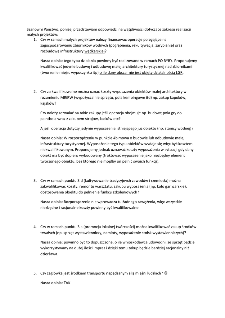 Szanowni Paostwo, poniżej przedstawiam odpowiedzi na wątpliwości dotyczące zakresu realizacji małych projektów: 1. Czy w ramach małych projektów należy finansowad operacje polegające na zagospodarowaniu zbiorników wodnych (pogłębienia, rekultywacja, zarybianie) oraz rozbudową infrastruktury wędkarskiej? Nasza opinia: tego typu działania powinny byd realizowane w ramach PO RYBY. Proponujemy kwalifikowad jedynie budowę i odbudowę małej architektury turystycznej nad zbiornikami (tworzenie miejsc wypoczynku itp) o ile dany obszar nie jest objęty działalnością LGR. 2. Czy za kwalifikowalne można uznad koszty wyposażenia obiektów małej architektury w rozumieniu MRiRW (wypożyczalnie sprzętu, pola kempingowe itd) np. zakup kapoków, kajaków? Czy należy zezwalad na takie zakupy jeśli operacja obejmuje np. budowę pola gry do paintbola wraz z zakupem strojów, kasków etc? A jeśli operacja dotyczy jedynie wyposażenia istniejącego już obiektu (np. stanicy wodnej)? Nasza opinia: W rozporządzeniu w punkcie 4b mowa o budowie lub odbudowie małej infrastruktury turystycznej. Wyposażenie tego typu obiektów wydaje się więc byd kosztem niekwalifikowanym. Proponujemy jednak uznawad koszty wyposażenia w sytuacji gdy dany obiekt ma byd dopiero wybudowany (traktowad wyposażenie jako niezbędny element tworzonego obiektu, bez którego nie mógłby on pełnid swoich funkcji). 3. Czy w ramach punktu 3 d (kultywowanie tradycyjnych zawodów i rzemiosła) można zakwalifikowad koszty: remontu warsztatu, zakupu wyposażenia (np. koło garncarskie), dostosowania obiektu do pełnienie funkcji szkoleniowych? Nasza opinia: Rozporządzenie nie wprowadza tu żadnego zawężenia, więc wszystkie niezbędne i racjonalne koszty powinny byd kwalifikowalne. 4. Czy w ramach punktu 3 a (promocja lokalnej twórczości) można kwalifikowad zakup środków trwałych (np. sprzęt wystawienniczy, namioty, wyposażenie stoisk wystawienniczych)? Nasza opinia: powinno byd to dopuszczone, o ile wnioskodawca udowodni, że sprzęt będzie wykorzystywany na dużej ilości imprez i dzięki temu zakup będzie bardziej racjonalny niż dzierżawa. 5. Czy żaglówka jest środkiem transportu napędzanym siłą mięśni ludzkich? Nasza opinia: TAK 6. Czy wnioskodawca może złożyd wniosek na realizację cyklu imprez kulturalnych o zróżnicowanym zakresie (przykład: Organizacja imprez kulturalnych w gminie …. w roku 2011)? Nasza opinia: Tak. 7. Czy w ramach małych projektów można założyd pasiekę oraz zakupid niezbędne urządzenia do usprzętowienia pracowni pasiecznej? W ramach pasieki pozyskiwany będzie miód, pyłek kwiatowy, propolis, pierzga i wosk. Produkty z pasieki będą oferowane klientom (turystom) w ramach sprzedaży bezpośredniej. W przyszłości pasieka będzie oferowała odkłady i pakiety pszczele a także usługi w zakresie zapylania tradycyjnych odmian drzew i plantacji owadopylnych. Nasza opinia: Tak. Pozdrawiam, Jacek Kukowski Departament Polityki Regionalnej Wydział Zarządzania PROW Sekcja LEADER tel. (56) 656-11-73 e-mail: [email protected]