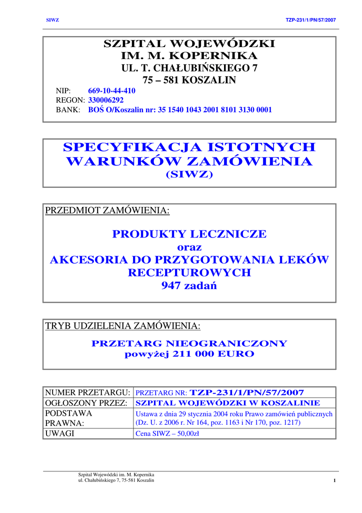 SIWZ TZP-231/1/PN/57/2007 SZPITAL WOJEWÓDZKI IM. M. KOPERNIKA UL. T. CHAŁUBIŃSKIEGO 7 75 – 581 KOSZALIN NIP: 669-10-44-410 REGON: 330006292 BANK: BOŚ O/Koszalin nr: 35 1540 1043 2001 8101 3130 0001 SPECYFIKACJA ISTOTNYCH WARUNKÓW ZAMÓWIENIA (SIWZ) PRZEDMIOT ZAMÓWIENIA: PRODUKTY LECZNICZE oraz AKCESORIA DO PRZYGOTOWANIA LEKÓW RECEPTUROWYCH 947 zadań TRYB UDZIELENIA ZAMÓWIENIA: PRZETARG NIEOGRANICZONY powyżej 211 000 EURO NUMER PRZETARGU: OGŁOSZONY PRZEZ: PODSTAWA PRAWNA: UWAGI PRZETARG NR: TZP-231/1/PN/57/2007 SZPITAL WOJEWÓDZKI W KOSZALINIE Ustawa z dnia 29 stycznia 2004 roku Prawo zamówień publicznych (Dz. U. z 2006 r. Nr 164, poz. 1163 i Nr 170, poz. 1217) Cena SIWZ – 50,00zł Szpital Wojewódzki im. M. Kopernika ul. Chałubińskiego 7, 75-581 Koszalin 1 SIWZ TZP-231/1/PN/57/2007 I. ZAMAWIAJĄCY SZPITAL WOJEWÓDZKI IM. M. KOPERNIKA UL. T. CHAŁUBIŃSKIEGO 7 75-581 KOSZALIN Reprezentowany przez: Dyrektora – Andrzeja KONDASZEWSKIEGO II. TRYB UDZIELENIA ZAMÓWIENIA Postępowanie o udzielenie zamówienia publicznego prowadzone jest w trybie przetargu nieograniczonego którego wartość przekracza wyrażoną w złotych równowartości kwoty 211 000 euro. III. OPIS PRZEDMIOTU ZAMÓWIENIA Przedmiotem zamówienia jest dostawa produktów leczniczych (leków różnych) oraz akcesoriów do przygotowania leków recepturowych (opakowania, nalepki, nakrętki) dla potrzeb Szpitala Wojewódzkiego w Koszalinie. Kod CPV 24400000-8. Szczegółowy zakres przedmiotu zamówienia określony jest w Załączniku nr 2 do SIWZ. IV. TERMIN WYKONANIA ZAMÓWIENIA Termin wykonania zamówienia 12 miesięcy od daty podpisania umowy. V. CZĘŚCI ZAMÓWIENIA Zamawiający dopuszcza składania ofert częściowych: 947 zadań. Szczegółowy zakres przedmiotu zamówienia określony jest w Załączniku nr 2 do SIWZ. VI. MAKSYMALNA LICZBA WYKONAWCÓW, Z KTÓRYMI ZAMAWIAJĄCY ZAWRZE UMOWĘ RAMOWĄ Zamawiający nie przewiduje zawarcia umowy ramowej. VII. ZAMÓWIENIA UZUPEŁNIAJĄCE Zamawiający nie przewiduje zamówień uzupełniających. VIII. OFERTY WARIANTOWE/ OFERTY RÓWNOWAŻNE Zamawiający nie dopuszcza składania ofert wariantowych. Zamawiający dopuszcza złożenie oferty równoważnej w zakresie ilości sztuk w opakowaniu. Po przeliczeniu - ilość sztuk musi być tożsama z ilością podaną w formularzu ofertowym. Szpital Wojewódzki im. M. Kopernika ul. Chałubińskiego 7, 75-581 Koszalin 2 SIWZ TZP-231/1/PN/57/2007 IX. INFORMACJE DOTYCZĄCE WALUT OBCYCH Rozliczenia między Zamawiającym a Wykonawcą prowadzone będą w walucie polskiej. X. AUKCJA ELEKTRONICZNA Zamawiający nie przewiduje przeprowadzenia aukcji elektronicznej. XI. WARUNKI UDZIAŁU W POSTĘPOWANIU 1. Warunki udziału w postępowaniu O udzielenie zamówienia mogą ubiegać się wykonawcy, którzy spełnią następujące warunki: 1) posiadają uprawnienia do wykonywania określonej działalności lub czynności, jeżeli ustawy nakładają obowiązek posiadania takich uprawnień; - koncesja lub zezwolenie, na podjęcie działalności gospodarczej w zakresie objętym zamówieniem; 2) posiadają niezbędną wiedzę i doświadczenie oraz dysponują potencjałem technicznym i osobami zdolnymi do wykonania zamówienia; 3) znajdują się w sytuacji ekonomicznej i finansowej zapewniającej wykonanie zamówienia; 4) nie podlegają wykluczeniu z postępowania o udzielenie zamówienia. Z ubiegania się o udzielenie zamówienia publicznego wyklucza się: 1) wykonawców, którzy w ciągu ostatnich 3 lat przed wszczęciem postępowania wyrządzili szkodę nie wykonując zamówienia lub wykonując je nienależycie, a szkoda ta nie została dobrowolnie naprawiona do dnia wszczęcia postępowania, chyba że niewykonanie lub nienależyte wykonanie jest następstwem okoliczności, za które wykonawca nie ponosi odpowiedzialności; 2) wykonawców, w stosunku do których otwarto likwidację lub których upadłość ogłoszono, z wyjątkiem wykonawców, którzy po ogłoszeniu upadłości zawarli układ zatwierdzony prawomocnym postanowieniem sądu, jeżeli układ nie przewiduje zaspokojenia wierzycieli poprzez likwidację majątku upadłego; 3) wykonawców, którzy zalegają z uiszczeniem podatków, opłat lub składek na ubezpieczenia społeczne lub zdrowotne, z wyjątkiem przypadków gdy uzyskali oni przewidziane prawem zwolnienie, odroczenie, rozłożenie na raty zaległych płatności lub wstrzymanie w całości wykonania decyzji właściwego organu; 4) osoby fizyczne, które prawomocnie skazano za przestępstwo popełnione w związku z postępowaniem o udzielenie zamówienia, przestępstwo przeciwko prawom osób wykonujących pracę zarobkową, przestępstwo przekupstwa, przestępstwo przeciwko obrotowi gospodarczemu lub inne przestępstwo popełnione w celu osiągnięcia korzyści majątkowych, a także za przestępstwo skarbowe lub przestępstwo udziału w zorganizowanej grupie albo związku mających na celu popełnienie przestępstwa lub przestępstwa skarbowego; 5) spółki jawne, których wspólnika prawomocnie skazano za przestępstwo popełnione w związku z postępowaniem o udzielenie zamówienia, przestępstwo przeciwko prawom osób wykonujących pracę zarobkową, przestępstwo przekupstwa, przestępstwo przeciwko obrotowi gospodarczemu lub inne przestępstwo popełnione w celu osiągnięcia korzyści majątkowych, a także za przestępstwo skarbowe lub przestępstwo udziału w zorganizowanej grupie albo związku mających na celu popełnienie przestępstwa lub przestępstwa skarbowego; Szpital Wojewódzki im. M. Kopernika ul. Chałubińskiego 7, 75-581 Koszalin 3 SIWZ TZP-231/1/PN/57/2007 6) spółki partnerskie, których partnera lub członka zarządu prawomocnie skazano za przestępstwo popełnione w związku z postępowaniem o udzielenie zamówienia, przestępstwo przeciwko prawom osób wykonujących pracę zarobkową, przestępstwo przekupstwa, przestępstwo przeciwko obrotowi gospodarczemu lub inne przestępstwo popełnione w celu 