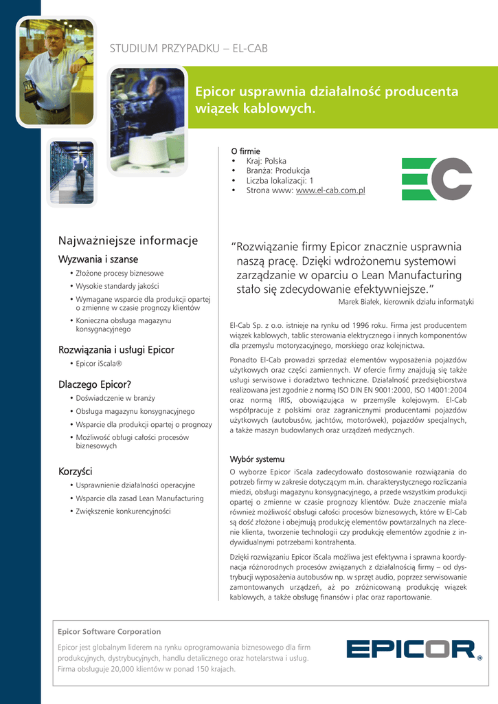 STUDIUM PRZYPADKU – EL-CAB Epicor usprawnia działalność producenta wiązek kablowych. O firmie • Kraj: Polska • Branża: Produkcja • Liczba lokalizacji: 1 • Strona www: www.el-cab.com.pl Najważniejsze informacje Wyzwania i szanse • Złożone procesy biznesowe • Wysokie standardy jakości • Wymagane wsparcie dla produkcji opartej o zmienne w czasie prognozy klientów • Konieczna obsługa magazynu konsygnacyjnego Rozwiązania i usługi Epicor • Epicor iScala® Dlaczego Epicor? • Doświadczenie w branży • Obsługa magazynu konsygnacyjnego • Wsparcie dla produkcji opartej o prognozy • Możliwość obługi całości procesów biznesowych “Rozwiązanie firmy Epicor znacznie usprawnia naszą pracę. Dzięki wdrożonemu systemowi zarządzanie w oparciu o Lean Manufacturing stało się zdecydowanie efektywniejsze.” Marek Białek, kierownik działu informatyki El-Cab Sp. z o.o. istnieje na rynku od 1996 roku. Firma jest producentem wiązek kablowych, tablic sterowania elektrycznego i innych komponentów dla przemysłu motoryzacyjnego, morskiego oraz kolejnictwa. Ponadto El-Cab prowadzi sprzedaż elementów wyposażenia pojazdów użytkowych oraz części zamiennych. W ofercie firmy znajdują się także usługi serwisowe i doradztwo techniczne. Działalność przedsiębiorstwa realizowana jest zgodnie z normą ISO DIN EN 9001:2000, ISO 14001:2004 oraz normą IRIS, obowiązująca w przemyśle kolejowym. El-Cab współpracuje z polskimi oraz zagranicznymi producentami pojazdów użytkowych (autobusów, jachtów, motorówek), pojazdów specjalnych, a także maszyn budowlanych oraz urządzeń medycznych. Wybór systemu Korzyści • Usprawnienie działalności operacyjne • Wsparcie dla zasad Lean Manufacturing • Zwiększenie konkurencyjności O wyborze Epicor iScala zadecydowało dostosowanie rozwiązania do potrzeb firmy w zakresie dotyczącym m.in. charakterystycznego rozliczania miedzi, obsługi magazynu konsygnacyjnego, a przede wszystkim produkcji opartej o zmienne w czasie prognozy klientów. Duże znaczenie miała również możliwość obsługi całości procesów biznesowych, które w El-Cab są dość złożone i obejmują produkcję elementów powtarzalnych na zlecenie klienta, tworzenie technologii czy produkcję elementów zgodnie z indywidualnymi potrzebami kontrahenta. Dzięki rozwiązaniu Epicor iScala możliwa jest efektywna i sprawna koordynacja różnorodnych procesów związanych z działalnością firmy – od dystrybucji wyposażenia autobusów np. w sprzęt audio, poprzez serwisowanie zamontowanych urządzeń, aż po zróżnicowaną produkcję wiązek kablowych, a także obsługę finansów i płac oraz raportowanie. Epicor Software Corporation Epicor jest globalnym liderem na rynku oprogramowania biznesowego dla firm produkcyjnych, dystrybucyjnych, handlu detalicznego oraz hotelarstwa i usług. Firma obsługuje 20,000 klientów w ponad 150 krajach. STUDIUM PRZYPADKU – El-Cab System Epicor iScala obecny jest na polskim rynku od ponad 17 lat. Najnowsza wersja została wyposażona w funkcje mobilne i trzy nowe moduły — do rozpoznawania przychodów z projektów i kontraktów, do zaawansowanej kontroli kredytowej oraz w aparat kontroli transakcji biznesowych. Nowa wersja zapewnia skalowalność, komfort obsługi i większą kontrolę. Przeznaczona jest dla firm, które chcą wykorzystać możliwości wynikające z poprawy sytuacji gospodarczej. Moduł rozpoznawania przychodów przeznaczony jest zwłaszcza dla klientów korzystających na co dzień z modułów zarządzania kontraktami i projektami. Umożliwia określenie warunków ustalania dochodów i wydatków. W module zaawansowanej kontroli kredytowej rozwiązania Epicor iScala wprowadzono wiele usprawnień. Dostępny jest także nowy zestaw narzędzi, które pozwalają organizacjom na określenie zasad autoryzacji i zatwierdzania, na podstawie maksymalnie 10 definiowanych przez użytkownika poziomów, uprawnień do limitów kredytowych. Każdy poziom limitu kredytowego jest przyporządkowany do określonego zestawu uprawnień użytkownika. Limity umożliwiają uprawnionym użytkownikom zwalnianie pozycji zamówień zablokowanych z powodu braku środków. Aparat kontroli transakcji biznesowych (BTCE) został wyposażony w funkcje kontroli określonych transakcji lub zdarzeń biznesowych w procesach sprzedaży, zakupów i zarządzania serwisem. Dla przykładu, rozszerzona obsługa zaawansowanej kontroli licencji (LC) umożliwia definiowanie możliwości zakupu bądź sprzedaży określonych produktów albo surowców, czasu transakcji, powodów, ilości i kontrahentów. Obecnie wdrożone w firmie moduły przeniesione są na nowe, w pełni 64bitowe środowisko serwerowe. W ramach rozwiązania Epicor iScala dostępne są m.in. takie funkcje jak: Availability To Promise, dzięki któremu przy składaniu zamówienia dla klienta można określić, czy dane pozycje są dostępne lub na kiedy mogą być dostępne w magazynie, czy Lean Time Management, umożliwiający zmierzenie czasu realizacji zamówienia klienta według szczegółowych, zróżnicowanych parametrów. Nowa iScala dzięki Bin Management pozwala także na zarządzanie lokalizacjami w magazynie, a komunikację z innymi systemami, wykorzystywanymi do obsługi powierzchni magazynowych, zapewnia Service Connect. Na etapie podjęcia ostatecznej decyzji ważna była także integracja z rozwiązaniami klientów oraz dostawców, a także doświadczenie firmy Epicor w realizowanych wcześniej wdrożeniach systemu Epicor iScala w branży elektrycznej i motoryzacyjnej. Istotnym atutem Epicor iScala jest również możliwość wyboru języka obsługi systemu, co ułatwia pracę m.in. niemieckojęzycznemu Zarządowi firmy El-Cab. Korzyści biznesowe Wdrożenie systemu Od początku 2008 roku El-Cab korzystała z wcześniejszej wersji systemu Epicor iScala 2.3 SR1. W lipcu 2011 firma zakończyła migrację do iScala 2.3 SR3. Wdrożenie poprzed