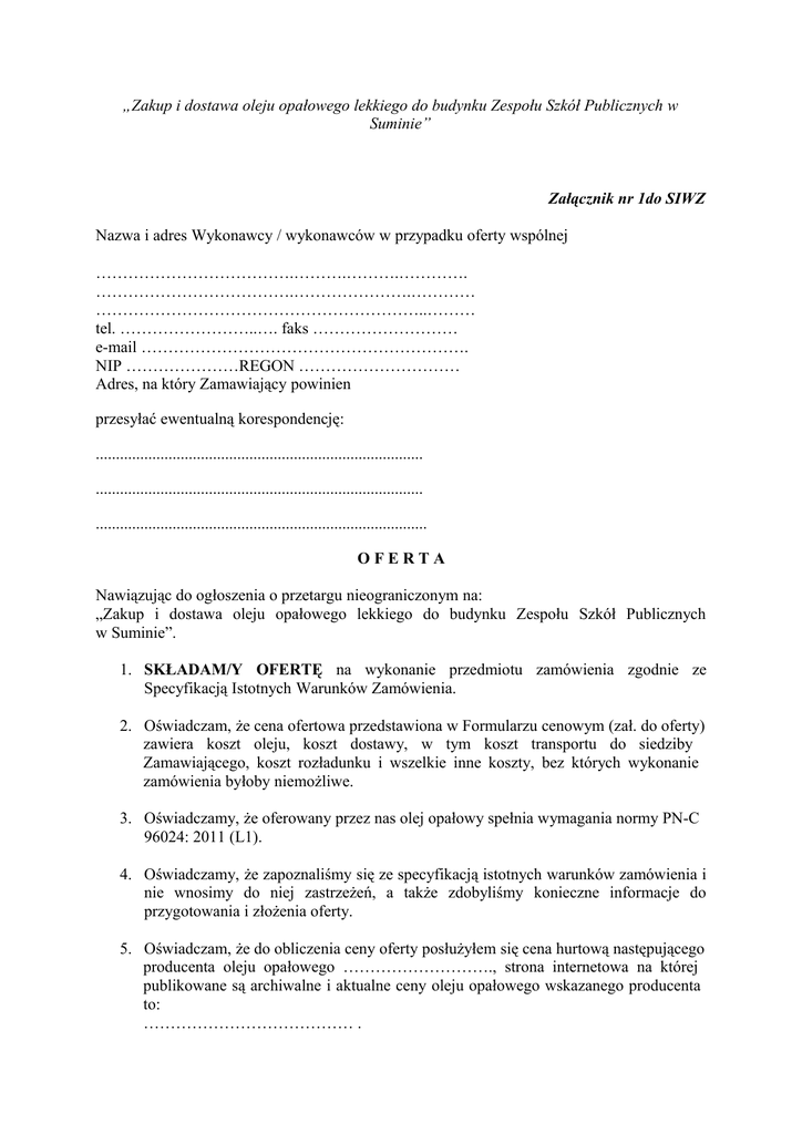 „Zakup i dostawa oleju opałowego lekkiego do budynku Zespołu Szkół Publicznych w Suminie” Załącznik nr 1do SIWZ Nazwa i adres Wykonawcy / wykonawców w przypadku oferty wspólnej ……………………………….……….……….…………. ……………………………….………………….………… ……………………………………………………..……… tel. ……………………..…. faks ……………………… e-mail ……………………………………………………. NIP …………………REGON ………………………… Adres, na który Zamawiający powinien przesyłać ewentualną korespondencję: ................................................................................. ................................................................................. .................................................................................. OFERTA Nawiązując do ogłoszenia o przetargu nieograniczonym na: „Zakup i dostawa oleju opałowego lekkiego do budynku Zespołu Szkół Publicznych w Suminie”. 1. SKŁADAM/Y OFERTĘ na wykonanie przedmiotu zamówienia zgodnie ze Specyfikacją Istotnych Warunków Zamówienia. 2. Oświadczam, że cena ofertowa przedstawiona w Formularzu cenowym (zał. do oferty) zawiera koszt oleju, koszt dostawy, w tym koszt transportu do siedziby Zamawiającego, koszt rozładunku i wszelkie inne koszty, bez których wykonanie zamówienia byłoby niemożliwe. 3. Oświadczamy, że oferowany przez nas olej opałowy spełnia wymagania normy PN-C 96024: 2011 (L1). 4. Oświadczamy, że zapoznaliśmy się ze specyfikacją istotnych warunków zamówienia i nie wnosimy do niej zastrzeżeń, a także zdobyliśmy konieczne informacje do przygotowania i złożenia oferty. 5. Oświadczam, że do obliczenia ceny oferty posłużyłem się cena hurtową następującego producenta oleju opałowego ………………………., strona internetowa na której publikowane są archiwalne i aktualne ceny oleju opałowego wskazanego producenta to: ………………………………… . „Zakup i dostawa oleju opałowego lekkiego do budynku Zespołu Szkół Publicznych w Suminie” 6. Oświadczamy, że wyliczony współczynnik narzutu będzie stały i niezmienny przez cały okres realizacji zamówienia. 7. Oświadczamy, że uważamy się za związanych niniejszą ofertą na okres 30 dni, licząc od upływu terminu składania ofert. 8. Oświadczamy, że zawarty w specyfikacji istotnych warunków zamówienia projekt umowy został przez nas zaakceptowany i zobowiązujemy się, w przypadku przyznania nam zamówienia do zawarcia umowy na wyżej wymienionych warunkach, w miejscu i terminie wyznaczonym przez Zamawiającego. 9. Zamówienie będziemy realizować sukcesywnie (w miarę potrzeb określonych przez Zamawiającego w sposób określony w projekcie umowy) do dnia 18 grudnia 2015 roku. 10. Oświadczamy, że akceptujemy warunki płatności określone we wzorze umowy. 11. W związku z żądaniem Zamawiającego wskazania części zamówienia, których wykonanie zamierzamy powierzyć Podwykonawcom oświadczamy, że przez podwykonawców będą wykonane: (wypełniają Wykonawcy przewidujący do wykonania zamówienia zatrudnienie Podwykonawców). ………………………………………………………………………………………. …………………………………………………………………………………….... 12. Zawarcie umów z Podwykonawcami nastąpi po uprzedniej pisemnej zgodzie Zamawiającego, uzyskanej w terminie 14 dni od przedstawienia projektów umów (art. 647 1 § 2 Kodeksu cywilnego). 13. Oświadczamy, że podmiotem uprawnionym do wystawienia faktur i otrzymania wynagrodzenia jest : …………………………….…………………………………… 14. Wykonawca przedstawił ofertę na ………………….. kolejno ponumerowanych stronach. …………………………………………….. (miejscowość, data) …………………………………………………… podpis osoby (osób) uprawnionej (-ych) do reprezentowania wykonawcy ………………………………………………. (pieczęć firmowa) Informacja dla wykonawcy: Formularz oferty musi być podpisany przez osobę lub osoby uprawnione do reprezentowania firmy i przedłożony wraz z dokumentem (-ami) potwierdzającymi prawo do reprezentacji wykonawcy przez osobę podpisującą ofertę. „Zakup i dostawa oleju opałowego lekkiego do budynku Zespołu Szkół Publicznych w Suminie” Załącznik do oferty FORMULARZ CENOWY (pieczęć Wykonawcy/Wykonawców) „Zakup i dostawa oleju opałowego lekkiego do budynku Zespołu Szkół Publicznych w Suminie” Wyliczenie współczynnika narzutu WYKONAWCY Lp. Nazwa elementu 1 Cena jednostkowa netto oleju opałowego Wykonawcy w dniu ogłoszenia przetargu (13.01. 2015 r.) = Cd pocz. (cena ofertowa do przeniesienia obliczenia wartości ofertowej) Cena za 1 litr netto w zł /PLN/* Cd – Cena dostawcy/wykonawcy 2 Cena jednostkowa netto oleju opałowego hurtowa określona przez producenta w dniu ogłoszenia przetargu (13.01.2015r. ) = C p pocz. Cp – cena producenta 3 Współczynnik narzutu dostawcy oleju opałowego ** Wn dostawcy = C d pocz / C p pocz Wiersz 1/wiersz 2 = Wyliczenie wartości ofertowej Lp. Nazwa elementu 1 Dostawy oleju opałowego lekkiego j. m. litr ilość cena jedn. netto zł/litr*** wartość netto zł /PLN/* 18000 Razem wartość netto zł Podatek VAT 23% zł zł Razem wartość ofertowa dostaw brutto __________________ dnia __ __ 2015 roku * ceny należy podawać z dokładnością do dwóch miejsc po przecinku ** współczynnik narzutu należy obliczyć z dokładnością do czterech miejsc po przecinku *** cena przyjęta do obliczenia wartości ofertowej ma być równa cenie jednostkowej netto Wykonawcy z poz. 1 tabeli „wyliczenia współczynnika narzutu” ………………………………………………………