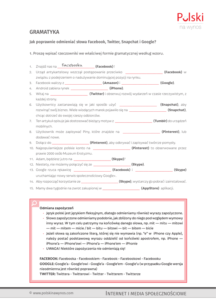 na wynos GRAMATYKA Jak poprawnie odmieniać słowa Facebook, Twitter, Snapchat i Google? 1. Proszę wpisać rzeczowniki we właściwej formie gramatycznej według wzoru. Facebooku 1. Znajdź nas na _______________________ (Facebook) ! 2. Urząd antykartelowy wszczął postępowanie przeciwko _______________________ (Facebook) w związku z podejrzeniem o nadużywanie dominującej pozycji na rynku. 3. Facebook walczy z _______________________ (Amazon) i _______________________ (Google). 4. Android zabiera rynek _______________________ (iPhone). 5. Witaj na _______________________ (Twitter) i obserwuj rozwój wydarzeń w czasie rzeczywistym, z każdej strony. 6. Użytkownicy zastanawiają się w jaki sposób użyć _______________________ (Snapchat), aby rozwinąć swój biznes. Wiele wiodących marek pojawiło się na _______________________ (Snapchat), chcąc dotrzeć do swojej rzeszy odbiorców. 7. Ten artykuł opisuje jak dostosować bieżący motyw z _______________________ (Tumblr) do urządzeń mobilnych. 8. Użytkownik może zapisywać Piny, które znajdzie na _______________________ (Pinterest), lub dodawać nowe. 9. Dołącz do _______________________ (Pinterest), aby odkrywać i zapisywać twórcze pomysły. 10. Najpopularniejsze polskie konto na _______________________ (Pinterest) to obserwowane przez prawie 2000 osób Muzeum Erotyzmu. 11. Adam, będziesz jutro na _______________________ (Skype)? 12. Niestety, nie możemy połączyć się ze _______________________ (Skype). 13. Google rzuca rękawicę _______________________ (Facebook) i _______________________ (Skype) uruchamiając nowy serwis społecznościowy Google+. 14. Aby rozpocząć korzystanie ze _______________________ (Skype), wystarczy go pobrać i zainstalować. 15. Mamy dwa tygodnie na zwrot zakupionej w _______________________ (AppStore) aplikacji. Odmiana zapożyczeń • Język polski jest językiem fleksyjnym, dlatego odmieniamy również wyrazy zapożyczone. • Słowo zapożyczone odmieniamy podobnie, jak zbliżony do niego pod względem wymowy inny wyraz. W tym celu patrzymy na końcówkę danego słowa, np. mit — mitu — mitowi — mit — mitem — micie / bit — bitu — bitowi — bit — bitem — bicie • Jeżeli słowa są zakończone literą, której się nie wymawia (np. “e” w iPhone czy Apple), należy postać podstawową wyrazu oddzielić od końcówki apostrofem, np. iPhone — iPhone’a — iPhone’owi — iPhone’a — iPhone’em — iPhonie • UWAGA! Niektóre zapożyczenia nie odmieniają się! FACEBOOK: Facebooka - Facebookiem - Facebook - Facebookowi - Facebooku GOOGLE: Google’a - Google’owi - Google’a - Google’em - Google’u (w przypadku Google wersja nieodmienna jest również poprawna) TWITTER: Twittera - Twitterowi - Twitter - Twitterem - Twitterze © www.polskinawynos.com INTERNET I MEDIA SPOŁECZNOŚCIOWE