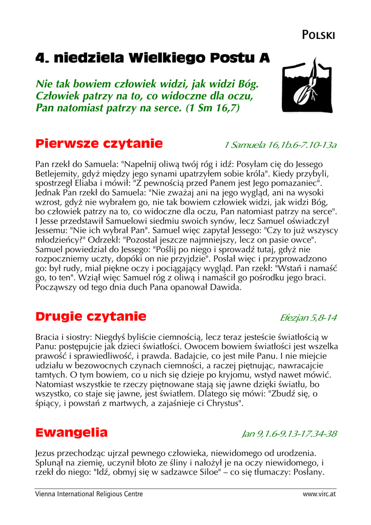 Polski Nie tak bowiem człowiek widzi, jak widzi Bóg. Człowiek patrzy na to, co widoczne dla oczu, Pan natomiast patrzy na serce. (1 Sm 16,7) Pan rzekł do Samuela: "Napełnij oliwą twój róg i idź: Posyłam cię do Jessego Betlejemity, gdyż między jego synami upatrzyłem sobie króla". Kiedy przybyli, spostrzegł Eliaba i mówił: "Z pewnością przed Panem jest Jego pomazaniec". Jednak Pan rzekł do Samuela: "Nie zważaj ani na jego wygląd, ani na wysoki wzrost, gdyż nie wybrałem go, nie tak bowiem człowiek widzi, jak widzi Bóg, bo człowiek patrzy na to, co widoczne dla oczu, Pan natomiast patrzy na serce". I Jesse przedstawił Samuelowi siedmiu swoich synów, lecz Samuel oświadczył Jessemu: "Nie ich wybrał Pan". Samuel więc zapytał Jessego: "Czy to już wszyscy młodzieńcy?" Odrzekł: "Pozostał jeszcze najmniejszy, lecz on pasie owce". Samuel powiedział do Jessego: "Poślij po niego i sprowadź tutaj, gdyż nie rozpoczniemy uczty, dopóki on nie przyjdzie". Posłał więc i przyprowadzono go: był rudy, miał piękne oczy i pociągający wygląd. Pan rzekł: "Wstań i namaść go, to ten". Wziął więc Samuel róg z oliwą i namaścił go pośrodku jego braci. Począwszy od tego dnia duch Pana opanował Dawida. Bracia i siostry: Niegdyś byliście ciemnością, lecz teraz jesteście światłością w Panu: postępujcie jak dzieci światłości. Owocem bowiem światłości jest wszelka prawość i sprawiedliwość, i prawda. Badajcie, co jest miłe Panu. I nie miejcie udziału w bezowocnych czynach ciemności, a raczej piętnując, nawracajcie tamtych. O tym bowiem, co u nich się dzieje po kryjomu, wstyd nawet mówić. Natomiast wszystkie te rzeczy piętnowane stają się jawne dzięki światłu, bo wszystko, co staje się jawne, jest światłem. Dlatego się mówi: "Zbudź się, o śpiący, i powstań z martwych, a zajaśnieje ci Chrystus". Jezus przechodząc ujrzał pewnego człowieka, niewidomego od urodzenia. Splunął na ziemię, uczynił błoto ze śliny i nałożył je na oczy niewidomego, i rzekł do niego: "Idź, obmyj się w sadzawce Siloe" – co się tłumaczy: Posłany. Vienna International Religious Centre www.virc.at On więc odszedł, obmył się i wrócił widząc. A sąsiedzi i ci, którzy przedtem widywali go jako żebraka, mówili: "Czyż to nie jest ten, który siedzi i żebrze?" Jedni twierdzili: "Tak, to jest ten", a inni przeczyli: "Nie, jest tylko do tamtego podobny". On zaś mówił: "To ja jestem". Zaprowadzili więc tego człowieka, niedawno jeszcze niewidomego, do faryzeuszów. A dnia tego, w którym Jezus uczynił błoto i otworzył mu oczy, był szabat. I znów faryzeusze pytali go o to, w jaki sposób przejrzał. Powiedział do nich: "Położył mi błoto na oczy, obmyłem się i widzę". Niektórzy więc spośród faryzeuszów rzekli: "Człowiek ten nie jest od Boga, bo nie zachowuje szabatu". Inni powiedzieli: "Ale w jaki sposób człowiek grzeszny może czynić takie znaki?" I powstało wśród nich rozdwojenie. Ponownie więc zwrócili się do niewidomego: "A ty, co o Nim myślisz w związku z tym, że ci otworzył oczy?" Odpowiedział: "To jest prorok". Na to dali mu taką odpowiedź: "Cały urodziłeś się w grzechach, a śmiesz nas pouczać?" I precz go wyrzucili. Jezus usłyszał, że wyrzucili go precz, i spotkawszy go rzekł do niego: "Czy ty wierzysz w Syna Człowieczego?" On odpowiedział: "A któż to jest, Panie, abym w Niego uwierzył?" Rzekł do niego Jezus: "Jest Nim Ten, którego widzisz i który mówi do ciebie". On zaś odpowiedział: "Wierzę, Panie!" i oddał Mu pokłon. W pewnym miejscu Biblii czytamy, jak Jezus wysławia Ojca w niebie, ponieważ tajemnicę Królestwa Bożego objawia maluczkim, a zakrywa przed mędrcami. Wyraża przez to jasno i zrozumiale, że wartościowanie jest u Boga inne, a rzeczy przy Nim się zmieniają. Takim znaczącym przykładem zamiany mądrości i głupoty jest dzisiejsza Ewangelia: Jezus przyszedł na świat, aby ślepi widzieli, a widzący stali się ślepcami (por. J 9,39). Ludzie, którzy spotykają Jezusa opowiadają się za Nim albo przeciwko Niemu. Wielu, jak na przykład faryzeusze, uważa się za widzących, mądrych i rozumiejących. Nie spostrzegają jednak, jak bardzo związani są swoim ograniczonym sposobem widzenia, a dzieło Bożego Posłańca mierzą ograniczoną miarą swojej ludzkiej mądrości. W rzeczywistości są ślepcami, ponieważ nie chcą widzieć Światła, które przyszło na świat i bronią się przed jego uznaniem. W ślepocie swojego serca mogą stwierdzić tylko jedno: "o tym tam nie wiemy, skąd pochodzi". (J 9,29) Uzdrowiony ślepiec wie jedno: mężczyzna, który otworzył mu oczy może pochodzić tylko od Boga. Jego pokorna postawa pomaga mu pośród sprzeciwu, z którym jest natychmiast konfrontowany, zachować pewność wiary w Boga. Z tego zaufania ślepca do swojego wybawcy Jezus może uczynić go widzącym powtórnie tak, że poza Jezusem człowiekiem rozpoznaje on Syna Człowieczego i Pana oraz przyjmuje prawdę i rzeczywistość Boga. Życie chrześcijanina jest długą drogą do światła, która bierze swój początek w chrzcie. Bóg stworzył człowieka po to, by widział, dał mu oczy ciała, światło ducha i moc serca. Jednak człowiek uczy się powoli używania tych darów. Poprzez światło i cień tego świata dotrzemy w zmartwychwstaniu do całkowitej światłości Królestwa Bożego, gdzie nasze światło złączy się na zawsze z światłem Chrystusa. Vienna International Religious Centre [email protected] Nie tak bowiem człowiek widzi, jak widzi Bóg. Człowiek patrzy na to, co widoczne dla oczu, Pan natomiast patrzy na serce. (1 Sm 16,7) Pan rzekł do Samuela: "Napełnij oliwą twój róg i idź: Posyłam cię do Jessego Betlejemity, gdyż między jego synami upatrzyłem sobie króla". Kiedy przybyli, spostrzegł Eliaba i mówił: "Z pewnością przed Panem jest Jego pomazaniec". Jednak Pan rzekł do Samuela: "Nie zwa