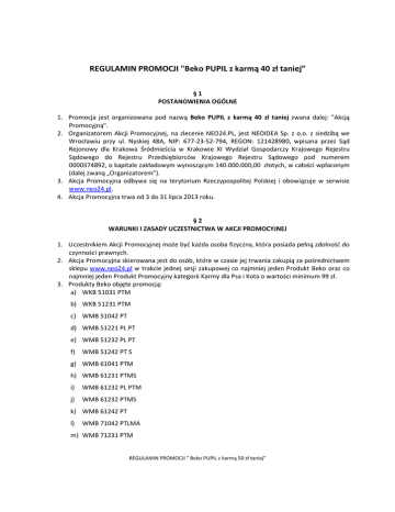 REGULAMIN PROMOCJI "Beko PUPIL z karmą 40 zł taniej” §1 POSTANOWIENIA OGÓLNE 1. Promocja jest organizowana pod nazwą Beko PUPIL z karmą 40 zł taniej zwana dalej: "Akcją Promocyjną". 2. Organizatorem Akcji Promocyjnej, na zlecenie NEO24.PL, jest NEOIDEA Sp. z o.o. z siedzibą we Wrocławiu przy ul. Nyskiej 48A, NIP: 677-23-52-794, REGON: 121428980, wpisana przez Sąd Rejonowy dla Krakowa Śródmieścia w Krakowie XI Wydział Gospodarczy Krajowego Rejestru Sądowego do Rejestru Przedsiębiorców Krajowego Rejestru Sądowego pod numerem 0000374892, o kapitale zakładowym wynoszącym 140.000.000,00 złotych, w całości wpłaconym (dalej zwaną „Organizatorem”). 3. Akcja Promocyjna odbywa się na terytorium Rzeczypospolitej Polskiej i obowiązuje w serwisie www.neo24.pl. 4. Akcja Promocyjna trwa od 3 do 31 lipca 2013 roku. §2 WARUNKI I ZASADY UCZESTNICTWA W AKCJI PROMOCYJNEJ 1. Uczestnikiem Akcji Promocyjnej może być każda osoba fizyczna, która posiada pełną zdolność do czynności prawnych. 2. Akcja Promocyjna skierowana jest do osób, które w czasie jej trwania zakupią za pośrednictwem sklepu www.neo24.pl w trakcie jednej sesji zakupowej co najmniej jeden Produkt Beko oraz co najmniej jeden Produkt Promocyjny kategorii Karmy dla Psa i Kota o wartości minimum 99 zł. 3. Produkty Beko objęte promocją: a) WKB 51031 PTM b) WKB 51231 PTM c) WMB 51042 PT d) WMB 51221 PL PT e) WMB 51232 PL PT f) WMB 51242 PT S g) WMB 61041 PTM h) WMB 61231 PTMS i) WMB 61232 PL PTM j) WMB 61232 PTMS k) WMB 61242 PT l) WMB 71042 PTLMA m) WMB 71231 PTM REGULAMIN PROMOCJI " Beko PUPIL z karmą 50 zł taniej” n) WMB 71232 PTM o) WMB 71242 PT LA p) WMB 71444 HPTLA q) WMB 71643 PTL 4. Produkty Promocyjne z kategorii Karmy dla Psa i Kota objęte promocją: a) Wszystkie dostępne produkty w sklepie neo24.pl w kategorii Karmy dla Psa o wartości minimum 99 zł. b) Wszystkie dostępne produkty w sklepie neo24.pl w kategorii Karmy dla Kota o wartości minimum 99 zł. 5. Promocja polega na otrzymaniu przez Uczestnika kodu rabatowego uprawniającego do zniżki w wysokości 40 zł na zakup Karmy dla Psa lub Kota w sklepie neo24.pl pod warunkiem zawarcia transakcji w sklepie internetowym www.neo24.pl na Produkty Promocyjne zawarte w §2 w punkcie 3 i 4. 6. Aby skorzystać z rabatu, należy po umieszczeniu Produktu Promocyjnego Beko oraz Produktu z kategorii Karmy dla Psa i Kota w koszyku sklepu internetowego www.neo24.pl wpisać kod rabatowy o treści: BEKOPUPIL §3 PRODUKT PROMOCYJNY 1. Każdemu Uczestnikowi Akcji Promocyjnej spełniającemu warunki Akcji Promocyjnej przysługuje kod promocyjny. 2. Akcja promocyjna obowiązuje od 3 do 31 lipca 2013 r. §5 POSTANOWIENIA KOŃCOWE 1. Regulamin niniejszy jest jedynym dokumentem określającym zasady Akcji Promocyjnej. 2. Wszelkie reklamacje dotyczące przebiegu Akcji Promocyjnej Uczestnicy mogą zgłaszać w formie pisemnej pod rygorem nieważności, przez cały czas trwania Promocji oraz w terminie 14 dni od dnia zakończenia Akcji Promocyjnej. Reklamacje należy przesyłać listem poleconym do Organizatora, na adres NEOIDEA Sp. z o.o., ul. Nyska 48A, 50-505 Wrocław. O zachowaniu terminu złożenia reklamacji decyduje data stempla pocztowego. Uczestnik Akcji Promocyjnej zgłaszający reklamację zostanie powiadomiony pisemnie o wyniku postępowania reklamacyjnego. 3. Udział Uczestnika w Akcji Promocyjnej oznacza akceptację jej zasad zawartych w niniejszym regulaminie. 4. Organizator zastrzega sobie prawo do zmiany niniejszego regulaminu w czasie trwania Akcji Promocyjnej, z tym, że zmiany te nie mogą naruszać praw już nabytych przez Uczestników Akcji Promocyjnej. 5. Wszelkie materiały promocyjno– reklamowe mają charakter wyłącznie informacyjny. 6. Regulamin niniejszy jest dostępny: a) Na stronie promocji b) w siedzibie NEOIDEA Sp z o.o. REGULAMIN PROMOCJI " Beko PUPIL z karmą 50 zł taniej”