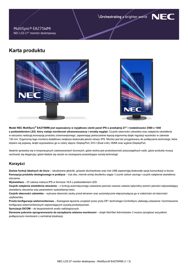 MultiSync® EA275WMi NEC LCD 27" monitor desktopowy Karta produktu Model NEC MultiSync® EA275WMi jest wyposażony w wyjątkowo cienki panel IPS o przekątnej 27" i rozdzielczości 2560 x 1440 z podświetleniem LED, który nadaje monitorowi ultranowoczesny i smukły wygląd. Czujniki obecności człowieka oraz natężenia oświetlenia w otoczeniu realizują koncepcję produktu zrównoważonego, zapewniając jednocześnie lepszą ergonomię dzięki regulacji wysokości w zakresie 130 mm. Ergonomię tego monitora dodatkowo zwiększa doskonała jakość obrazu IPS. Monitor jest też przygotowany do podłączania technologii, które dopiero się pojawią, dzięki wyposażeniu go w cztery złącza: DisplayPort, DVI-I (Dual Link), HDMI oraz wyjście DisplayPort. Idealnie sprawdza się w korporacyjnych zastosowaniach biurowych, gdzie istotna jest produktywność poszczególnych osób, gdzie produkty muszą cechować się elegancją i gdzie kładzie się nacisk na rozwiązania przewidujące rozwój technologii. Korzyści Zestaw funkcji idealnych do biura – wbudowane głośniki, gniazdo słuchawkowe oraz hub USB zapewniają doskonałe opcje komunikacji w biurze. Koncepcja produktu ekologicznego w praktyce – tryb eko, miernik emisji dwutlenku węgla / Licznik carbon savings i czujnik natężenia oświetlenia otoczenia. Wyświetlacz – 27-calowa matryca IPS w formacie 16:9 z podświetleniem LED. Czujnik natężenia oświetlenia otoczenia – z funkcją automatycznego ustawiania jasności zawsze ustawia optymalny poziom jasności odpowiadający oświetleniu otoczenia oraz parametrom wyświetlanej treści. Czujnik obecności człowieka – wykrywa obecność osoby przed ekranem oraz automatycznie włącza/wyłącza go w zależności od obecności użytkownika. Prosta konfiguracja wielomonitorowa – Szeregowe łączenie urządzeń przez porty DP i technologia ControlSync ułatwiają ustawianie i kontrolowanie konfiguracji wielomonitorowych zapewniających wysoką produktywność. Symulacja DICOM – do bezpośrednich analiz radiologicznych. Darmowe pobranie oprogramowania do zarządzania wieloma monitorami – dzięki NaViSet Administrator 2 można zarządzać wszystkimi podłączonymi monitorami z centralnej lokalizacji. NEC LCD 27 monitor desktopowy - MultiSync® EA275WMi (1 / 3) Informacje o produkcie Nazwa produktu MultiSync® EA275WMi Grupa produktowa NEC LCD 27" monitor desktopowy Kod produktu 60003813 (BK), 60003814 (WH) Wyświetlacz Rodzaj panelu Monitor IPS TFT z podświetleniem W-LED Wielkość ekranu [cale/cm] 27 / 68.5 Proporcje obrazu 16:9 Rozmiar plamki [mm] 0.233 Jasność [cd/m²] 350 Kontrast 1000:1 (20000:1 kontrast dynamiczny) Kąty widzenia [°] 178 poziomo / 178 pionowo (CR 10:1) Czas reakcji [ms] 6 Ilość kolorów [Mln] 16.77 Częstotliwość synchronizacji Częstotliwość pozioma [kHz] 31.5 - 83 Częstotliwość pionowa [Hz] 56 - 75 Rozdzielczość Rozdzielczość optymalna 2560 x 1440 przy 60 Hz Obsługiwane rozdzielczości 2560 x 1440; 1920 x 1440; 1920 x 1080; 1600 x 1200; 1280 x 1024; 1152 x 864; 1024 x 768; 832 x 624; 800 x 600; 640 x 480 Możliwości podłączania Cyfrowe 1 x DisplayPort; 1 x DisplayPort out; 1 x HDMI; USB wer. 3 (port typu Uplink x 1 / port typu Downlink x 2) wer. 2 (port typu Downlink x 1) Cyfrowe / Analogowe: 1 x DVI-I; Dual Link DVI Parametry elektryczne Pobór mocy [W] 35 (Tryb Eco); 47 (typ.); 57 (maks.) Tryb Power Save [W] 0.47 Zasilanie 1.2 A/0.6 A; 100-120 V/220-0 V; internal power supply Warunki otoczenia Temperatura otoczenia podczes pracy [°C] +5 do +35 Wilgotność otoczenia podczas pracy [%] 20 do 80 Ergonomia Regulacja wysokości[mm] 130 Pochylenie ekranu w pionie [°] -5 to +30 Obrót ekranu w poziomie [°] -170 to +170 Ekran obrotowy (Pivot) [°] 0 do 90 (tryb standardowy i portretowy) NEC LCD 27 monitor desktopowy - MultiSync® EA275WMi (2 / 3) Parametry mechaniczne Wymiary [mm] 639.2 x 417.9 x 230 Waga [kg] 8.7 Mocowanie VESA [mm] 100 x 100 Dodatkowe Funkcje Cechy Specjalne Automatyczna regulacja kontrastu; ControlSync®; Czujnik natężenia oświetlenia otoczenia dla zachowania optymalnej jasności; Czujnik obecności użytkownika przed monitorem; ErgoDesign®: regulacja wysokości ekranu do (130 mm) oraz funcja Pivot 90°; Funkcja Customize Setting [przywracanie ustawień po zmianach użytkowników]; Kompatybilność z Windows 8; Licznik Carbon footprint; Licznik carbon savings; Picture-byPicture (obraz obok obrazu); Symulacja DICOM; System podświetlenia za pomocą diod LED; Tryby ekonomiczne; Wszechstronność i prosta instalacja (standard VESA) dzięki NaViSet i NaViKey Wersje kolorystyczne Biała ramka ekranu, biała obudowa; Czarna ramka ekranu, czarna obudowa Zarządzanie kablami tak Złącze Kensington tak Plug and Play DDC2B/2Bi; EDID Standard; VESA DDC/CI Głośniki 1W + 1W (z możliwością wyłączenia); Headphone Jack Funkcje regulacji Audio Volume / Lock-Out; Automatyczne dostosowanie; Blokada menu OSD; Control Sync; DV Mode; Fine Adjust (tylko dla złącza analogowego); Human Sensing; Informacje o monitorze; Inteligentny system zarządzania energią; NTAA (Non-Touch-Auto-Adjustment); Power-Off Timer; przywracanie ustawień za pomocą jednego przycisku; Regulacja jasności; regulacja kontrastu; sRGB; temperatury barwowej; Tryb ekonomiczny; wybór języka OSD Zawartość opakowania kabel Control Sync; Kabel DisplayPort; kabel USB; Kabel zasilający; Monitor; Przewodnik po instalacji Bezpieczeństwo i ergonomia CE; EnergyStar 6.0; ErP; FCC Class B; ISO 9241-307 (pixel failure class I); MPR II/ MPR III; PCT/Gost; RoHS; TCO 6.0; TÜV Ergonomics; TÜV GS; UL/C-UL lub CSA Gwarancja 3 lata (w tym na podświetlenie ekranu); opcjonalne przedłużenie gwarancji na 4. i 5. rok Funkcje eko Użyteczna powierzchnia [cale/cm] Czujnik obecności użytkownika; Czujnik światła zewnętrznego; Klasa efektywności energetycznej: B; Licznik Carbon footprint / Licznik carbon savings; Roczne zużycie energii: 60 kWh (na podstawie 4 god