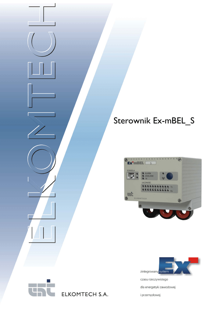 Sterownik Ex-mBEL_S Sterownik Ex-mBEL_S Przeznaczenie Sterownik Ex-mBEL_S jest stacją telemechaniki (RTU) przeznaczoną do sterowania rozłącznikami i odłącznikami słupowymi w sieciach średnich napięć. W standardowej konfiguracji sprzętowej sterownik wykrywa prądy zwarciowe fazowe, prąd doziemny oraz obecność napięcia. W zależności od wykrytego zwarcia i stanu sieci sterownik wykonuje odpowiednie sterowanie łącznikiem. Szczególną cechą tego urządzenia jest możliwość jednoczesnej komunikacji z centrami nadzoru w dwóch wybranych radiowych systemach łączności (GPRS i TETRA lub TRUNKING) i w różnych lub tych samych protokołach łączności. Sterownik jest wyposażony w pięć kanałów komunikacyjnych, z których dwa są przeznaczone do łączności z systemem nadzoru, zaś pozostałe kanały mogą być wykorzystane do połączenia z innymi urządzeniami cyfrowymi przy użyciu standardowych protokołów. Dzięki takiemu rozwiązaniu sterownik może pełnić rolę koncentratora danych i konwertera protokołów dla tych urządzeń. W wersji standardowej (współpraca z odłącznikiem) urządzenie sygnalizuje zwarcie bez operacji łącznikiem. W wersji współpracującej z rozłącznikiem może również otwierać rozłącznik w wybranej przerwie beznapięciowej SPZ, a w przypadku zwarć doziemnych wyłączać rozłącznik. Wyłączanie odbywa się z kontrolą prądu. - Funkcje reklozerowe W wariancie, gdy urządzenie współpracuje z reklozerem, Ex-mBEL_S może po wykryciu zwarcia wyłączyć obwód (przerywać prąd zwarciowy), i lokalnie realizować cykl SPZ. Automatyka reklozera jest w pełni programowalna i może być dostosowana do potrzeb użytkownika. Sterownik może także współpracować z dodatkowymi zewnętrznymi modułami wykrywającymi przepływ prądu zwarciowego (Ex-ML_NBAS_D – łącze RS485). Sterownik należy do grupy urządzeń Ex-mBEL, na którą składają się, oprócz telemechaniki, automatyki zabezpieczeniowe oraz koncentratory komunikacyjne. Urządzenia te zaprojektowano dla układów sieciowych, w których zamiast uniwersalnych urządzeń automatyki zabezpieczeniowej operujących kompletem funkcji, można zastosować specjalizowane moduły ukierunkowane na wypełnianie konkretnych zadań. Oprogramowanie sterownika zostało oparte o wielozadaniowy system Wx. Funkcje - Funkcje zabezpieczeniowe: - Wykrywanie prądu zwarciowego Sterownik kontroluje przepływ prądu w trzech fazach oraz wylicza składową zerową prądu z próbek prądów fazowych. Prądy fazowe są mierzone dwutorowo w zakresie nominalnym i zwarciowym, co zapewnia wysoką dokładność pomiarów telemechanicznych oraz wysoką dynamikę toru zwarciowego. Rozwiązanie to zapewnia również dużą dokładność wyznaczania prądu zerowego w całym zakresie pomiarowym. W oparciu o te pomiary sterownik realizuje zabezpieczenie nadprądowe fazowe dwustopniowe oraz zabezpieczenie nadprądowe ziemnozwarciowe. Dodatkowo sterownik kontroluje zawartość drugiej harmonicznej w prądzie fazowym co pozwala odróżnić udar prądu magnesującego w czasie załączania linii od prądu zwarciowego. Sterownik Ex-mBEL_S - Funkcje telemechaniczne: - Telesygnalizacja Wykrywanie zmian z rozdzielczością czasową 1ms; wysyłanie zdarzeń z lokalnie nadawaną cechą czasu; generowanie sekwencji zdarzeń (SOE). - Telesterowania Możliwość telesterowania łącznikiem oraz telekasowania pobudzeń. Przed wykonaniem sterowania jest kontrolowana jego cecha czasu. Czas trwania impuls sterowniczego jest programowalny ( ≤ 5s). - Telepomiary Opcjonalnie sterownik może wysyłać do centrum nadzoru pomiary prądów fazowych, prądu I0 oraz jednego napięcia. Dodatkowo, po zadziałaniu zabezpieczenia, do centrum są wysyłane, wartości prądów zwarciowych fazowych i prądu I0. - Realizacja blokad stacyjnych, polowych (opcja): Sterownik może realizować blokady logiczne. Funkcja blokad umożliwia przypisanie do każdego polecenia sterowniczego warunków powodujących jego odrzucenie. Informacja o odrzuceniu polecenia i przyczynach, które je spowodowały jest wysyłana do systemu nadzoru. - Koncentracja danych z innych urządzeń: Ex-mBEL_S może być zastosowany jako koncentrator danych i konwerter protokołów. Ex-mBEL_S -rozmieszczenie kanałów komunikacyjnych Budowa Obudowa urządzenia jest wykonana z profilu aluminiowego. Sterownik może być wykonany w wersji podstawowej (obudowa jednomodułowa) lub w wersji rozszerzonej (obudowa składa się z modułu podstawowego i modułu rozszerzenia). W wersji rozszerzonej sterownik może być wyposażony w dodatkowe pakiety wejścia-wyjścia oraz panel synoptyczny. Zasoby wersji podstawowej: - MBELMPU - pakiet mikroprocesora, - MBELPS - pakiet zasilacza z 3 wyjściami sterowniczymi i 5 wejściami dwustanowymi, - MBELCMB - pakiet z jednym wejściem pomiaru napięcia, - MBELTRF - pakiet z 3 wejściami pomiaru prądów fazowych - 5 kanałów komunikacyjnych W wersji rozszerzonej urządzenie może być dodatkowo wyposażone w: - MBELEKM - panel synoptyczny (20 diod, 4 klawisze); - MBELBI - pakiet 16 wejść sygnalizacyjnych; - MBELBO - pakiet 8 wyjść sterowniczych. Skompletowanie modułu rozszerzenia zależy od wariantu wykonania (zamówienia). Kanały szeregowe Sterownik jest wyposażony w 5 kanałów komunikacyjnych: - COM 1 - COM 2 - COM 3 - COM 4 i 5 - kanał RS232 do łączności z terminalem systemu Tetra lub terminalem trunkingowym; może być skonfigurowany do pracy z poziomami TTL (0 - 5 V), - kanał RS232 do łączności z modem GPRS (Ex-MGP). - kanał asynchroniczny z interfejsem do światłowodów plastikowych - 2 interfejsy RS422/485 do łączności z innymi urządzeniami np. sterownikiem zasilacza / UPS-a lub zewnętrznymi detektorami prądu zwarciowego Ex-ML_NBAS_D. Wszystkie kanały są izolowane galwanicznie. Kanał diagnostyczny-parametryzacja sterownika Sterownik jest wyposażony w lokalny kanał diagnostyczny RS232 ze złączem typu RJ-