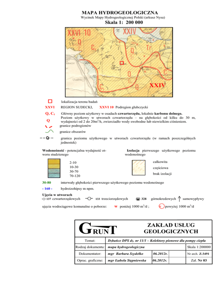 MAPA HYDROGEOLOGICZNA Wycinek Mapy Hydrogeologicznej Polski (arkusz Nysa) Skala 1: 200 000 XXIV XXVI Q, C1 Q lokalizacja terenu terenu badań badań lokalizacja REGION SUDECKI, XXVI 10 Podregion głubczycki Główny poziom uŜytkowy w osadach czwartorzędu, lokalnie karbonu dolnego. Poziom uŜytkowy w utworach czwartorzędu – na głębokości od kilku do 30 m, wydajności od 2 do 20m3/h, zwierciadło wody swobodne lub niewielkim ciśnieniem. granice podregionów granice obszarów Q granica poziomu uŜytkowego w utworach czwartorzędu (w ramach poszczególnych jednostek) Wodonośność - potencjalna wydajność otworu studzienego Izolacja pierwszego uŜytkowego poziomu wodonośnego 2-10 10-30 30-70 70-120 całkowita częściowa brak izolacji 30-80 interwały głębokości pierwszego uŜytkowego poziomu wodonośnego - 160 - hydroizohipsy m npm. Ujęcia w utworach 137 czwartorzędowych 133 trzeciorzędowych ujęcia wodociągowe komunalne o poborze: 328 w poniŜej 1000 m3/d ; GRUNT Temat: górnokredowych W powyŜej 1000 m3/d ZAKŁAD USŁUG GEOLOGICZNYCH Dzbańce DPS dz. nr 11/1 – Kolektory pionowe dla pompy ciepła Rodzaj dokumentu: mapa hydrogeologiczna Dokumentator: Oprac. graficzne: samowypływy Skala 1:200000 mgr Barbara Szydełko 06.2012r. Nr arch. Z-3491 mgr Izabela Stępniewska 06.2012r. Zał. Nr 03