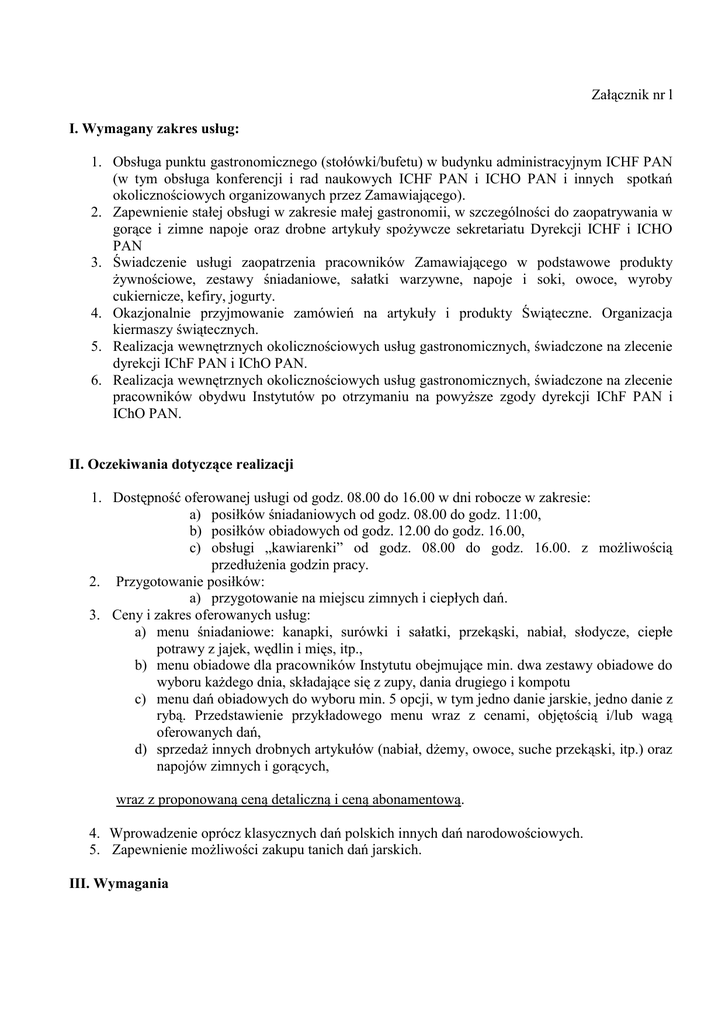 Załącznik nr l I. Wymagany zakres usług: 1. Obsługa punktu gastronomicznego (stołówki/bufetu) w budynku administracyjnym ICHF PAN (w tym obsługa konferencji i rad naukowych ICHF PAN i ICHO PAN i innych spotkań okolicznościowych organizowanych przez Zamawiającego). 2. Zapewnienie stałej obsługi w zakresie małej gastronomii, w szczególności do zaopatrywania w gorące i zimne napoje oraz drobne artykuły spożywcze sekretariatu Dyrekcji ICHF i ICHO PAN 3. Świadczenie usługi zaopatrzenia pracowników Zamawiającego w podstawowe produkty żywnościowe, zestawy śniadaniowe, sałatki warzywne, napoje i soki, owoce, wyroby cukiernicze, kefiry, jogurty. 4. Okazjonalnie przyjmowanie zamówień na artykuły i produkty Świąteczne. Organizacja kiermaszy świątecznych. 5. Realizacja wewnętrznych okolicznościowych usług gastronomicznych, świadczone na zlecenie dyrekcji IChF PAN i IChO PAN. 6. Realizacja wewnętrznych okolicznościowych usług gastronomicznych, świadczone na zlecenie pracowników obydwu Instytutów po otrzymaniu na powyższe zgody dyrekcji IChF PAN i IChO PAN. II. Oczekiwania dotyczące realizacji 1. Dostępność oferowanej usługi od godz. 08.00 do 16.00 w dni robocze w zakresie: a) posiłków śniadaniowych od godz. 08.00 do godz. 11:00, b) posiłków obiadowych od godz. 12.00 do godz. 16.00, c) obsługi „kawiarenki” od godz. 08.00 do godz. 16.00. z możliwością przedłużenia godzin pracy. 2. Przygotowanie posiłków: a) przygotowanie na miejscu zimnych i ciepłych dań. 3. Ceny i zakres oferowanych usług: a) menu śniadaniowe: kanapki, surówki i sałatki, przekąski, nabiał, słodycze, ciepłe potrawy z jajek, wędlin i mięs, itp., b) menu obiadowe dla pracowników Instytutu obejmujące min. dwa zestawy obiadowe do wyboru każdego dnia, składające się z zupy, dania drugiego i kompotu c) menu dań obiadowych do wyboru min. 5 opcji, w tym jedno danie jarskie, jedno danie z rybą. Przedstawienie przykładowego menu wraz z cenami, objętością i/lub wagą oferowanych dań, d) sprzedaż innych drobnych artykułów (nabiał, dżemy, owoce, suche przekąski, itp.) oraz napojów zimnych i gorących, wraz z proponowaną ceną detaliczną i ceną abonamentową. 4. Wprowadzenie oprócz klasycznych dań polskich innych dań narodowościowych. 5. Zapewnienie możliwości zakupu tanich dań jarskich. III. Wymagania 1. Usługi gastronomiczne powinny być świadczone zgodnie z polskimi normami określającymi reżimy sanitarne i technologiczne obowiązujące dla tego typu działalności. 2. Przygotowywanie posiłków w systemie HACAP. 3. Zapewnienie po wcześniejszym ustaleniu z dyrekcją Instytutów obsługi konferencji i narad organizowanych w dni wolne od pracy. 4. Dostępność usługi dla klientów nie będących pracownikami IChF i IChO PAN w godzinach 816 w dni robocze. 5. System dystrybucji gwarantujący odpowiednia temperaturę wydawanych posiłków. 6. Ubezpieczenie z tytułu produktu, obejmujące zatrucia pokarmowe. 7. Projekt technologiczny, modernizację (remont), aranżację i wyposażenie pomieszczeń punktu gastronomicznego (wraz z zapleczem) należy uzgodnić z Zamawiającym. 8. Wyposażenie techniczne zaplecza punktu gastronomicznego w urządzenia do obróbki, przechowalnictwa, wydawania oraz utrzymania higieny na koszt Ajenta. 9. Zatwierdzenie przez Sanepid projektu technologicznego stołówki/bufetu - po stronie Ajenta. (czy reguluje to K.C. czy też musimy to zostawić w niniejszym zapytaniu konkursowym?) IV. Informacje ogólne 1. Na terenie obydwu instytutów pracuje stale ok. 450 osób. Są to pracownicy ICHF i ICHO PAN oraz firm współpracujących z obydwoma Instytutami. 2. Budynek administracyjny IChF PAN jest budynkiem dwukondygnacyjnym. Pomieszczenia stołówki ulokowane są na poziomie zerowym. 3. Minimalny termin trwania umowy - ...... lata. 4. Możliwość wypowiedzenia umowy w trybie trzymiesięcznym (czy reguluje to K.C. czy każda umowa indywidualnie, oraz czy taki zapis jest możliwy i czy należy umieścić informację o np. krótszym okresie wypowiedzenia w przypadku np. rażących zaniedbań, braku płatności za media). 5. Odpłatność za media po stronie Ajenta bufetu: energia elektryczna, gaz, woda, kanalizacja, koszty wywozu nieczystości, telefon. 6. Wynajęcie przyszłemu Ajentowi pomieszczeń punktu gastronomicznego (w tym stołówki, bufetu i zaplecza gastronomicznego) o pow. max. 260 m2 według stawki min. ..... zł za 1 m2. V. Dodatkowe informacje 1. Ajent może korzystać z pomieszczeń zaplecza kuchni po godzinach pracy Instytutu. 2. Preferowany system podawania posiłków umożliwiający ich obejrzenie. 3. Akceptowany system obsługi: stoliki bez obrusów, samoobsługa. 4. Preferowany krótki okres prac remontowo-adaptacyjnych. 5. Zamawiający dopuszcza obsługę Instytutu na zasadach cateringowych, w okresie wykonywania prac remontowo-adaptacyjnych, do czasu uruchomienia stołówki/bufetu. 6. Zamawiający nie dopuszcza możliwości korzystania przez klientów stołówki/bufetu z naczyń i sztućców jednorazowych.