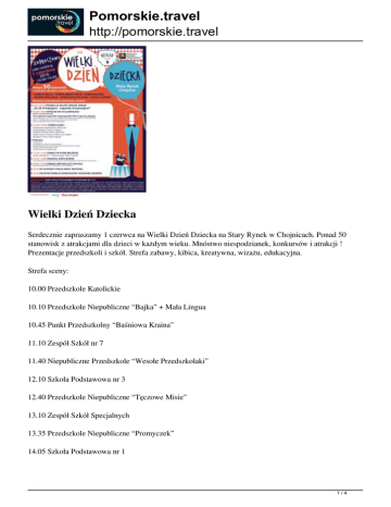 Pomorskie.travel http://pomorskie.travel Wielki Dzień Dziecka Serdecznie zapraszamy 1 czerwca na Wielki Dzień Dziecka na Stary Rynek w Chojnicach. Ponad 50 stanowisk z atrakcjami dla dzieci w każdym wieku. Mnóstwo niespodzianek, konkursów i atrakcji ! Prezentacje przedszkoli i szkół. Strefa zabawy, kibica, kreatywna, wizażu, edukacyjna. Strefa sceny: 10.00 Przedszkole Katolickie 10.10 Przedszkole Niepubliczne “Bajka” + Mała Lingua 10.45 Punkt Przedszkolny “Baśniowa Kraina” 11.10 Zespół Szkół nr 7 11.40 Niepubliczne Przedszkole “Wesołe Przedszkolaki” 12.10 Szkoła Podstawowa nr 3 12.40 Przedszkole Niepubliczne “Tęczowe Misie” 13.10 Zespół Szkół Specjalnych 13.35 Przedszkole Niepubliczne “Promyczek” 14.05 Szkoła Podstawowa nr 1 1/4 Pomorskie.travel http://pomorskie.travel 14.35 Chojnickie Centrum Kultury 15.10 Międzyszkolny Uczniowski Klub Karate Shotokan z Chojnic 15.20 Poleska Zorka 15.50 Studio Tańca i Fitnessu “Move Your Body” 16.20 Jumping Frog 16.30 Policja — pokaz tresury psów 16.45 Akademia Tańca “Piętro Wyżej” 17.15 Jumping Frog 17.30 MKS Chojniczanka 1930, Chojnicki Klub Żeglarski 18.00 Pokaz Mody Mayoral 18.30 Rostrzygnięcie konkursów i rozdanie nagród. 8.00- 20.00 Promocja w sklepie Resler Junior „Za 30 zł kupujesz - nagrodę otrzymujesz!” 16.00- 18.00 - Wyścigi na hulajnogach Do wygrania hulajnoga Mini Micro Sporty Lollipop! Zapraszamy dzieci od 3 do 12 lat z opiekunem. Możliwość skorzystania z hulajnóg Micro. Dzieci biorące udział w zabawie są dzielone na trójki wg wieku i każdy staje na podium. Zapisy: na http://www.fb.com/reslerjunior, w sklepie Resler Junior, pod numerem tel. 52 397-99-81 lub przed zawodami w godz. 10.00-15.00 w strefie kibica Od 15.30 przy torze wyścigowym- wydawanie numerów startowych i podpisywanie przez opiekuna zgody na uczestnictwo Strefa kibica - wymień się kartami piłkarskimi - weź udział w konkursach z nagrodami - zagraj w piłkarzyki - spotkaj się i zdobądź autograf piłkarza Chojniczanki w godzinach 17.00-18.00 będą z nami: Piotr 2/4 Pomorskie.travel http://pomorskie.travel Kieruzel,Tomasz Mikołajczak i Daniel Feruga Strefa kreatywna - koloruj, wycinaj, maluj, klej - weź udział w warsztatach kreatywnych DpCraft, twórz motyle, lody na wafelku, laleczki i pocztówki - udekoruj i wystylizuj figurkę AmiGami Strefa wizażu: - kolorowe tatuaże - malowanie twarzy - salon fryzur Strefa malucha: - buduj z klocków Lego Duplo - złap rybkę na wędkę - pobaw się zabawkami do wody - czeka na Was zjeżdżalnia i domek ogrodowy oraz świetna zabawa z ciastoliną Play-Doh - spotkaj Myszkę Mickey, Minnie i ich przyjaciół (od godz. 15.00) Strefa malucha pod okiem profesjonalnej opiekunki dziecięcej z Medycznej Szkoły Policealnej w Chojnicach Strefa zabawy: - wypróbuj tory z automagnesiakami Hot Wheels - wypuść z nami magiczne bańki mydlane - buduj zamki z kinetycznego piasku - wypróbuj najnowsze edycje zabawek z różnych firm - Jumping Frog – zabawa na trampolinach Strefa edukacyjno-poznawcza: 3/4 Pomorskie.travel http://pomorskie.travel Klub Miłośników Kostki Rubika i Gier Logicznych zaprasza na "Zabawy z głową. Bawimy się i myślimy" poznaj Ulicę Pokątną, czyli CENTRUM JĘZYKA ANGIELSKIEGO HELEN DORON oraz PROJEKT ROBOT i uratuj pszczoły z Helen Doron w projekcie "Bee or not to be"! popracuj i zabaw się z Warsztatami Terapii Zajęciowej i Ośrodkiem Profilaktyki Rodzinnej zabaw się ze szkołą języka angielskiego Mała Lingua poznaj sprzęt żeglarski i zawodników Chojnickiego Klubu Żeglarskiego zapoznaj się ze Strażą Miejską, poznaj policyjne radiowozy i strażackie wozy zobacz co oferuje Szkoła Podstawowa nr 3 naucz się segregować śmieci z Zakładem Zagospodarowania Odpadów 13.00 - 17.00 zobacz w Fosie Miejskiej sprzęt wojskowy 11. Mazurskiego Pułku Artylerii 14.00 – 16.00 oznakuj swój rower dzięki firmie pana Tomasza Kierskiego. Uwaga ! przy znakowaniu konieczna jest obecność osoby pełnoletniej z dokumentem tożsamości. 14.00 – 19.00 Atrakcja z Chojnickiego Automobilklubu – jeep Willys z załogą ! Organizatorzy: Resler Junior, Promocja Regionu Chojnickiego Sp. z o.o. Partnerzy: Chojnickie Centrum Kultury, Gminny Ośrodek Kultury, Urząd Miejski Chojnice, Elita s.c., Zakłady Mięsne "Skiba",Centrum Zabaw "Świat Mai" , Komenda Powiatowa Policji, Straż Miejska, Centrum Park Chojnice, Chojnicki Klub Żeglarski, Rowery Tomasz Kierski, 40 Drużyna Harcerska przy Szkole Podstawowej nr 3, Księgarnia Matras Chojnice, Zakład Zagospodarowania Odpadów, Eksperymentarium, Centrum Edukacyjno-Wdrożeniowe, Ośrodek Profilaktyki Rodzinnej, MKS "Chojniczanka 1930", Zakład Produkcji Materiałów Budowlanych GINTER, Warsztaty Terapii Zajęciowej, Wodnik Barbara i Krzysztof Ringwelscy Sp.j., Hurtowy Handel Spożywczy Sp. z o.o., Polipol Meble Polska Chojnice, Gwiździel Okręgowa Stacja Kontroli Pojazdów, Firma Meblik Sp. z o.o., Ulica Pokątna CENTRUM JĘZYKA ANGIELSKIEGO HELEN DORON oraz PROJEKT ROBOT, GEOFOSA Adrian Szczepański, Laboratorium Analityczne GUTLAB, Spółdzielcza Mleczarnia Spomlek, "Piotrex" Michał Piotrowski, Medyczno-Społeczny Zespół Szkół Policealnych, Zespół Szkół Ponadgimnazjalnych nr 2, Automobilklub Chojnicki, Jumping Frog Chojnice, 11 Pułk Artylerii w Węgorzewie, Międzyszkolny Uczniowski Klub Karate Shotokan z Chojnic, Klub Miłośników Kostki Rubika i Gier Logicznych, Mała Lingua, Państwowa Straż Pożarna Patronat medialny: Radio Weekend, Czas Chojnic. . Katarzyna Lenczewska 4/4 Powered by TCPDF (www.tcpdf.org)