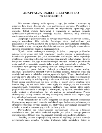 ADAPTACJA DZIECI 3-LETNICH DO PRZEDSZKOLA Nie zawsze zdajemy sobie sprawę z tego, jak ważne i znaczące są pierwsze lata życia dziecka dla jego późniejszego rozwoju. Prawidłowe i fachowe kierowanie dzieckiem pozwala na odpowiednią stymulację jego rozwoju. Takiej właśnie fachowości i wspierania w trudnym procesie dydaktyczno-wychowawczym oczekują rodzice. Pierwszą taką placówką wspierającą rodziców jest przedszkole. Adaptacja to przystosowanie do nowego środowiska, do nowych sytuacji, nowych warunków. Dla dziecka 3-letniego takim środowiskiem jest przedszkole, w którym zdobywa ono swoje pierwsze doświadczenia społeczne. Niezmiernie ważną rzeczą jest, aby doświadczenia te przebiegały w atmosferze spokoju, zrozumienia i poczucia bezpieczeństwa. Wyniki badań naukowych wskazują, iż jedną z przyczyn problemów adaptacyjnych dzieci jest brak współpracy między rodziną a przedszkolem. Przedszkole pojmowane jest jako środowisko edukacyjne, które stymuluje możliwości rozwojowe dziecka, wspomaga jego rozwój indywidualny i tworzy korzystne warunki dla jego wszechstronnego rozwoju. Jednakże przedszkole może spełnić te wszystkie warunki tylko wtedy, gdy współdziała z rodziną. Ta współpraca wymaga więc wzajemnej korelacji i zaangażowania obu stron. Rozpoczęci przez dziecko edukacji przedszkolnej to bardzo ważny, znaczący i przełomowy moment w życiu każdego dziecka, ponieważ wiąże się on niejednokrotnie z radykalną zmianą jego trybu życia. W tym okresie dziecko uczy się nowej dla siebie roli – roli przedszkolaka. Dzieci 3-letnie wstępujące do przedszkola różnią się miedzy sobą poziomem zdolności przystosowawczych. Część dzieci przystosowuje się dość szybko, u innych okres adaptacji trwa bardzo długo, są też takie dzieci które nigdy nie adaptują się do warunków przedszkolnych. Najczęściej powyższe problemy mają dzieci, które miały przykre doświadczenia w relacjach z dorosłymi, są lękliwe, nieśmiałe, miały mały kontakt z rówieśnikami lub ich rodzice są nadopiekuńczy. Proces aklimatyzacji zależy również od fazy rozwojowej dziecka oraz stopnia jego indywidualnych zdolności adaptacyjnych. Wiek przedszkolny to okres osiągania kolejnego stadium dojrzałości fizjologicznej organizmu i rozwoju intelektualnego, budowania podstawowych struktur osobowości, to wiek uczenia się, zdobywania doświadczeń społecznych dziecka, w tym i przystosowujących do życia w grupie. Przyglądanie się właściwościom rozwojowym dziecka 3-letniego uświadamia nam, jak wiele trudności wynika już tylko z samego procesu rozwojowego, z którym musi ono przecież poradzić sobie podczas adaptacji. Przebieg procesu adaptacji zależy zawsze od ogólnego poziomu rozwoju psychoruchowego dziecka. Poważne trudności, jakie napotykają dzieci w 2 procesie adaptacji do nowego środowiska jakim jest przedszkole, wiążą się na ogół z zagrożeniem poczucia bezpieczeństwa. Zagrożeniu temu zwykle towarzyszy lęk, niepokój przed samotnością, brak oparcia w osobach bliskich, przytłaczająca ilość nowych bodźców, niemożność sprostania trudnym sytuacjom. Adaptacja 3-latka w przedszkolu jest więc źródłem wielu stresów zarówno dla dziecka, jak i dla rodziców. 3-latek przychodząc po raz pierwszy do przedszkola, pomimo spotkania tu życzliwych mu osób odczuwa nadal silną więź emocjonalną z mamą i innymi domownikami. Nowa sytuacja staje się więc niezwykle trudna dla dziecka, gdyż po trzyletnim pobycie z mamą przychodzi moment, gdy nagle musi się z nią rozstać. Musi rozstać się z osobą, która była dla niego ostoją bezpieczeństwa, była w każdej potrzebie i na każde zawołanie. Ta nowa sytuacja, nowe warunki, nowe otoczenia budzą w dziecku niepokój, niepewność, a nawet strach. Malucha przeraża płacz innych dzieci, hałas, śmiech, głośne rozmowy. Potrzebne są mu więc pewne doświadczenia wyniesione podczas pobytu w grupie i czas, aby w pełni zaakceptować nową rzeczywistość i do niej się odpowiednio przystosować. Opierając się na dorobku fachowej literatury z zakresu adaptacji można stwierdzić, iż dziecko 3-letnie musi zaakceptować i przystosować się do: • nauczycieli i innych pracowników przedszkola, • przebywania w dużej grupie dzieci, • zupełnie nowego trybu życia, • unormowanego rozkładu dnia, • wymagań stawianych przez wychowawców w zakresie czynności samoobsługowych i wymagań związanych ze sposobem korzystania z zabawek i urządzeń będących do dyspozycji dziecka, • innej niż w rodzinie pozycji społecznej. Co robić, aby dzieci z uśmiechem przychodziły do przedszkola i czuły się tu bezpiecznie? Należy stworzyć dzieciom takie warunki, które uwzględniałyby ich wrażliwość, dobro społeczne oraz potrzeby zarówno przedszkola, jak i rodziców dziecka. A oto kilka rad dla rodziców, które pomogą zminimalizować negatywne skutki adaptacji dzieci 3-letnich do przedszkola: • nie przeciągaj pożegnania w szatni, pomóż dziecku rozebrać się, pocałuj je i wyjdź; • nie zabieraj dziecka do domu, kiedy płacze przy rozstaniu; jeśli zrobisz to choć raz, będzie wiedziało, że łzami można wszystko wymusić; • nie obiecuj: jeśli pójdziesz do przedszkola to coś dostaniesz; kiedy będziesz odbierać dziecko możesz dać mu maleńki prezent, ale nie może to być forma przekupywania; 3 kontroluj się, co mówisz. Zamiast: już możemy wracać do domu, powiedz: teraz możemy iść do domu. To niby niewielka różnica, a jednak pierwsze zdanie ma negatywny wydźwięk; • nie wymuszaj na dziecku, żeby zaraz po przyjściu do domu opowiedziało, co wydarzyło się w przedszkolu, to powoduje niepotrzebny stres; • jeśli dziecko przy pożegnaniu płacze postaraj się, żeby przez kilka dni odprowadzał je do przedszkola tata, rozstania z tatą są mniej bolesne; • pamiętaj: żegnaj i witaj swoje dziecko zawsze z uśmieche