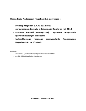 Ocena Rady Nadzorczej Magellan S.A. dotycząca : sytuacji Magellan S.A. w 2014 roku sprawozdania Zarządu z działalności Spółki za rok 2014 systemu kontroli wewnętrznej i systemu zarządzania ryzykiem istotnym dla Spółki jednostkowego rocznego sprawozdania Magellan S.A. za 2014 rok Podstawa: Zasada III 1.1) Dobrych Praktyk Spółek Notowanych na GPW art. 382 § 3 Kodeksu Spółek Handlowych Warszawa, 27 marca 2015 r. finansowego Ocena sytuacji Magellan S.A. wraz z oceną sprawozdania Zarządu z działalności Magellan S.A. (dalej: Spółka) za rok 2014 W roku 2014 Spółka kontynuowała działalność w zakresie usług finansowych, pośrednictwa finansowego oraz doradztwa dla podmiotów działających na rynku służby zdrowia i jednostek samorządu terytorialnego. W roku 2014 Spółka podpisała umowę o współpracy ze Skarbiec TFI S.A. i umowę o zarządzanie aktywami Skarbiec – Zdrowie Funduszu Inwestycyjnego Zamkniętego Aktywów Niepublicznych. Podpisane umowy i udział w zarządzaniu aktywami funduszu inwestycyjnego pozwoli Spółce w pełni wykorzystać zdobyte wieloletnie doświadczenie i znajomość rynku usług finansowych dla sektora medycznego oraz budować pozycję rynkową bez konieczności dalszego zwiększania dźwigni finansowej. Kontraktacja łącznie w roku 2014 osiągnęła wartość 1.995.087 tys. PLN i była o 171.266 tys. PLN, tj. o 9% wyższa od kontraktacji okresu porównywalnego. W roku 2014 Spółka zawarła ogółem 2.326 umów w ramach kontraktacji bilansowej o łącznej wartości 1.379.950 tys. PLN wobec 2.423 umów o wartości 1.049.856 tys. PLN zawartych w roku 2013, co oznacza wzrost o 330.094 tys. PLN, tj. o 31%. Kontraktacja pozabilansowa Spółki w roku 2014 miała wartość 615.137 tys. PLN i była niższa o 158.828 tys. PLN, tj. o 21% w stosunku do roku 2013. Zrealizowana kontraktacja bilansowa odpowiada aktywom finansowym, które w wyniku podpisanych umów ujęte zostały w aktywach Spółki w ciągu poszczególnych okresów. Natomiast kontraktację pozabilansową stanowią zawarte umowy ramowe i warunkowe dotyczące produktów oferowanych przez Spółkę, które w momencie podpisania nie podwyższają wartości aktywów Spółki. Kontraktacja jest prezentowana według wartości nominalnej wynikającej z zawartych umów. Podstawą dynamicznego wzrostu kontraktacji była szeroka oferta produktowa, wysoka aktywność sprzedażowa Spółki, wykorzystanie potencjału rynku, stabilna baza kontrahentów oraz szeroki dostęp do finansowania zewnętrznego. Działalność Spółki nastawiona jest na regularną współpracę z dotychczasowymi klientami oraz pozyskanie i budowanie relacji z nowymi kontrahentami. Niższa wartość kontraktacji pozabilansowej wynika przede wszystkim z ograniczenia w roku 2014 sprzedaży umów ramowych poręczenia -produkt jest stopniowo wygaszany i ma coraz mniejszy udział w sprzedaży realizowanej przez Spółkę. 2 Spółka prowadzi działalność na terenie kraju obejmując swoimi usługami rynek medyczny w Polsce oraz rynek usług finansowych dla jednostek samorządu terytorialnego. W dniu 20 października 2014 roku Zarząd Spółki podjął uchwałę, na mocy której został utworzony oddział Spółki w Hiszpanii, który działa pod firmą: Magellan S.A. Oddział Korporacyjny w Hiszpanii z siedzibą w Barcelonie. Przedmiotem działalności Oddziału jest prowadzenie w imieniu spółki Magellan S.A. działalności związanej ze świadczeniem usług na rzecz kontrahentów, polegających na nabywaniu bez regresu wierzytelności wobec organów administracji państwowej, zarządzaniu należnościami, wierzytelnościami oraz ochronie na wypadek niewypłacalności. Działalność Oddziału obejmuje także finansowanie sprzętu w ramach działalności handlowej. W porównaniu do stanu na koniec roku 2013 zmieniła się struktura akcjonariatu Magellan S.A., w tym Akcjonariuszy posiadających powyżej 5% w kapitale zakładowym Spółki. Zmiany wynikały zarówno z transakcji nabycia oraz zbycia akcji Spółki, jakich dokonywali Akcjonariusze, jak i z podwyższenia kapitału zakładowego Magellan S.A. W okresie sprawozdawczym Spółka otrzymała następujące informacje o zmianie zaangażowania Akcjonariuszy posiadających co najmniej 5% ogólnej liczby głosów na Walnym Zgromadzeniu Akcjonariuszy: MetLife Otwarty Fundusz Emerytalny dawniej AMPLICO OFE (zarządzany przez MetLife PTE S.A. dawniej AMPLICO PTE S.A.) – zawiadomienie o zwiększeniu dotychczas posiadanego udziału o co najmniej 2% ogólnej liczby głosów w Spółce. Zwiększenie zaangażowania nastąpiło w wyniku zakupu akcji Spółki w dniu 21 maja 2014 roku. Bezpośrednio przed zmianą udziału OFE posiadał 832.813 akcji, co stanowiło 12,63% kapitału zakładowego Spółki i uprawniało do 832.813 głosów na Walnym Zgromadzeniu, co stanowiło 12,63% ogółu głosów na Walnym Zgromadzeniu Spółki. Po zmianie udziału, na dzień zawiadomienia, MetLife OFE posiadał 841.813 akcji, co stanowiło 12,77% kapitału zakładowego Spółki i uprawniało do 841.813 głosów na Walnym Zgromadzeniu, co stanowiło 12,77% ogółu głosów na Walnym Zgromadzeniu Spółki. Klienci Pioneer Pekao Investment Management S.A. („PPIM”) – zawiadomienie o wzroście łącznego zaangażowania do poziomu 5,12% całkowitej liczby głosów na Walnym Zgromadzeniu Spółki w zakresie instrumentów finansowych wchodzących w skład portfeli zarządzanych w ramach wykonywania przez PPIM usługi zarządzania portfelem instrumentów finansowych. Zmiana stanu posiadania akcji Magellan S.A. przez wszystkich Klientów PPIM (w zakresie portfeli zarządzanych przez PPIM) nastąpiła w wyniku transakcji kupna akcji Spółki w dniu 21 maja 2014 roku. Przed nabyciem akcji wszyscy Klienci Pioneer Pekao Investment Management S.A. posiadali 312.553 akcji Spółki, 3 stanowiących 4,74% kapitału zakładowego Spółki, które uprawniały do 312.553 głosów na Walnym Zgromadzeniu Spółki i 