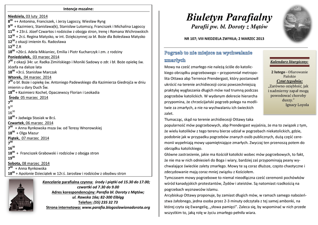 Intencje mszalne: Niedziela, 03 luty 2014 800 ++ Antonina, Franciszek, i Jerzy Lagoccy, Wiesław Ryng 930 + Kazimierz, Stanisława(k), Stanisław Lutomscy, Franciszek i Michalina Lagoccy 1100 + 23r.ś. Józef Czwartos i rodziców z obojga stron, Irenę i Romana Wichrowskich 1230 + 2r.ś. Regina Matysko, w int. Dziękczynnej za bł. Boże dla Bolesława Matysko 1230 z okazji imienin Ks. Radosława 1230 Ż.R 1800 +26r.ś. Adela Mikianiec, Emilia i Piotr Kucharczyk i zm. z rodziny Poniedziałek, 03 marzec 2014 700 z okazji 34r. ur. Radka Zimińskiego i Moniki Sadowy o zdr. i bł. Boże opiekę św. Józefa na dalsze lata 1800 +3r.ś. Stanisław Marczak Wtorek, 04 marzec 2014 700 o bł. Boże i opiekę św. Antoniego Padewskiego dla Kazimierza Giedrojća w dniu imienin u dary Duch Św. 1800 + Kazimierz Kochel, Opaczewscy Florian i Leokadia Środa 05 marzec 2014 700 930 1630 1800 + Jadwiga Stasiak w 8r.ś. Czwartek, 06 marzec 2014 700 + Anna Rynkowska msza św. od Teresy Wnorowskiej 1800 + Olga Mazur Piątek, 07 marzec 2014 700 1630 1800 + Franciszek Grabowski i rodziców z obojga stron 1900 Sobota, 08 marzec 2014 700 + Anna Rynkowska 1800 + Apolonie Dzieciątek w 12r.ś. Jarosław i rodziców z obydwu stron Kancelaria parafialna czynna: środy i piątki od 15.30 do 17.00; czwartki od 7.30 do 9.00 Adres korespondencyjny: Parafia bł. Doroty z Mątów; ul. Rawska 16a; 82-300 Elbląg Telefon: (55) 235 32 73 Strona internetowa: www.parafia.blogoslawionadorota.org Biuletyn Parafialny Parafii pw. bł. Doroty z Mątów NR 107; VIII NIEDZIELA ZWYKŁA; 2 MARZEC 2013 Kalendarz liturgiczny: Mowy na cześć zmarłego nie należą ściśle do katolic2 lutego - Ofiarowanie kiego obrządku pogrzebowego – przypomniał metropoPańskie lita Ottawa abp Terrence Prendergast, który postanowił Cytat tygodnia: ukrócić na terenie archidiecezji coraz powszechniejszą „Zarówno oziębłość, jak praktykę wygłaszania długich mów nad trumną podczas i nadmierny zapał mogą powodować choroby pogrzebów katolickich. W wydanym dekrecie hierarcha duszy.” przypomina, że chrześcijański pogrzeb polega na modliIgnacy Loyola twie za zmarłych, a nie na wychwalaniu ich świeckich zalet. Tłumacząc, skąd na terenie archidiecezji Ottawy taka popularność mów pogrzebowych, abp Prendergast wyjaśnia, że ma to związek z tym, że wielu katolików z tego terenu bierze udział w pogrzebach niekatolickich, gdzie, podobnie jak w przypadku pogrzebów znanych osób publicznych, dużą część ceremonii wypełniają mowy upamiętniające zmarłych. Zwyczaj ten przenoszą potem do obrządku katolickiego. Główne zastrzeżenie, jakie ma Kościół katolicki wobec mów pogrzebowych, to fakt, że nie ma w nich odniesień do Boga i wiary, bardziej zaś przypominają peany wychwalające świeckie zalety zmarłego. Mowy te są coraz dłuższe, często chaotyczne i zdecydowanie mają coraz mniej związku z Kościołem. Tymczasem mowy pogrzebowe to niemal nieodłączna cześć ceremonii pochówków wśród kanadyjskich protestantów, Żydów i ateistów. Są natomiast rzadkością na pogrzebach wyznawców islamu. Arcybiskup Ottawy proponuje, by zamiast długich mów, w ramach samego nabożeństwa żałobnego, jedna osoba przez 2-3 minuty odczytała z tej samej ambonki, na której czyta się Ewangelię, „słowa pamięci”. Zaleca się, by wspominać w nich przede wszystkim to, jaką rolę w życiu zmarłego pełniła wiara. Święci znani… i nie znani Święty Szymon Słupnik Szymon (Symeon) urodził się w końcu IV wieku w rodzinie pasterskiej w Sis - na pograniczu Cylicji i Syrii. Miał liczne rodzeństwo, które jednak rychło zabrała mu śmierć. Pozostał na ojcowiźnie z bratem, Samsonem. Po śmierci rodziców i brata sprzedał majątek rodzinny i rozdał ubogim pieniądze, jakie za niego otrzymał. Wstąpił do eremitów zamieszkałych w klasztorze Eusebona w Teleda koło Antiochii, ale rychło to miejsce opuścił, tęskniąc za życiem pustelniczym. Został pustelnikiem w Telanissos, gdzie żył w skrajnej ascezie. Wreszcie zamieszkał w pobliżu Antiochii Syryjskiej na zbudowanym przez siebie kamiennym słupie z małą platformą (wysokości od 10 do 60 stóp - z czasem św. Szymon zwiększał wysokość słupa), na której przebywał około 40 lat (stąd jego przydomek Słupnik). Był wielkim pokutnikiem. Pokarm ograniczał do minimum. Przed deszczem i upalnym słońcem chronił go jedynie płaszcz z kapturem. Większą część życia poświęcił modlitwie stojąc na słupie, wystawiony na wszelkie żywioły, praktycznie bez pożywienia. Wiele godzin spędzał na kontemplacji. Ta nietypowa forma surowej ascezy i modlitwy ściągała wielu przybyszów i ciekawskich, nawet spośród pogan. Teodoret wspomina, że w ten sposób Szymon nawrócił wiele tysięcy przybyszów z pogańskiej Arabii i Persji. Kolumna, na której przebywał, nieraz stawała się amboną. Szymon nauczał z niej prawd wiary, broniąc jej przeciwko nestorianom, którzy wówczas szerzyli swoje błędy, a mieli poparcie u najwyższych władz duchownych i świeckich. Przychodzono do niego po poradę, proszono o wstawiennictwo przed Panem Bogiem tak w sprawach prywatnych, jak publicznych. Miał się tu zjawić nawet sam cesarz rzymski Marcjan. Cesarz Leon I oddawał Szymonowi najwyższe pochwały. Szymon Słupnik zmarł 28 sierpnia 459 roku. Jego pogrzeb był prawdziwym triumfem. Wziął w nim udział patriarcha Antiochii, sześciu biskupów, gubernator cesarski, mnóstwo mnichów i niezliczone rzesze wiernych. Niebawem jego ciało przewieziono w uroczystej procesji z Antiochii do Konstantynopola. Na miejscu, gdzie stał słup, wybudowano świątynię, do której wędrowali pątnicy aż do XVII wieku. Później została ona zburzona przez Arabów. Dziś stoi tam ołtarz. Prawosławna hagiografia nazwała świętego Antiocheńskim w odróżnieniu od żyjącego w VI wieku św. Szymona Słupnika Młodszego. W ikonografii św. Szymon przedstaw